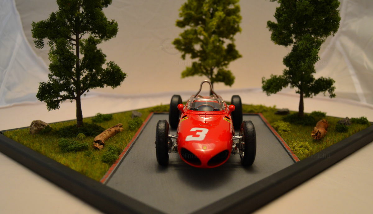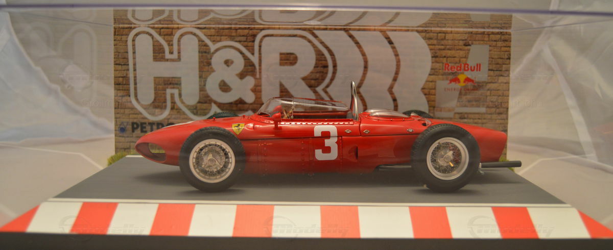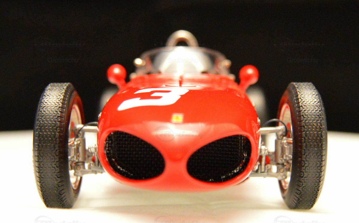 Die Lackierung des Modells zeigt die ikonische rote Farbe von Ferrari, die im Motorsport für Leidenschaft und Exzellenz steht. Die markante Form des Originals ist präzise nachgebildet, einschließlich der einzigartigen Luftöffnungen auf der Motorabdeckung und der eleganten Linienführung der Karosserie. Die Startnummer (#3) auf der Karosserie und die Ferrari-Badges an den Seiten sind originalgetreu reproduziert und tragen zur Authentizität des Modells bei. Das optische Erscheinungsbild ist eine perfekte Kombination aus historischen Referenzen und Detailgenauigkeit, was dieses Modell zu einem Muss für Liebhaber von klassischen Formel-1-Autos macht.