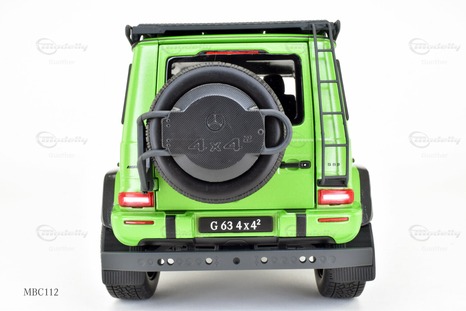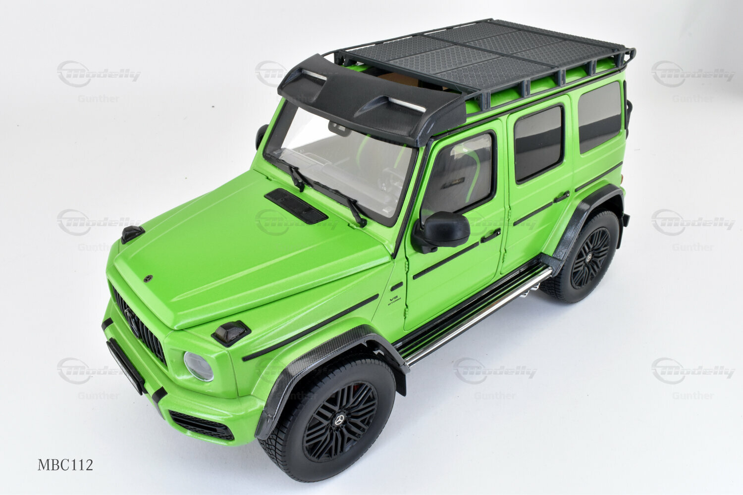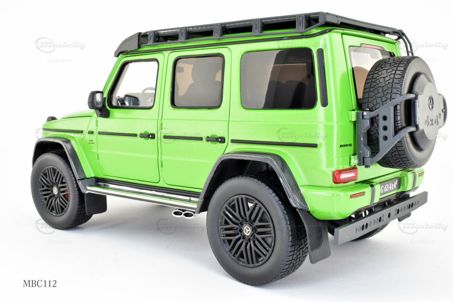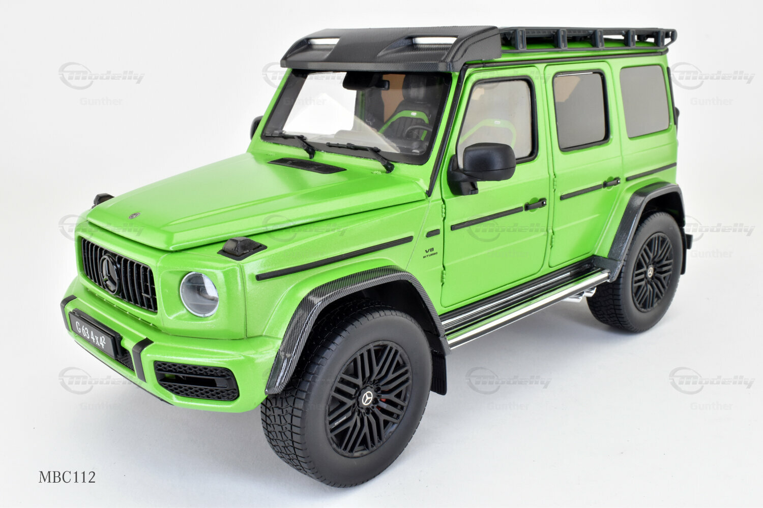 Diese 1:18 Miniatur, hergestellt von iScale Mercedes-Benz Dealer Edition, ist eine präzise Nachbildung des originale Mercedes-AMG G 63 4x4². Die Hauptmerkmale des Modells sind sorgfältig gefertigt und aus hochwertigem Material gemischt, was zu einer detaillierten und realistischen Miniatur führt. Dieses Modell ist zudem in einer limitierten Auflage von nur 1000 Stück weltweit erhältlich, was es zu einem begehrten Sammlerstück für Enthusiasten macht. Das Modell, das derzeit zur Sammlung von Modelly-Mitglied "Gunther" gehört, besticht durch seine präzise Verarbeitung und detaillierten Elemente, die den einzigartigen Charakter des Originals einfangen. Die grüne Lackierung des Modells ist besonders auffällig und hebt sich durch ihre leuchtende Farbgebung sowie den karbonähnlichen Akzenten an den Radkästen und dem Dachträger ab.