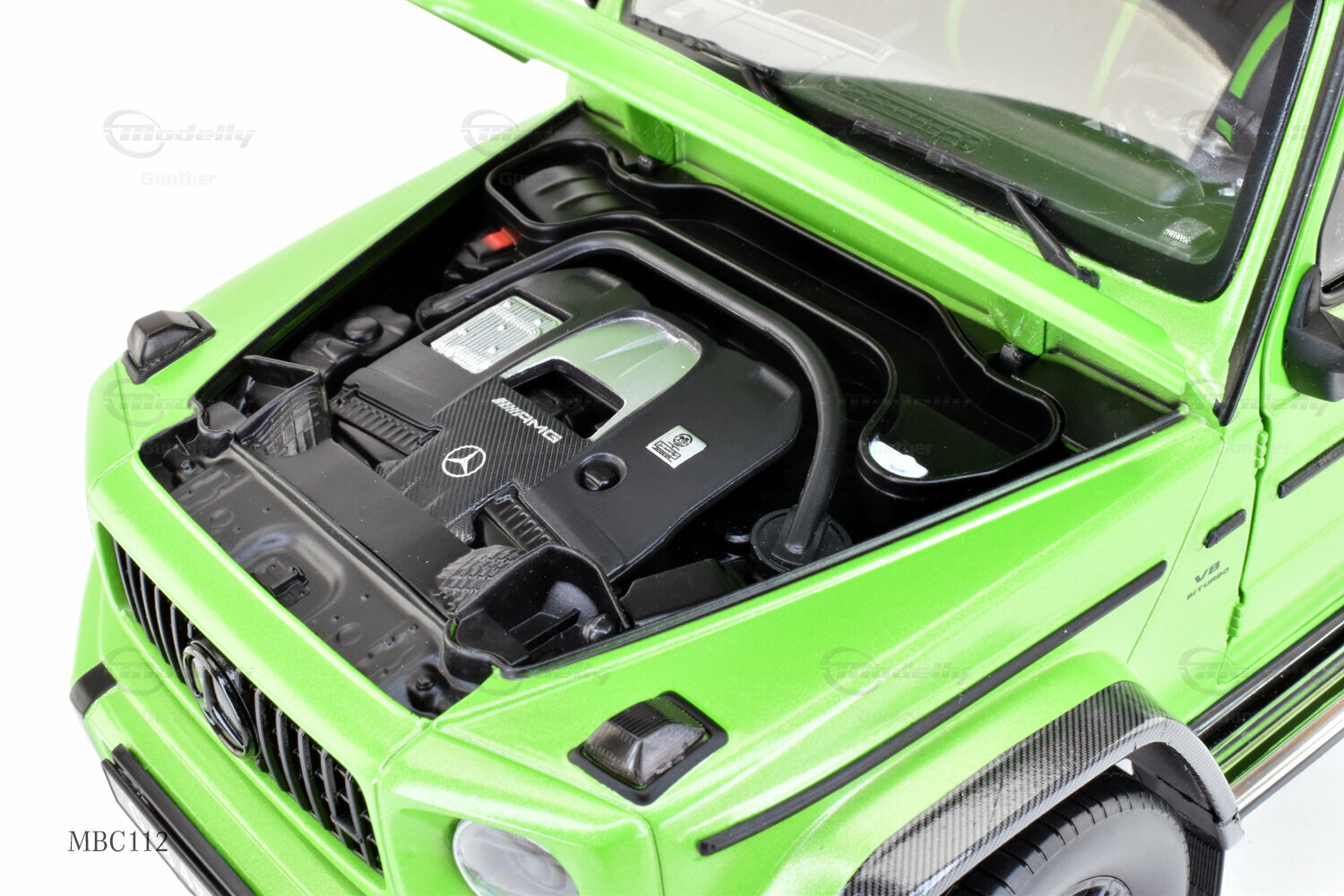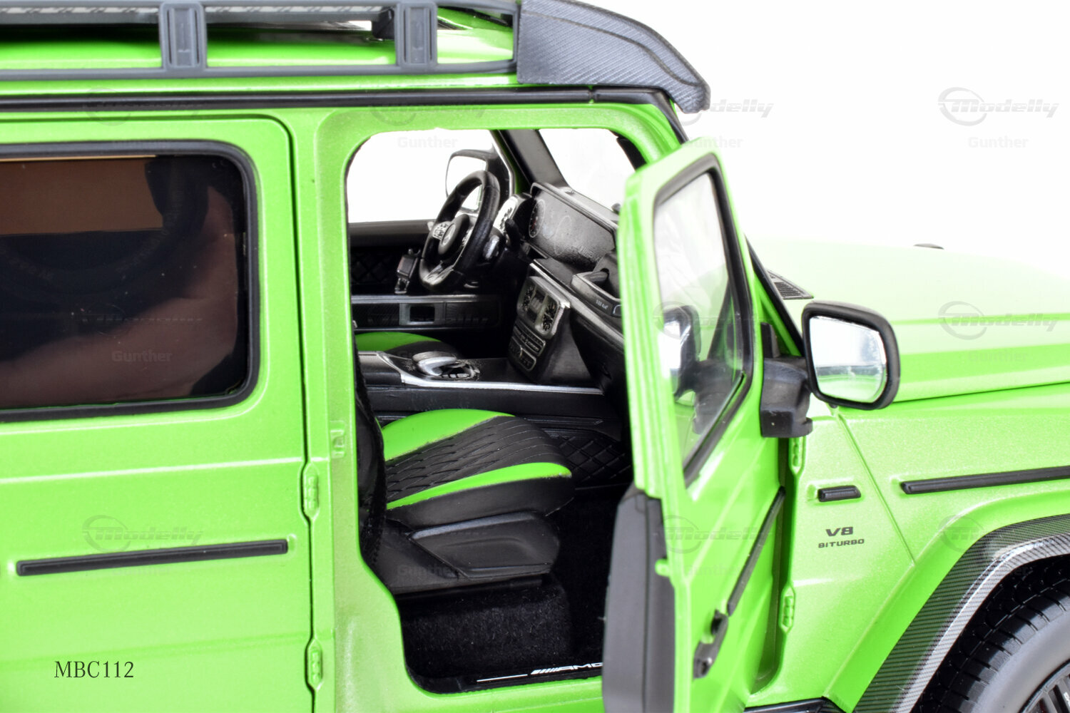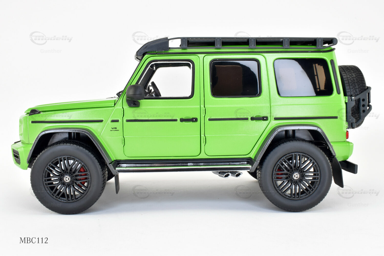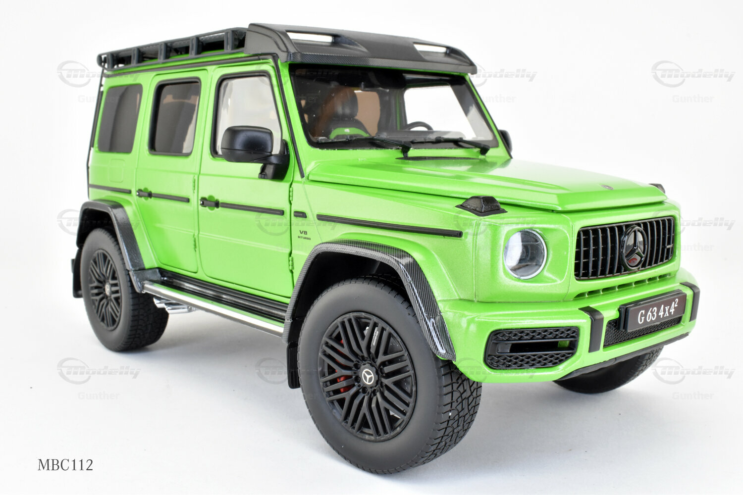 Diese 1:18 Miniatur, hergestellt von iScale Mercedes-Benz Dealer Edition, ist eine präzise Nachbildung des originale Mercedes-AMG G 63 4x4². Die Hauptmerkmale des Modells sind sorgfältig gefertigt und aus hochwertigem Material gemischt, was zu einer detaillierten und realistischen Miniatur führt. Dieses Modell ist zudem in einer limitierten Auflage von nur 1000 Stück weltweit erhältlich, was es zu einem begehrten Sammlerstück für Enthusiasten macht. Das Modell, das derzeit zur Sammlung von Modelly-Mitglied "Gunther" gehört, besticht durch seine präzise Verarbeitung und detaillierten Elemente, die den einzigartigen Charakter des Originals einfangen. Die grüne Lackierung des Modells ist besonders auffällig und hebt sich durch ihre leuchtende Farbgebung sowie den karbonähnlichen Akzenten an den Radkästen und dem Dachträger ab.