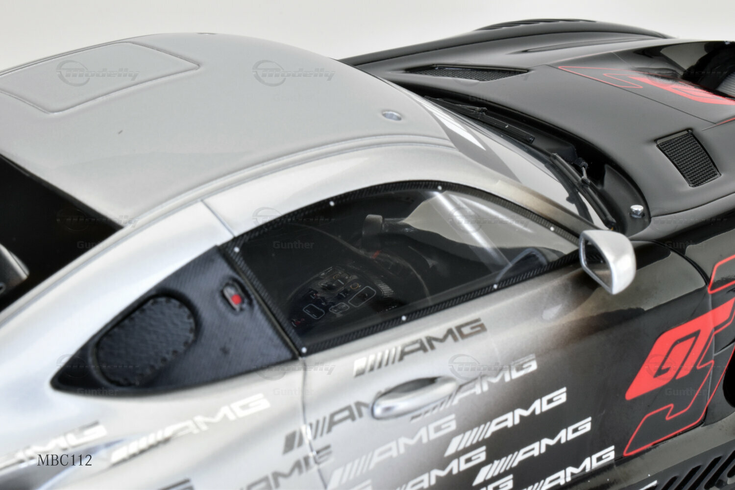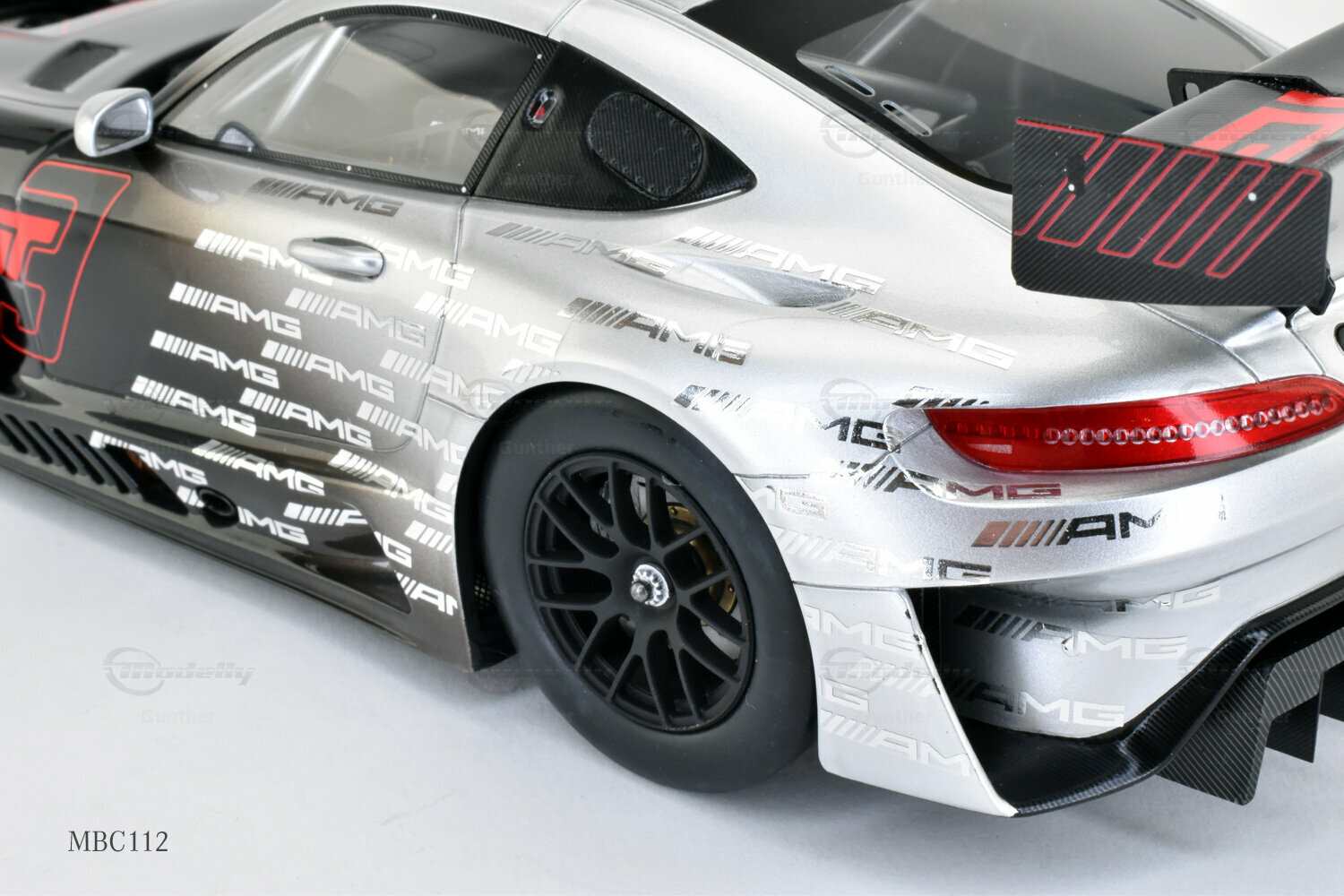 Das Modellauto in 1:18 Skala von Minimax spiegelt die wesentlichen Merkmale des Originals auf beeindruckende Weise wider. In der Sammlung von Modelly-Mitglied "Gunther" findet sich eine besonders attraktive Version mit einer auffälligen Lackierung, die aus Schwarz und Silber besteht und mit roten AMG-Logos und Grafiken verziert ist. Die Detailarbeit zeigt sich in den akkuraten Aufklebern, dem realistischen Frontgrill und den präzise nachgebildeten Scheinwerfern. Ein weiteres Highlight sind die authentischen AMG-Felgen in Schwarz, die das sportliche Erscheinungsbild des Modells komplettieren. Diese Miniaturfeinheit und Präzision machen das Modellauto zu einer erstklassigen Nachbildung des legendären Mercedes-AMG GT3, das in keiner Sammlung fehlen sollte.