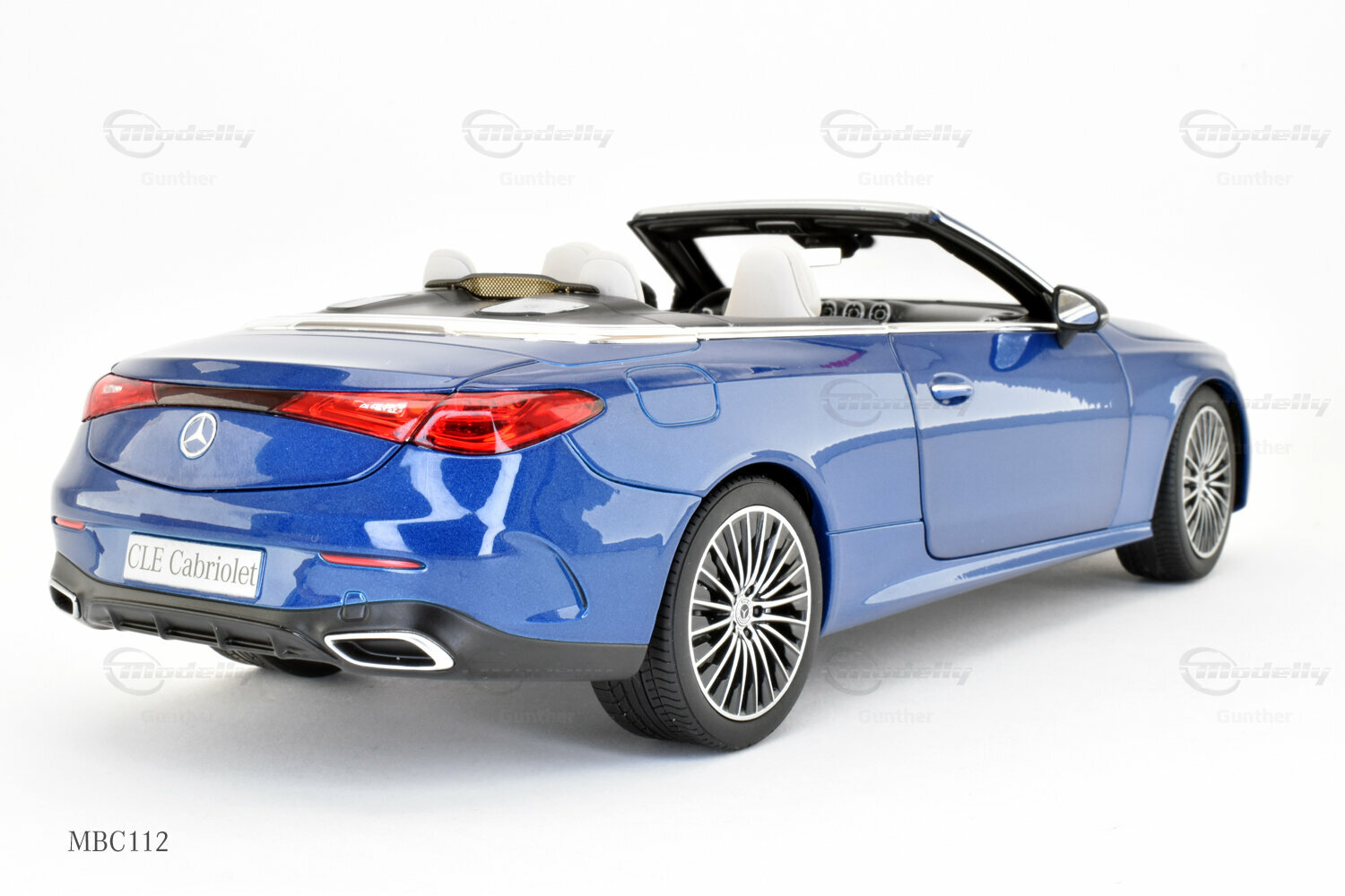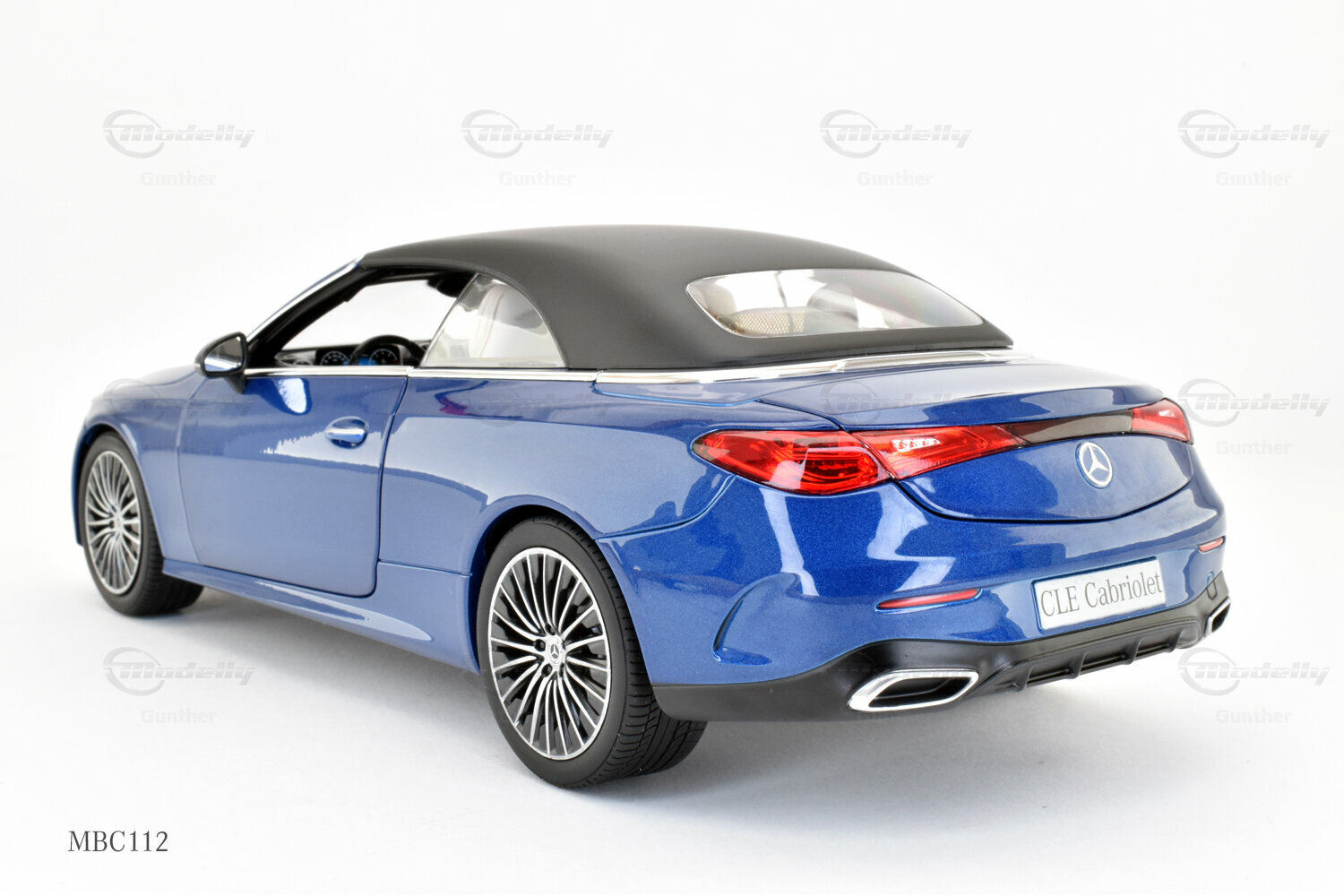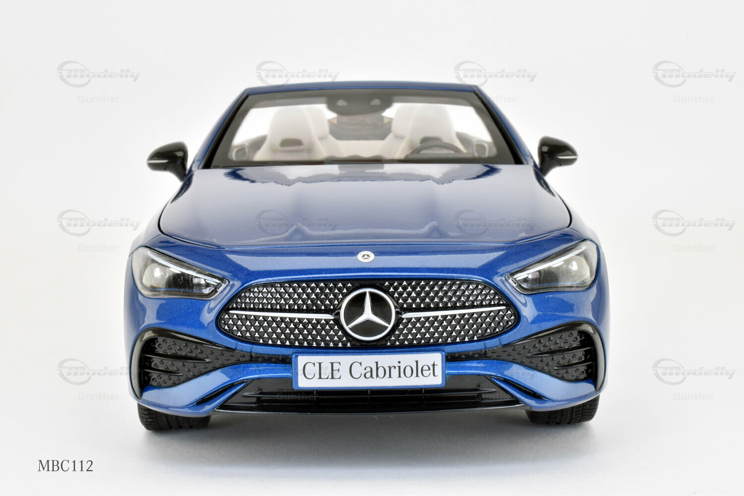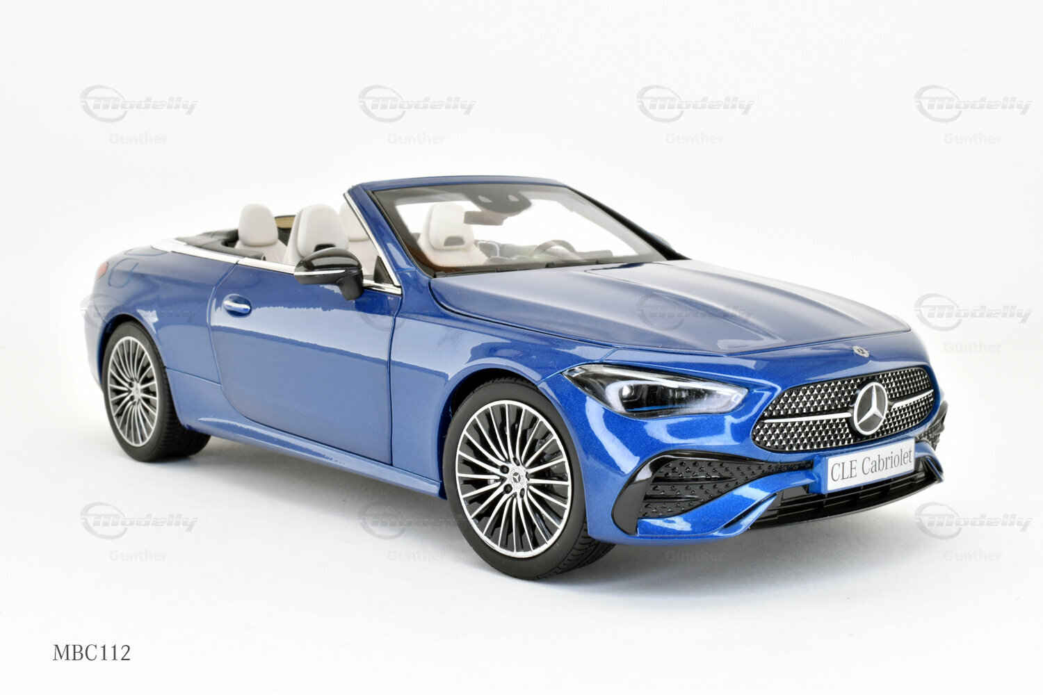 Das hier vorgestellte Modellauto im Maßstab 1:18 wurde von Norev Mercedes-Benz Dealer Edition hergestellt und zeigt eine detailgetreue Replik des Mercedes-Benz CLE Cabrio. Dieses Modell ist aus gemischtem Material gefertigt, was zur Robustheit und Genauigkeit der Nachbildung beiträgt. Die wunderschöne blaue Lackierung des Modells spiegelt den unaufdringlichen Stil des Originals wider und zeigt im Detail die sanften Kurven und Linien des Fahrzeugs. Besonders auffällig sind die präzise nachgebildeten, mehrspeichigen Felgen, die dem Modell eine sportliche Note verleihen, obwohl der Hersteller der Felgen im Maßstab nicht genau identifizierbar ist. Die exakte Nachbildung der Scheinwerfer und des markanten Kühlergrills mit dem Mercedes-Stern bieten eine authentische Anmutung des Originalfahrzeugs.