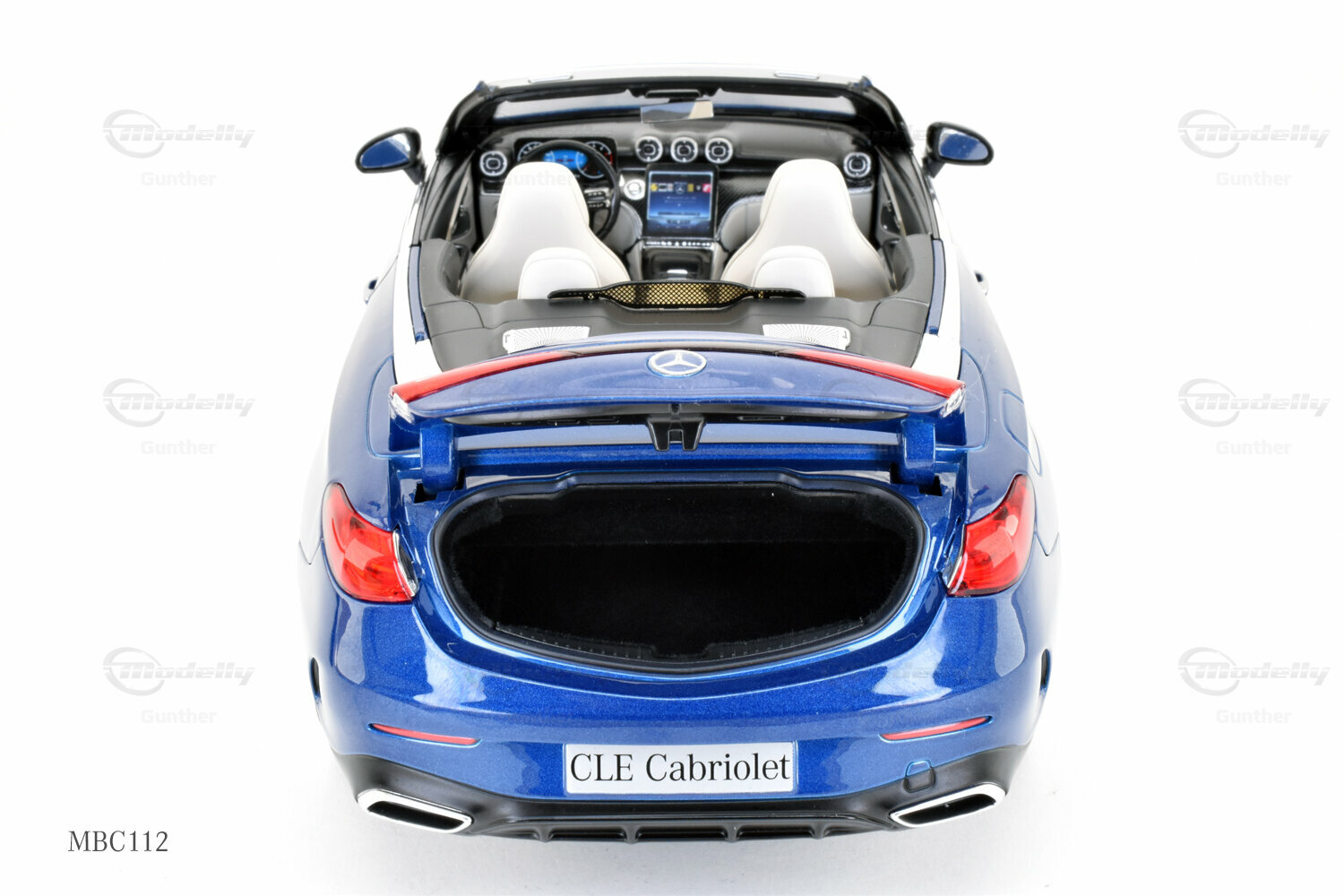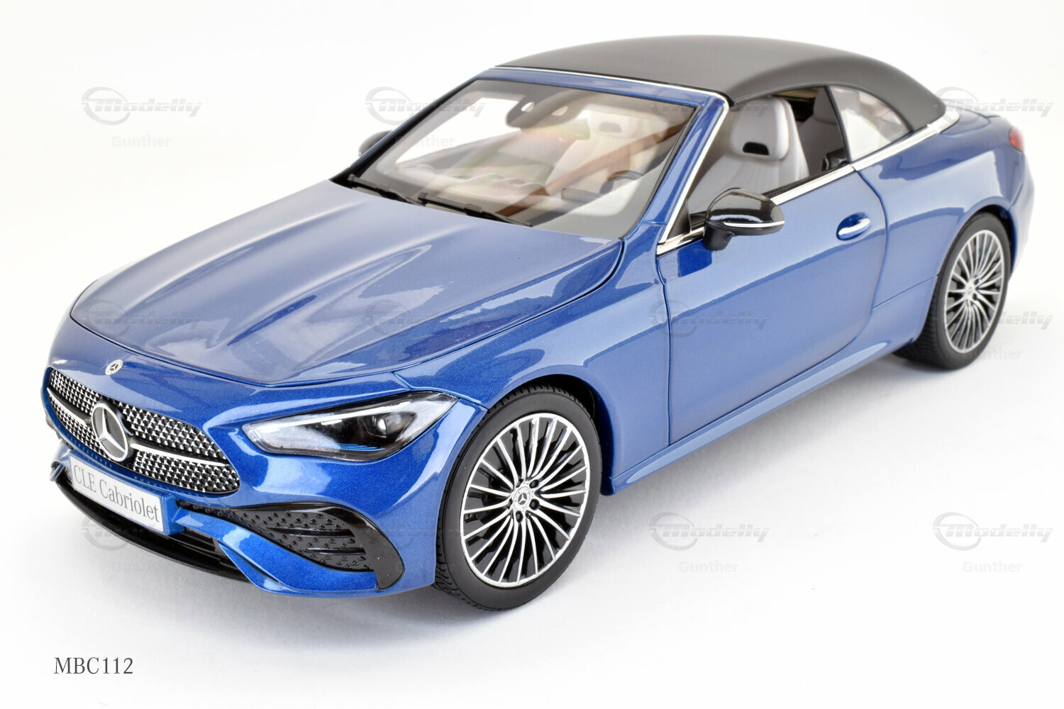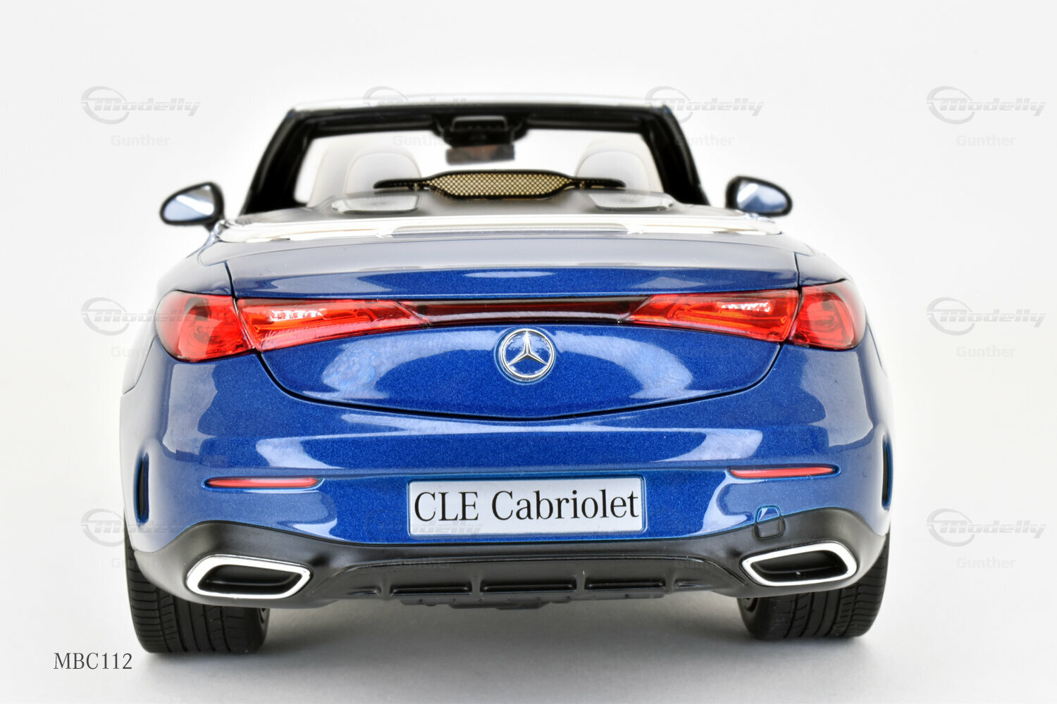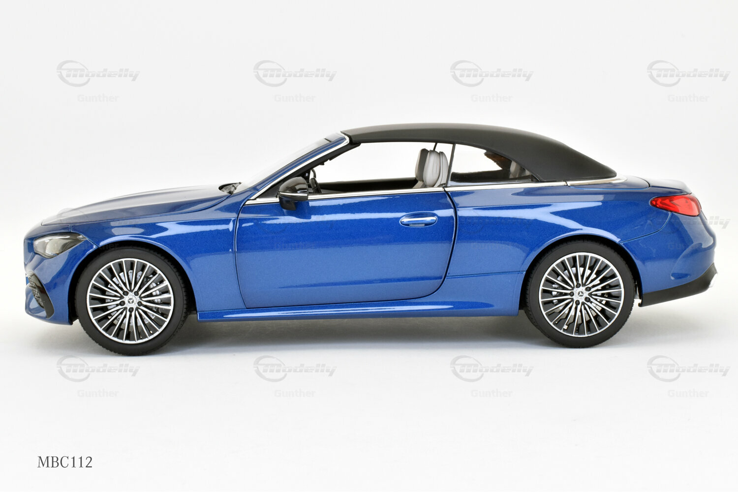 Das hier vorgestellte Modellauto im Maßstab 1:18 wurde von Norev Mercedes-Benz Dealer Edition hergestellt und zeigt eine detailgetreue Replik des Mercedes-Benz CLE Cabrio. Dieses Modell ist aus gemischtem Material gefertigt, was zur Robustheit und Genauigkeit der Nachbildung beiträgt. Die wunderschöne blaue Lackierung des Modells spiegelt den unaufdringlichen Stil des Originals wider und zeigt im Detail die sanften Kurven und Linien des Fahrzeugs. Besonders auffällig sind die präzise nachgebildeten, mehrspeichigen Felgen, die dem Modell eine sportliche Note verleihen, obwohl der Hersteller der Felgen im Maßstab nicht genau identifizierbar ist. Die exakte Nachbildung der Scheinwerfer und des markanten Kühlergrills mit dem Mercedes-Stern bieten eine authentische Anmutung des Originalfahrzeugs.