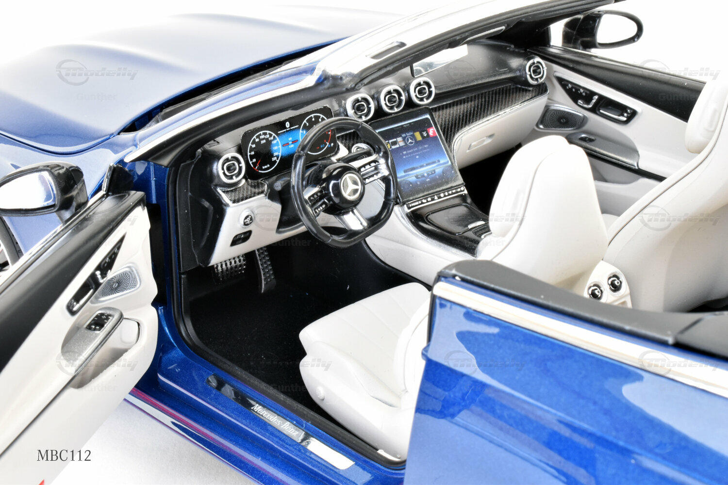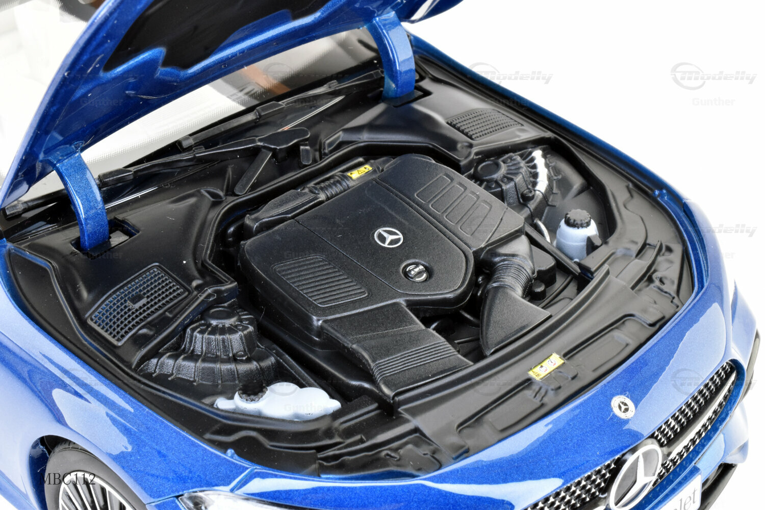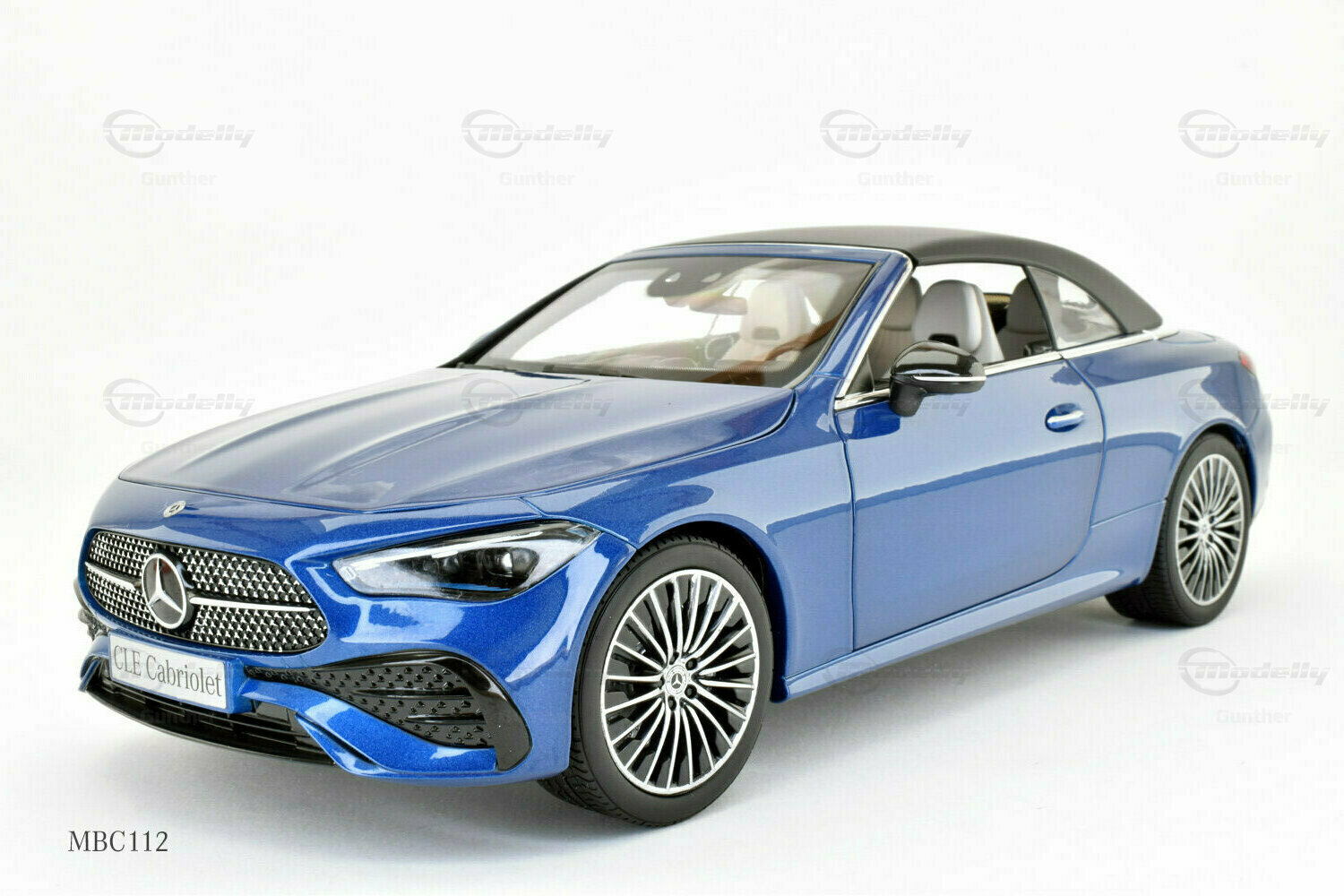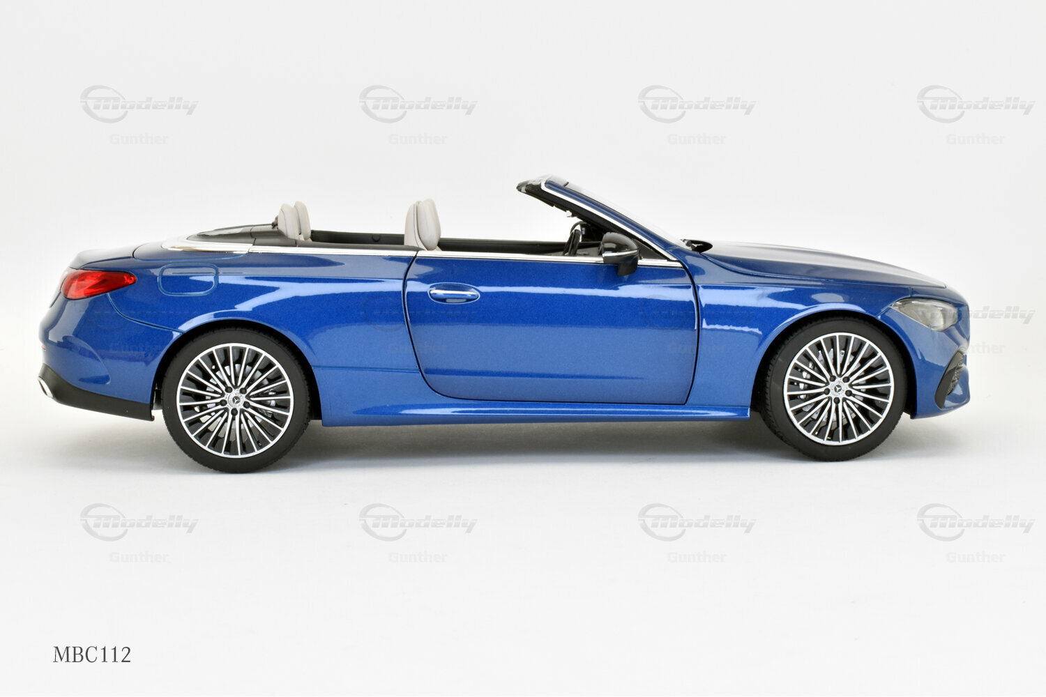 Das hier vorgestellte Modellauto im Maßstab 1:18 wurde von Norev Mercedes-Benz Dealer Edition hergestellt und zeigt eine detailgetreue Replik des Mercedes-Benz CLE Cabrio. Dieses Modell ist aus gemischtem Material gefertigt, was zur Robustheit und Genauigkeit der Nachbildung beiträgt. Die wunderschöne blaue Lackierung des Modells spiegelt den unaufdringlichen Stil des Originals wider und zeigt im Detail die sanften Kurven und Linien des Fahrzeugs. Besonders auffällig sind die präzise nachgebildeten, mehrspeichigen Felgen, die dem Modell eine sportliche Note verleihen, obwohl der Hersteller der Felgen im Maßstab nicht genau identifizierbar ist. Die exakte Nachbildung der Scheinwerfer und des markanten Kühlergrills mit dem Mercedes-Stern bieten eine authentische Anmutung des Originalfahrzeugs.