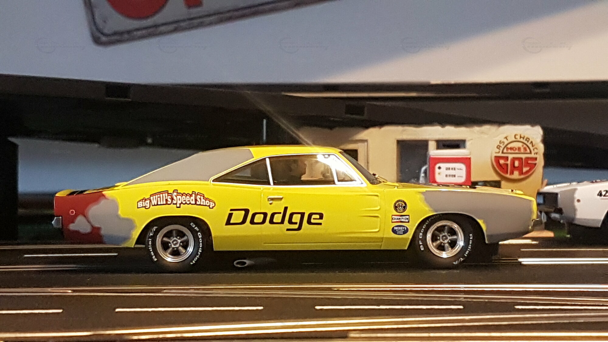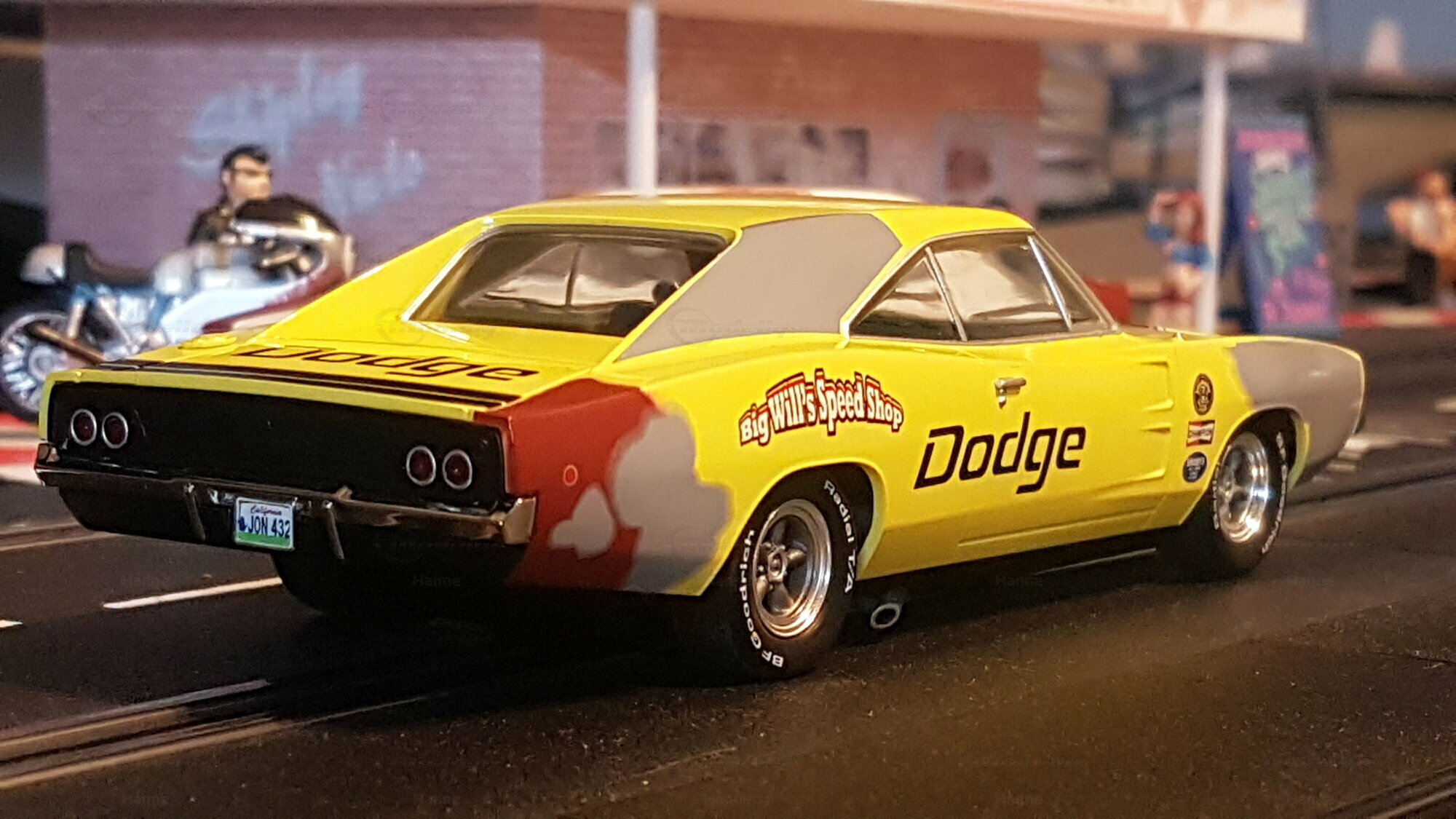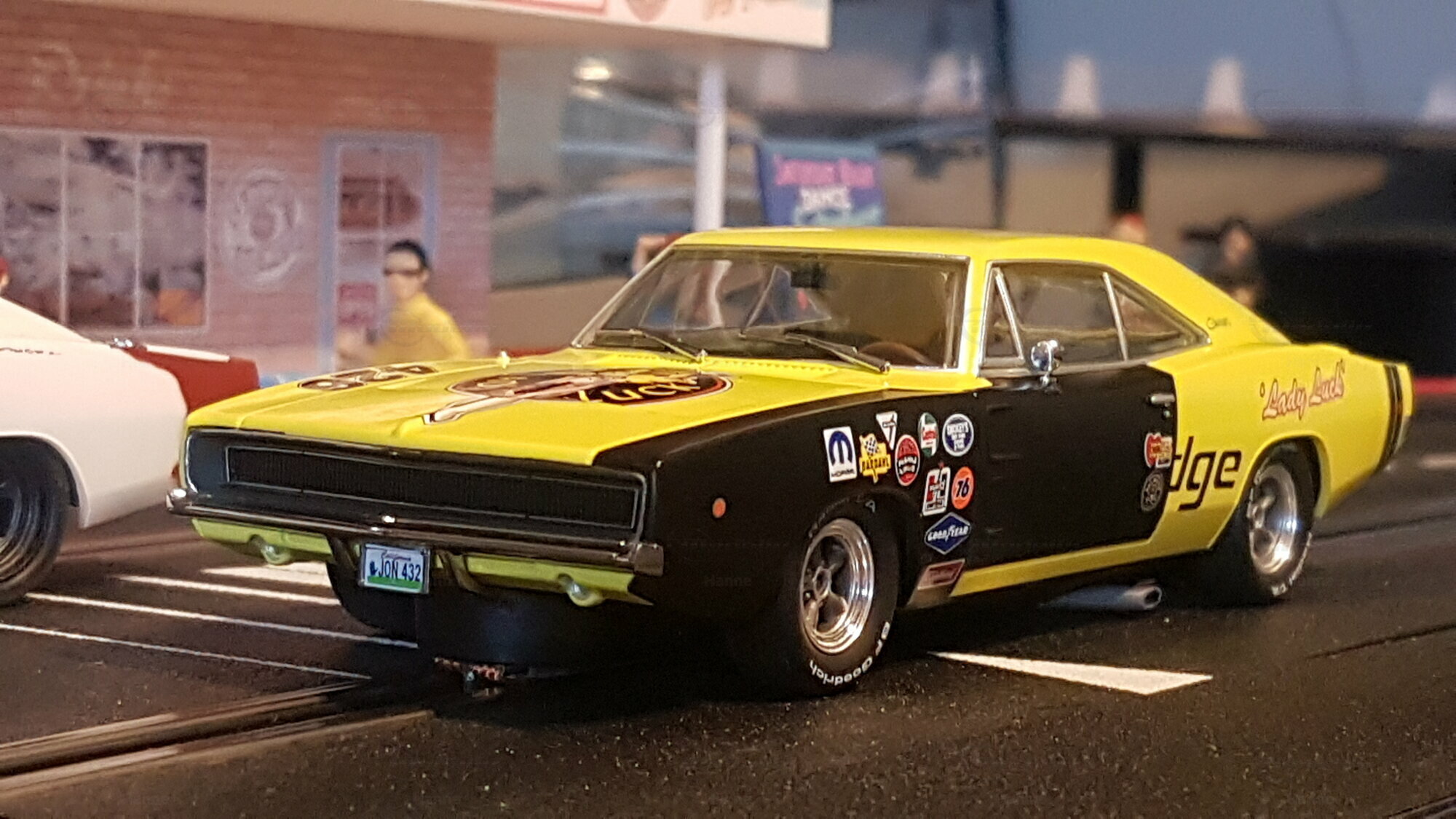 Das hier gezeigte Modell ist in einem auffälligen Gelb lackiert und kombiniert diese Farbe mit schwarzem Vinyl an den Türen und der Motorhaube. Zusätzlich sind Wörter wie „Lady Luck“ und „Big Will's Speed Shop“ auf den Seiten zu sehen, was dem Modell eine besonders individuelle und personalisierte Note verleiht. Auffällig sind auch die verschiedenen Sponsor-Aufkleber, die auf der Karosserie angebracht sind, darunter Marken wie Goodyear und Champion. Die Felgen des Modells kommen vermutlich von einem renommierten Hersteller, der sich durch hohe Qualität auszeichnet. Das Modell besitzt authentische Details wie den charakteristischen Grill, die Rückleuchten und die Seitenansicht, die den originalen Dodge Charger so unverwechselbar machen. Beachten Sie, dass dieses Modell auf den Fotos aus der Sammlung von Modelly-Mitglied „Hanne“ stammt.