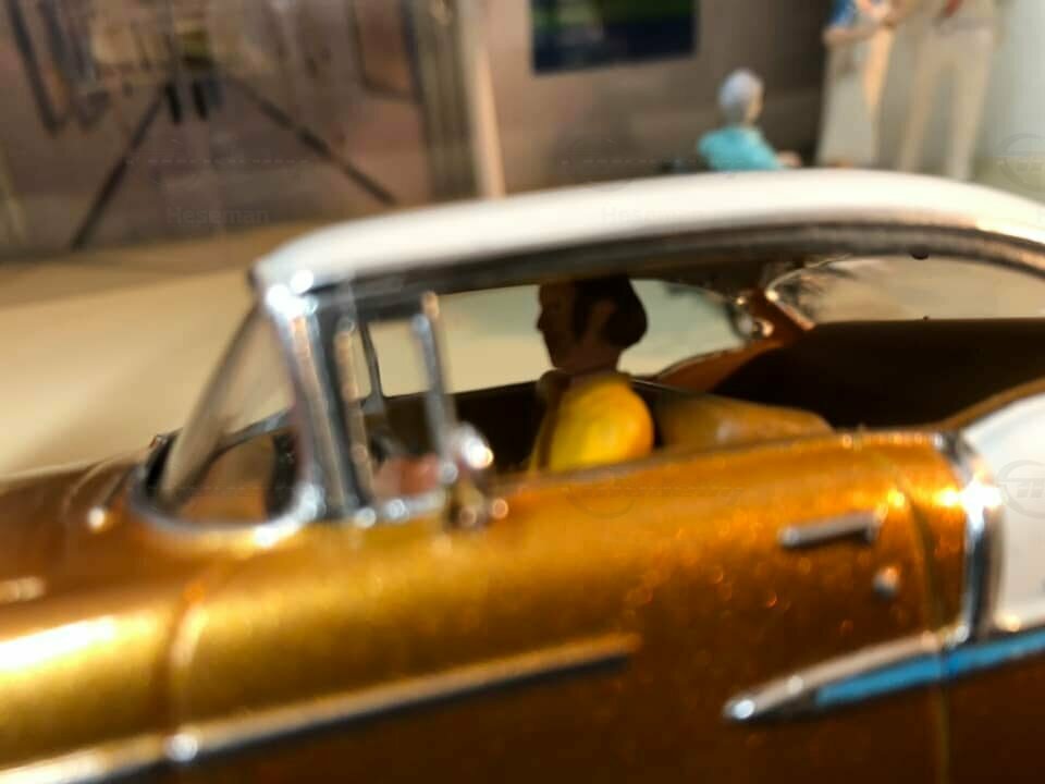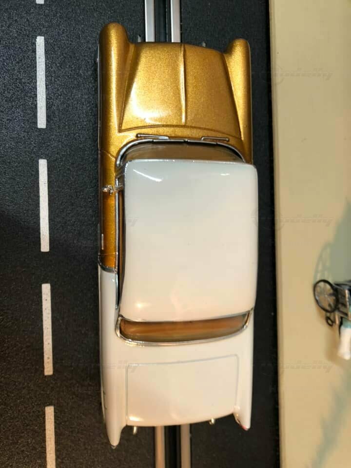 Die auffällige Lackierung dieses Miniaturmodells zieht schnell die Aufmerksamkeit auf sich. Mit einem goldenen Metallic-Glanz gepaart mit einem cremeweißen Dach stellt dieses Modell eine besondere Farbkombination dar, die an luxuriöse Zeiten vergangener Jahre erinnert. Die blauen Embleme auf den originalgetreuen Felgen geben dem Auto einen authentischen Look. Die Lackierung weist keine bekannten besonderen Muster oder Formen auf, außer das zweifarbige Design, das charakteristisch für diese Epoche war. Zudem sind kleine Details, wie Chromleisten und Türgriffe, sorgfältig nachgebildet, um dem Gesamtbild Echtheit zu verleihen.