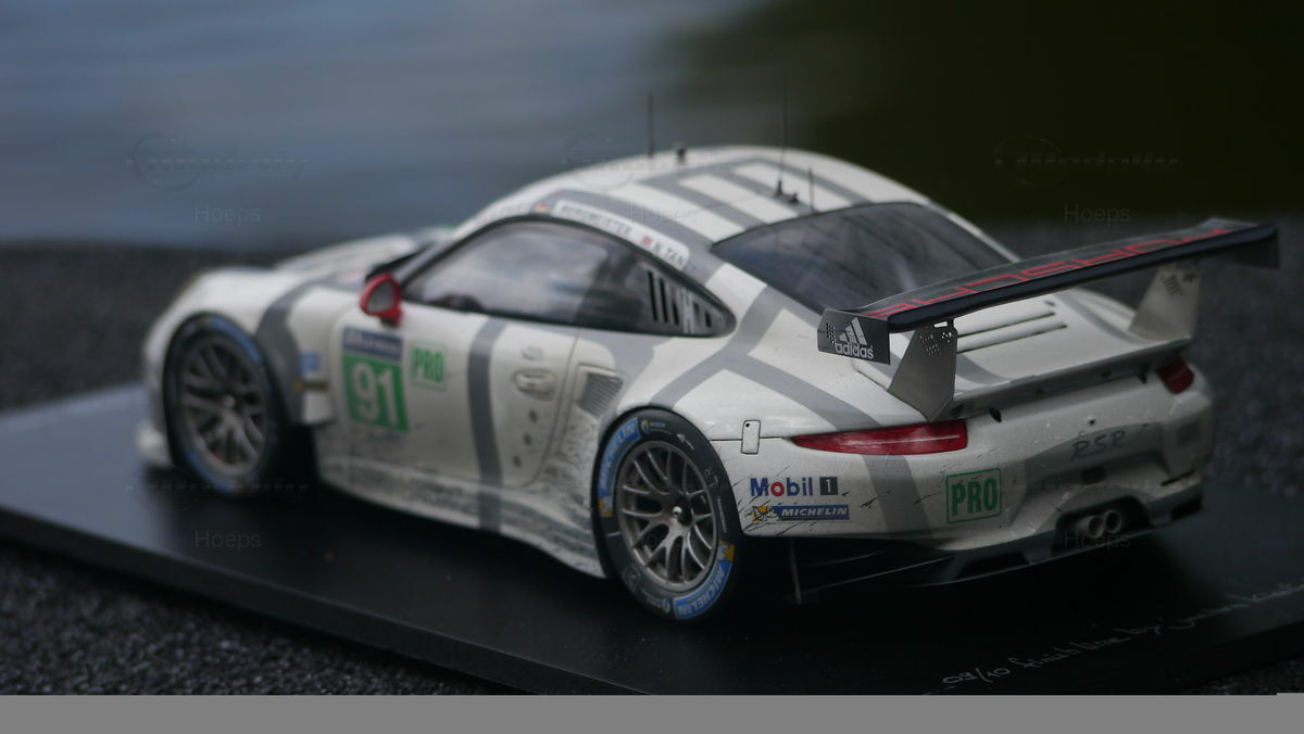Das 1:18 Modell des Porsche 911 (991) RSR spiegelt die detaillierte und auffällige Lackierung des Originalfahrzeugs wider. Die Kombination aus weißen und grauen Streifen, kontrastiert durch schwarze Akzente und rote Spiegelkappen, sorgt für ein markantes Erscheinungsbild. Die Sponsorenlogos von Mobil 1, Michelin und Adidas sind deutlich zu erkennen und verdeutlichen die Verbindung des Fahrzeugs zu seinen Partnern. Auch die Verglasung des Modells gibt realistisch die Sichtverhältnisse des echten Fahrzeugs wieder. Unabhängig vom Blickwinkel lässt das Modell die technische Klasse und das Design des Originals eindrucksvoll zur Geltung kommen. Der Spark/Cartima-Hersteller hat hier in 1:18-Maßstab eine bemerkenswerte Arbeit vollbracht, die Sammler und Fans gleichermaßen begeistern kann.