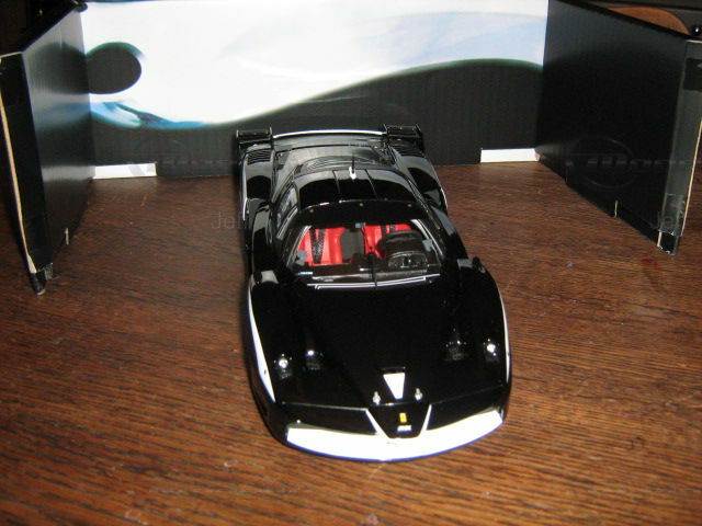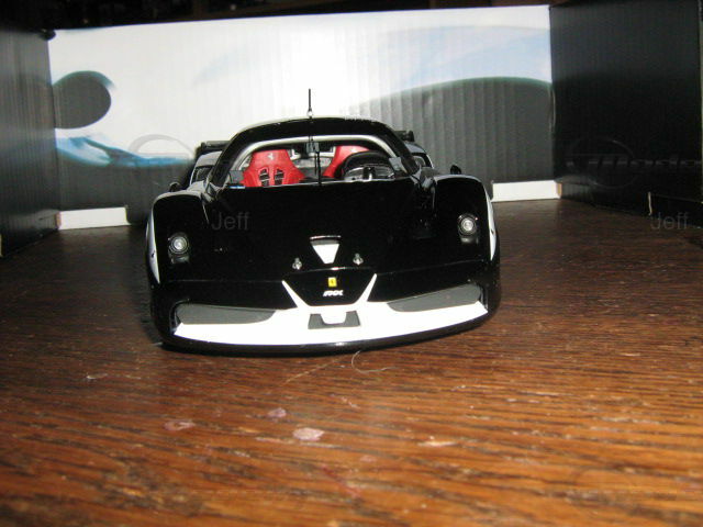 Das 1:18 Modell von Mattel zeigt den Ferrari FXX in vollen Zügen. In Jeffs Sammlung hebt sich dieses Modell nicht nur durch seine Maßstabstreue hervor, sondern auch durch seine detailreiche Nachbildung. Die Lackierung im klassischen Schwarz mit weißen Akzenten spiegelt die aggressive und dennoch elegante Erscheinung des Originals wider. Das Modellauto fängt die feinen Details ein, wie die stilisierte Form der Karosserie, die roten Akzente an den Rädern und das markante Ferrari-Emblem. Interessant ist der Heckflügel, der für die aerodynamische Stabilität bekannt ist und den Namen "FXX" trägt. Ebenfalls erwähnenswert sind die sichtbaren Sponsorenaufkleber, wie z. B. die von Michelin, die dem Modell einen authentischen Rennlook verleihen.