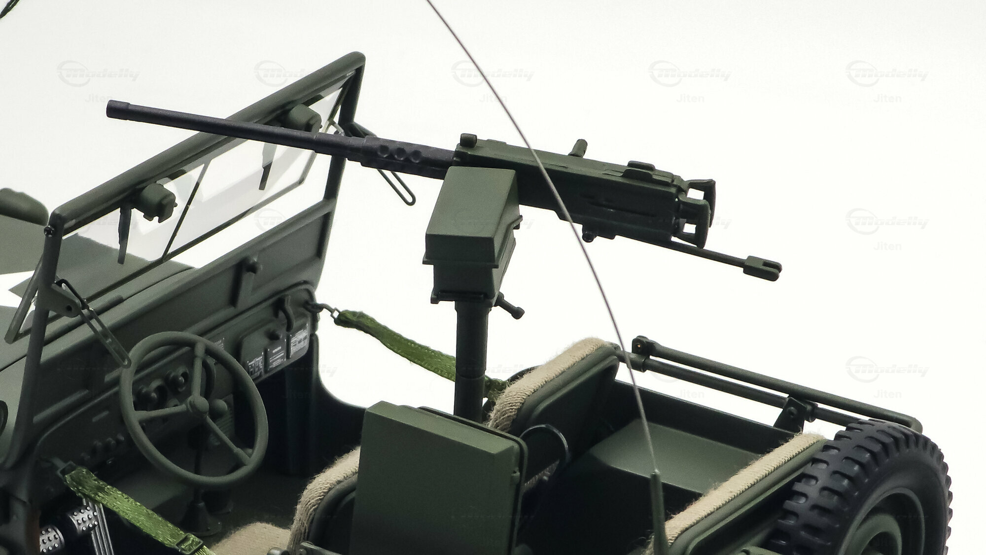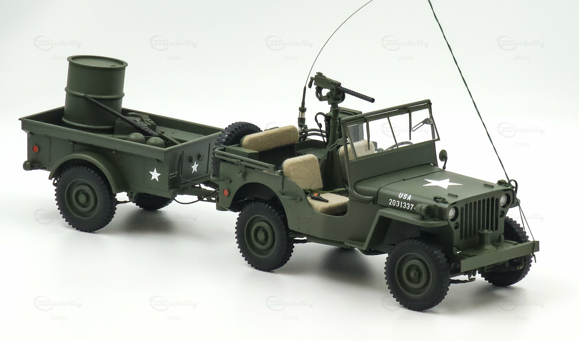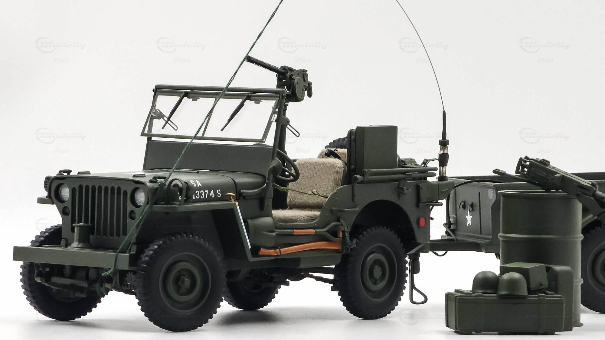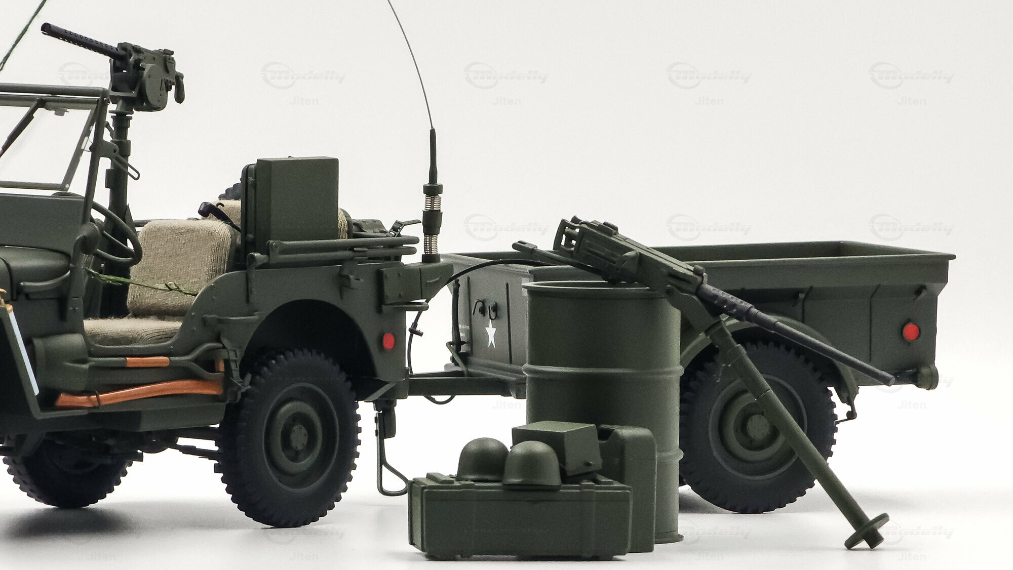 Das gezeigte Miniaturfahrzeug gehört zur Sammlung des Modelly-Mitglieds „Jiten“ und stellt ein Modellauto im Maßstab 1:18 von AUTOart Signature dar. Gefertigt ist die Miniatur in Diecast-Bauweise (Druckguss), wodurch die Formen des Rahmens, der Kotflügel und der markanten Frontmaske sauber und robust wiedergegeben sind. Die Lackierung orientiert sich am üblichen Olive Drab des US-Militärs; auf der Motorhaube ist der weiße Stern sauber aufgebracht, dazu kommen feine, lesbare Typ- und Warnschilder sowie die „USA“-Zulassungsnummern an der Seite. Im Innenraum sind die spartanische Instrumententafel, das Dreispeichenlenkrad, Gang- und Verteilergetriebehebel sowie Pedalerie detailliert dargestellt. Auffällig sind die grob gewebten Sitzpolster, die im Modell eine stoffartige Struktur besitzen. Direkt hinter den Vordersitzen ist ein Funkgerät mit Kabeln und Stabantenne zu sehen, passend zur Aufklärungs- und Verbindungsrolle vieler Fahrzeuge. Auf dem Drehkranz ist eine M1919-Attrappe montiert, und an der linken Seite hängen Axt und Schaufel; der außenliegende Feuerlöscher ist ebenfalls nachgebildet. Der angehängte 1:4‑Ton‑Trailer zeigt ein 55‑Gallonen-Fass und weitere Ausrüstungsobjekte; weiße Sterne auf den Bordwänden übernehmen das Markierungsschema des Zugfahrzeugs. Dieses Modellauto im Maßstab 1:18 von AUTOart Signature ist als limitierte Auflage gekennzeichnet und sammeltauglich dokumentiert.