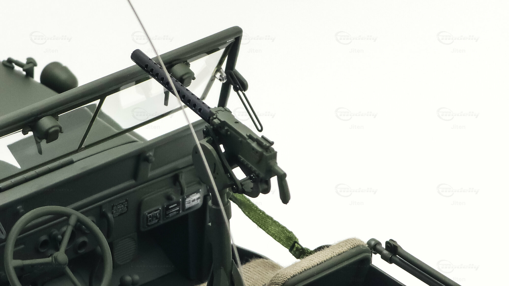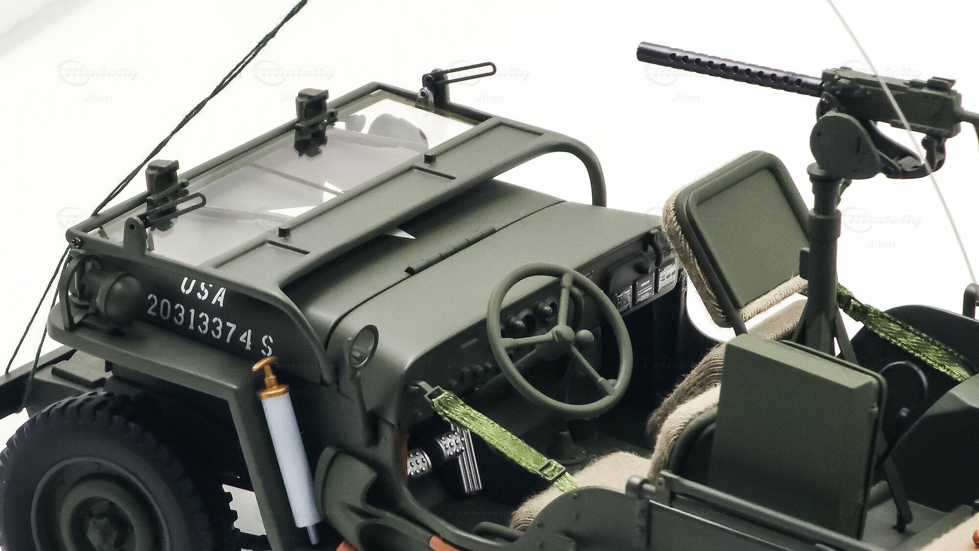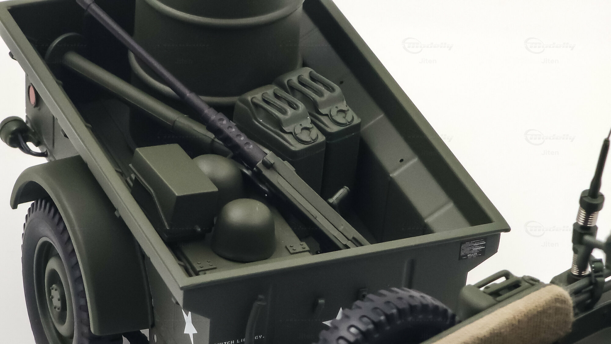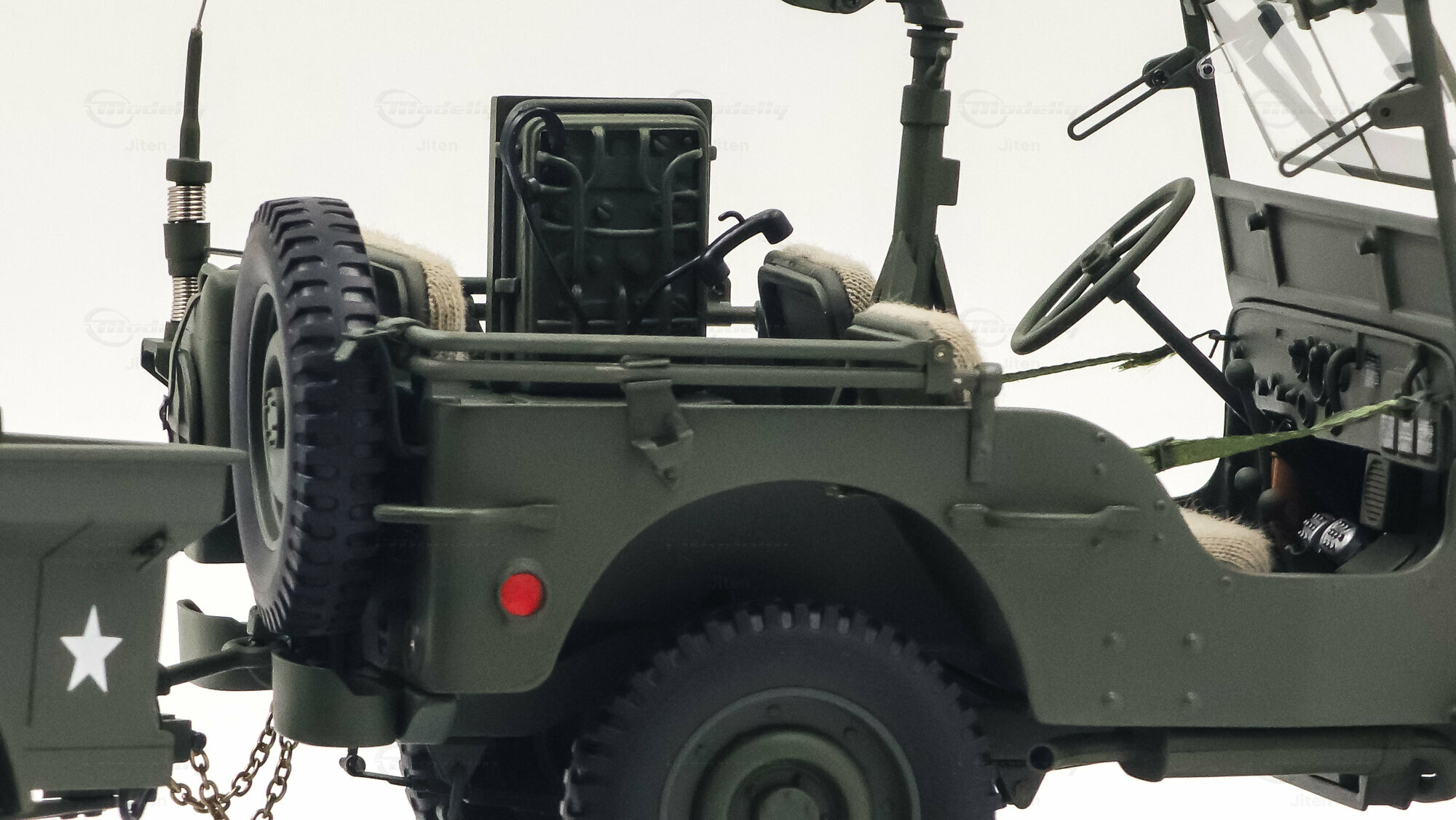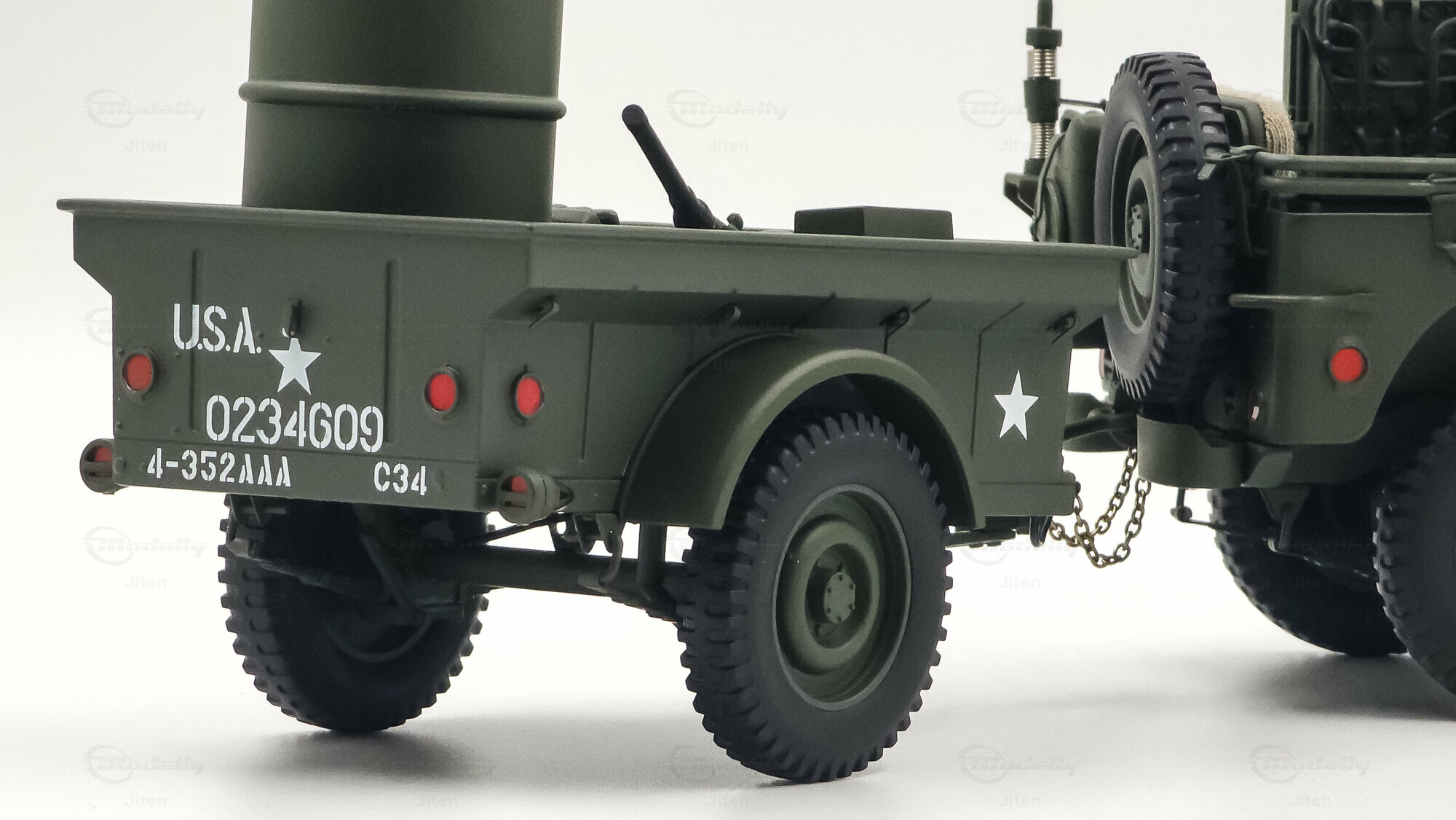 Das gezeigte Miniaturfahrzeug gehört zur Sammlung des Modelly-Mitglieds „Jiten“ und stellt ein Modellauto im Maßstab 1:18 von AUTOart Signature dar. Gefertigt ist die Miniatur in Diecast-Bauweise (Druckguss), wodurch die Formen des Rahmens, der Kotflügel und der markanten Frontmaske sauber und robust wiedergegeben sind. Die Lackierung orientiert sich am üblichen Olive Drab des US-Militärs; auf der Motorhaube ist der weiße Stern sauber aufgebracht, dazu kommen feine, lesbare Typ- und Warnschilder sowie die „USA“-Zulassungsnummern an der Seite. Im Innenraum sind die spartanische Instrumententafel, das Dreispeichenlenkrad, Gang- und Verteilergetriebehebel sowie Pedalerie detailliert dargestellt. Auffällig sind die grob gewebten Sitzpolster, die im Modell eine stoffartige Struktur besitzen. Direkt hinter den Vordersitzen ist ein Funkgerät mit Kabeln und Stabantenne zu sehen, passend zur Aufklärungs- und Verbindungsrolle vieler Fahrzeuge. Auf dem Drehkranz ist eine M1919-Attrappe montiert, und an der linken Seite hängen Axt und Schaufel; der außenliegende Feuerlöscher ist ebenfalls nachgebildet. Der angehängte 1:4‑Ton‑Trailer zeigt ein 55‑Gallonen-Fass und weitere Ausrüstungsobjekte; weiße Sterne auf den Bordwänden übernehmen das Markierungsschema des Zugfahrzeugs. Dieses Modellauto im Maßstab 1:18 von AUTOart Signature ist als limitierte Auflage gekennzeichnet und sammeltauglich dokumentiert.