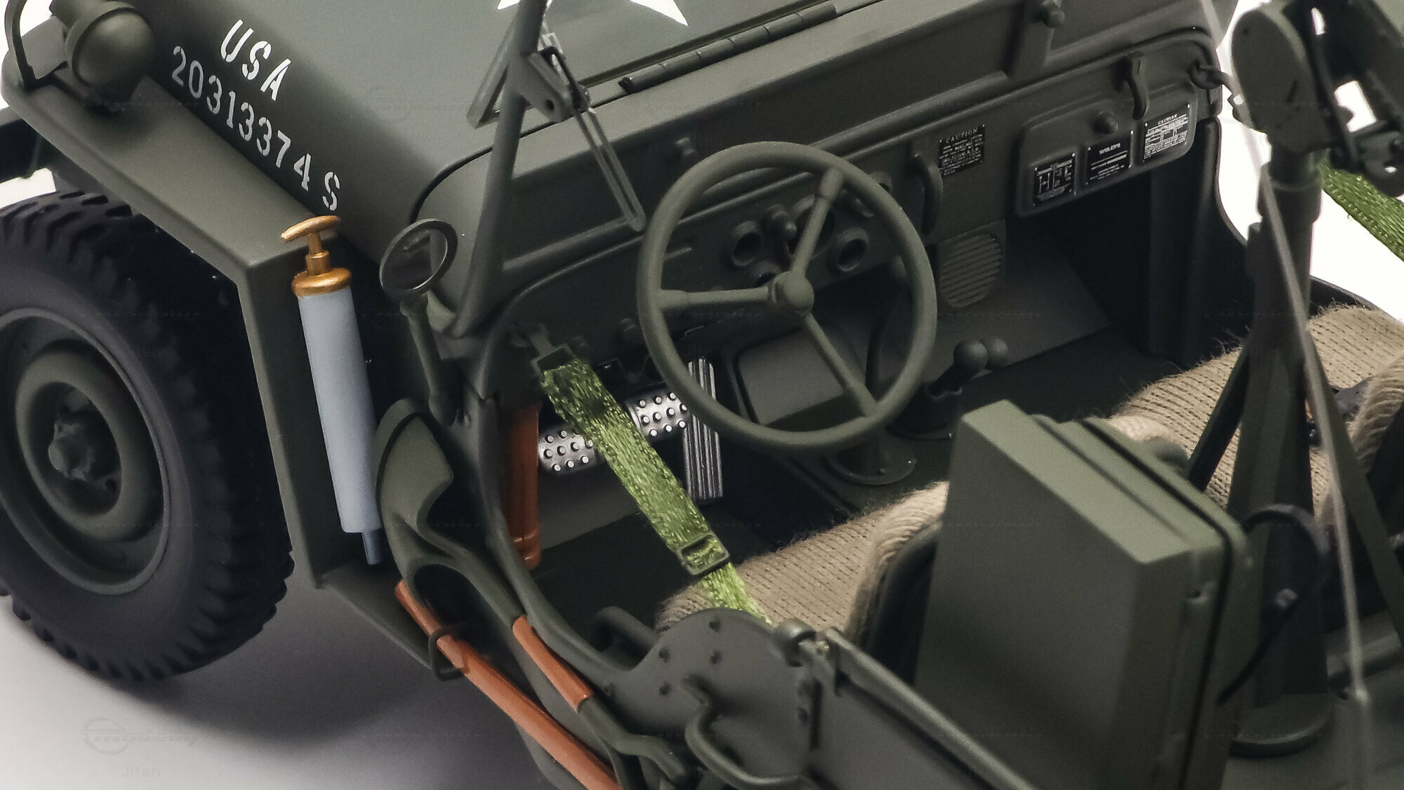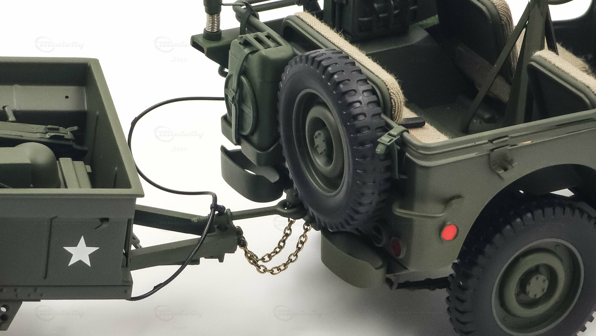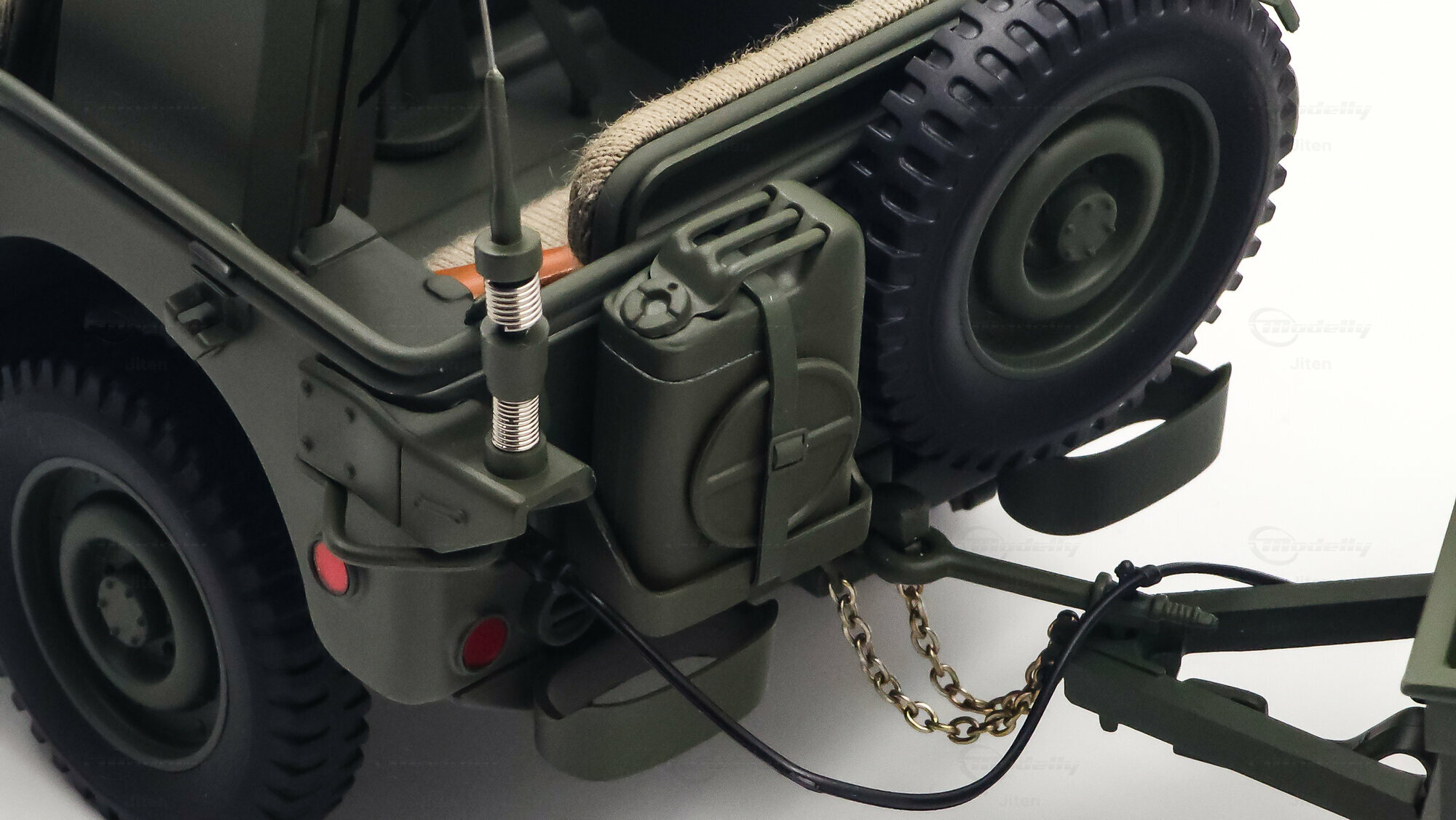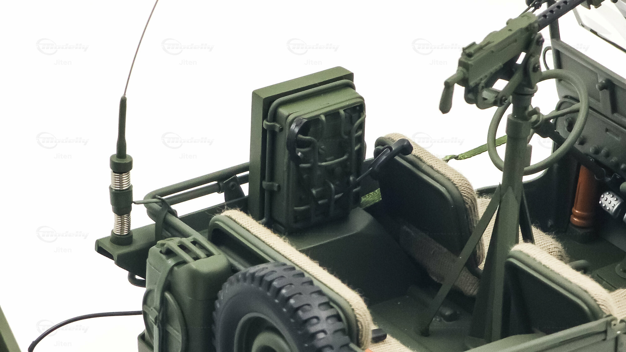 Das gezeigte Miniaturfahrzeug gehört zur Sammlung des Modelly-Mitglieds „Jiten“ und stellt ein Modellauto im Maßstab 1:18 von AUTOart Signature dar. Gefertigt ist die Miniatur in Diecast-Bauweise (Druckguss), wodurch die Formen des Rahmens, der Kotflügel und der markanten Frontmaske sauber und robust wiedergegeben sind. Die Lackierung orientiert sich am üblichen Olive Drab des US-Militärs; auf der Motorhaube ist der weiße Stern sauber aufgebracht, dazu kommen feine, lesbare Typ- und Warnschilder sowie die „USA“-Zulassungsnummern an der Seite. Im Innenraum sind die spartanische Instrumententafel, das Dreispeichenlenkrad, Gang- und Verteilergetriebehebel sowie Pedalerie detailliert dargestellt. Auffällig sind die grob gewebten Sitzpolster, die im Modell eine stoffartige Struktur besitzen. Direkt hinter den Vordersitzen ist ein Funkgerät mit Kabeln und Stabantenne zu sehen, passend zur Aufklärungs- und Verbindungsrolle vieler Fahrzeuge. Auf dem Drehkranz ist eine M1919-Attrappe montiert, und an der linken Seite hängen Axt und Schaufel; der außenliegende Feuerlöscher ist ebenfalls nachgebildet. Der angehängte 1:4‑Ton‑Trailer zeigt ein 55‑Gallonen-Fass und weitere Ausrüstungsobjekte; weiße Sterne auf den Bordwänden übernehmen das Markierungsschema des Zugfahrzeugs. Dieses Modellauto im Maßstab 1:18 von AUTOart Signature ist als limitierte Auflage gekennzeichnet und sammeltauglich dokumentiert.