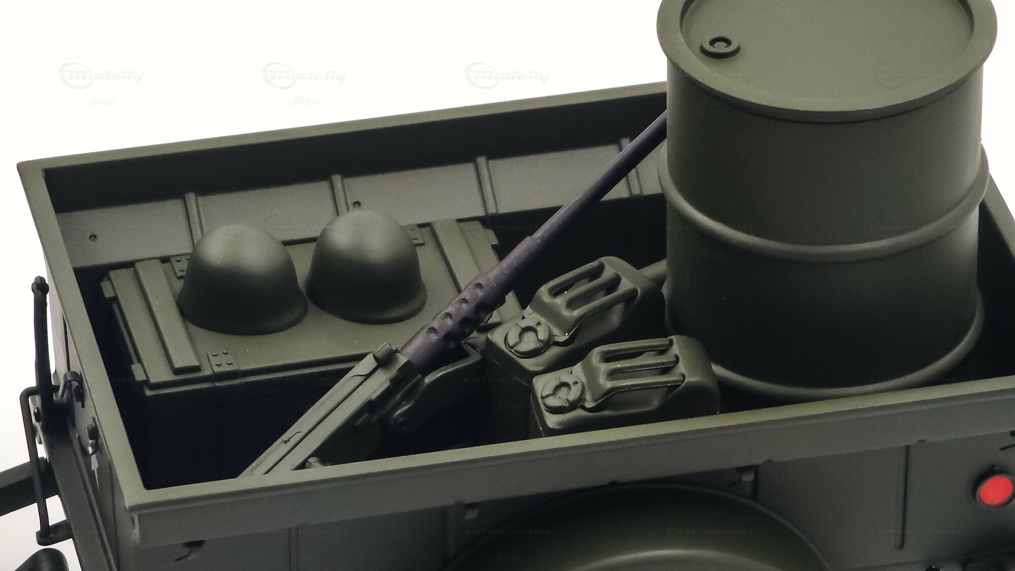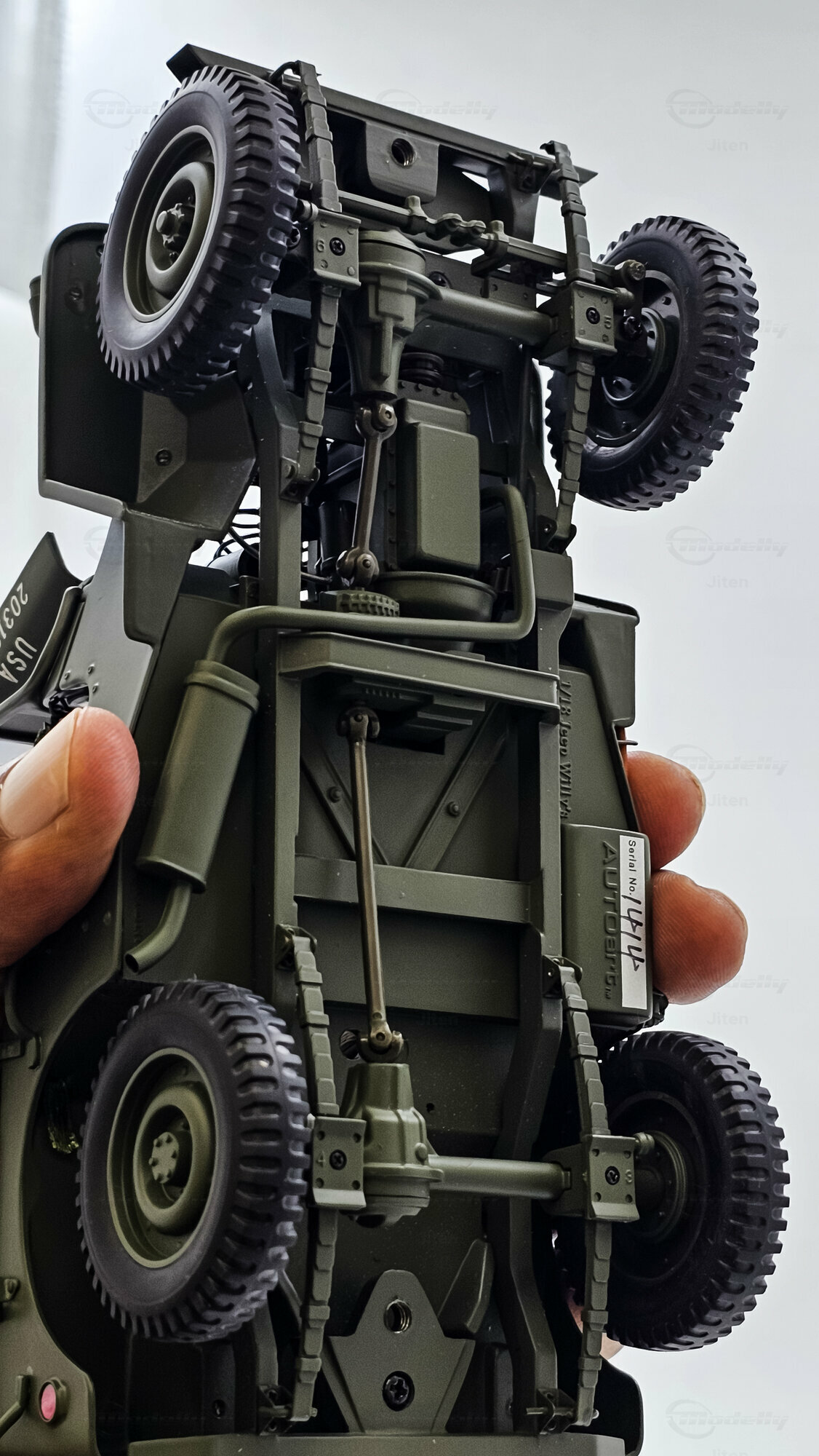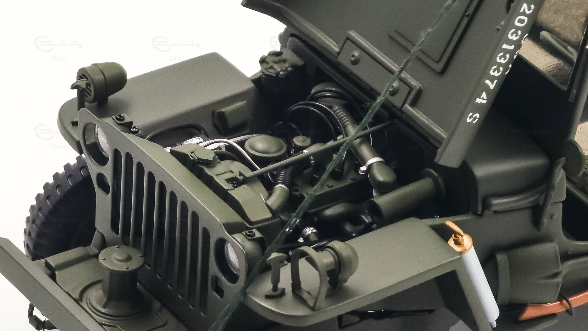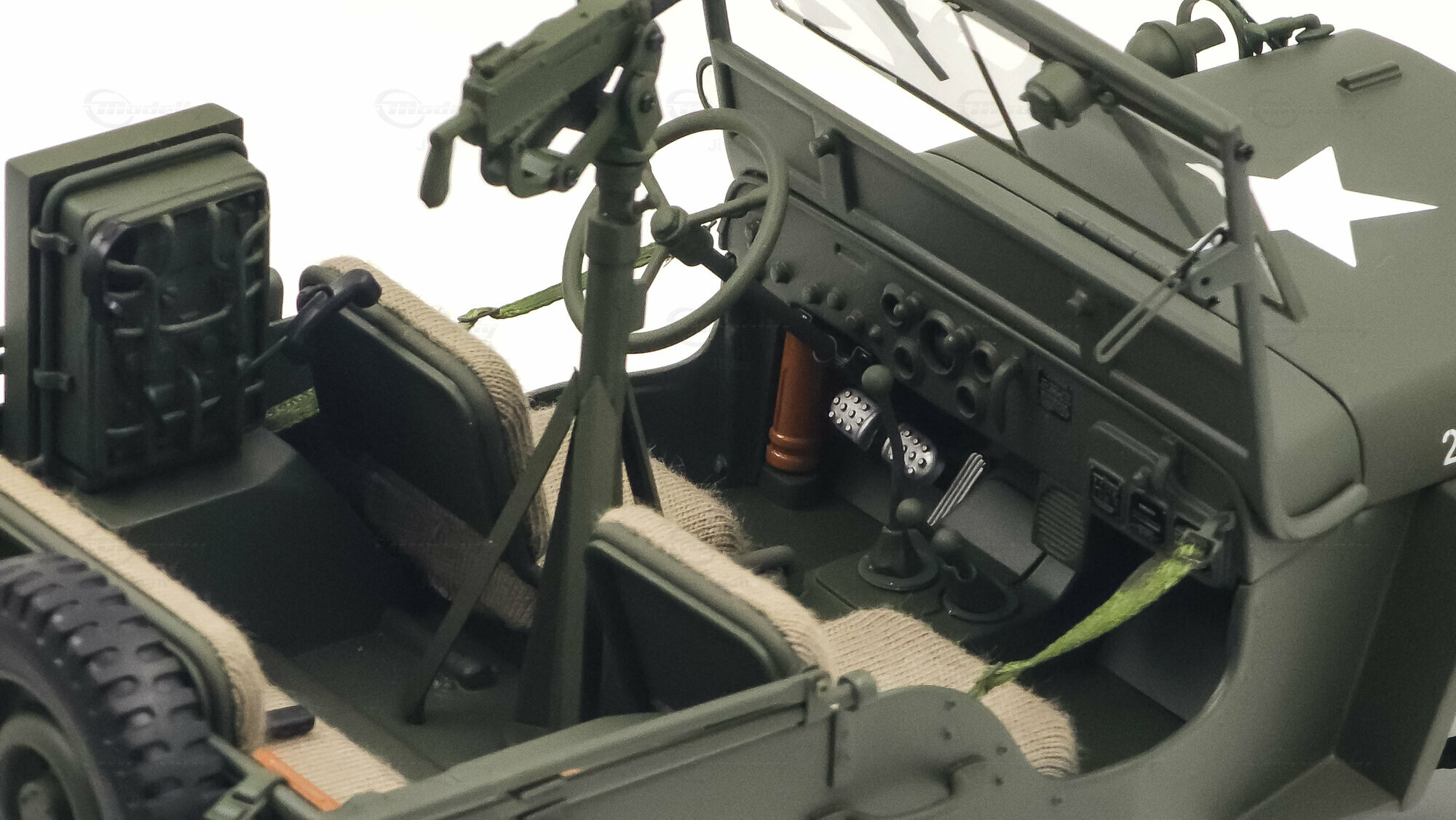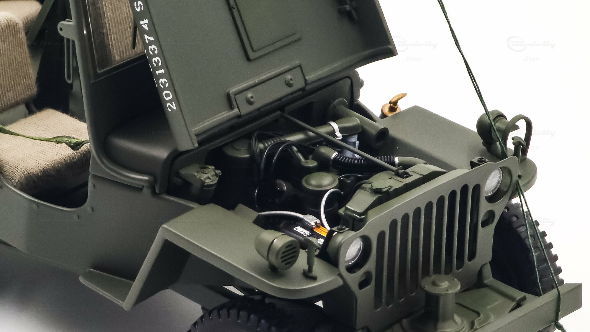 Das gezeigte Miniaturfahrzeug gehört zur Sammlung des Modelly-Mitglieds „Jiten“ und stellt ein Modellauto im Maßstab 1:18 von AUTOart Signature dar. Gefertigt ist die Miniatur in Diecast-Bauweise (Druckguss), wodurch die Formen des Rahmens, der Kotflügel und der markanten Frontmaske sauber und robust wiedergegeben sind. Die Lackierung orientiert sich am üblichen Olive Drab des US-Militärs; auf der Motorhaube ist der weiße Stern sauber aufgebracht, dazu kommen feine, lesbare Typ- und Warnschilder sowie die „USA“-Zulassungsnummern an der Seite. Im Innenraum sind die spartanische Instrumententafel, das Dreispeichenlenkrad, Gang- und Verteilergetriebehebel sowie Pedalerie detailliert dargestellt. Auffällig sind die grob gewebten Sitzpolster, die im Modell eine stoffartige Struktur besitzen. Direkt hinter den Vordersitzen ist ein Funkgerät mit Kabeln und Stabantenne zu sehen, passend zur Aufklärungs- und Verbindungsrolle vieler Fahrzeuge. Auf dem Drehkranz ist eine M1919-Attrappe montiert, und an der linken Seite hängen Axt und Schaufel; der außenliegende Feuerlöscher ist ebenfalls nachgebildet. Der angehängte 1:4‑Ton‑Trailer zeigt ein 55‑Gallonen-Fass und weitere Ausrüstungsobjekte; weiße Sterne auf den Bordwänden übernehmen das Markierungsschema des Zugfahrzeugs. Dieses Modellauto im Maßstab 1:18 von AUTOart Signature ist als limitierte Auflage gekennzeichnet und sammeltauglich dokumentiert.
