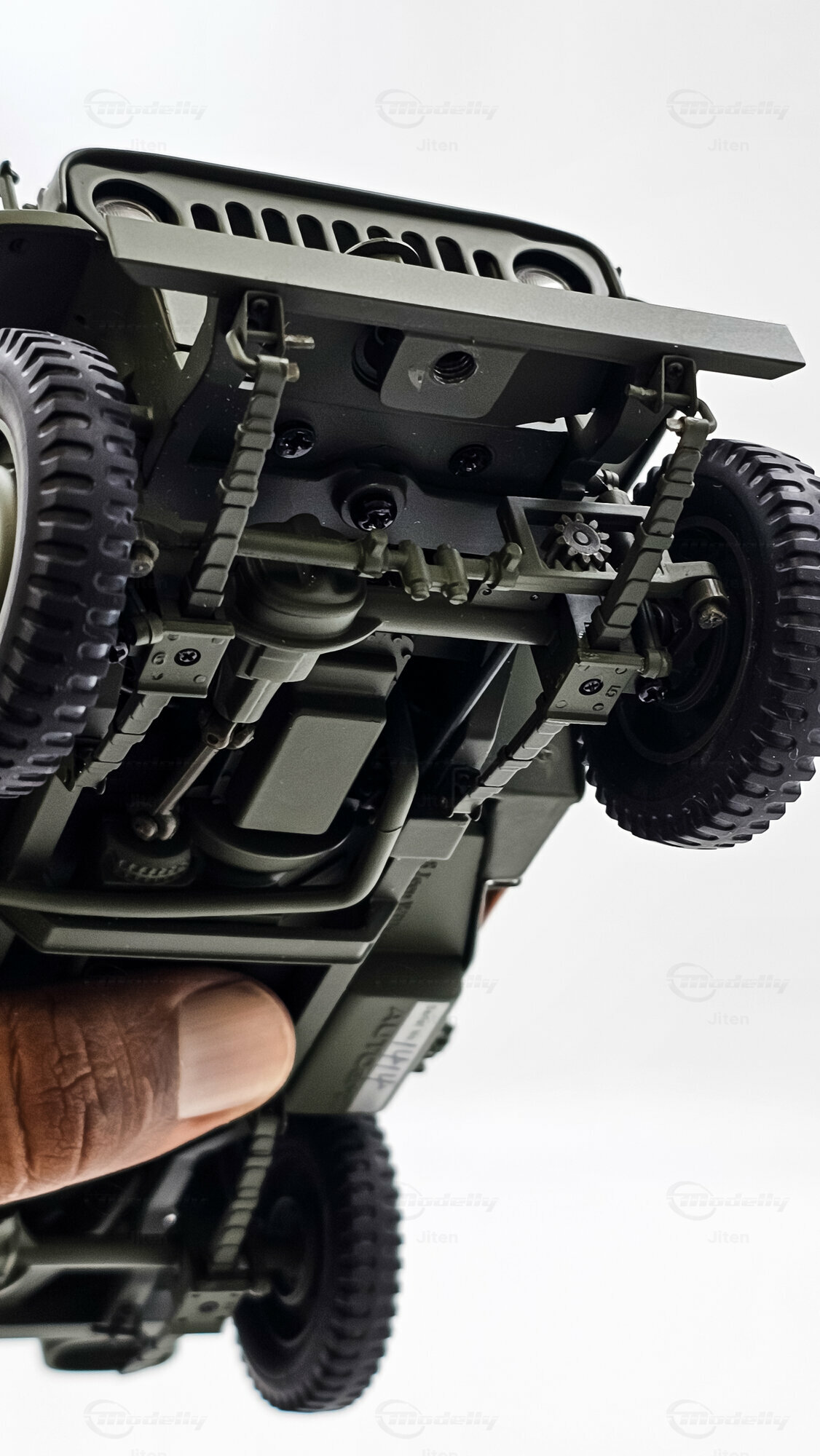 Das Vorbild dieses Miniaturfahrzeugs ist der Willys MB 1:4 Ton 4x4, das während des Zweiten Weltkriegs zu einem der meistgebauten leichten Militärfahrzeuge avancierte. Die hier vorgestellte Baureihe ist die MB mit Produktionsbeginn 1941, gefertigt bis 1945 und parallel auch als Ford GPW lizenzgebaut. Der unmittelbare Vorgänger war der Willys MA, der zusammen mit dem Bantam BRC als Prototypen die Anforderungen der US Army an einen kompakten, geländegängigen 4x4 definierte. Der Willys MB 1:4 Ton 4x4 übernahm daraus die kurze Rahmenkonstruktion mit 80-Zoll-Radstand, starre Achsen an Blattfedern, zuschaltbaren Vorderradantrieb und eine alltagstaugliche Bedienung. Typisch für den Willys MB 1:4 Ton 4x4 ist das gestanzte Kühlergitter mit vertikalen Schlitzen, die klappbare Frontscheibe, die schlichte Karosseriestruktur ohne Türen und das zweckmäßige Interieur mit minimaler Instrumentierung. Durch seine universelle Verwendbarkeit – Personentransport, Erkundung, Funk, Zugmittel – wurde der Willys MB 1:4 Ton 4x4 zu einem Standardwerkzeug vieler alliierten Truppen auf allen Kriegsschauplätzen.