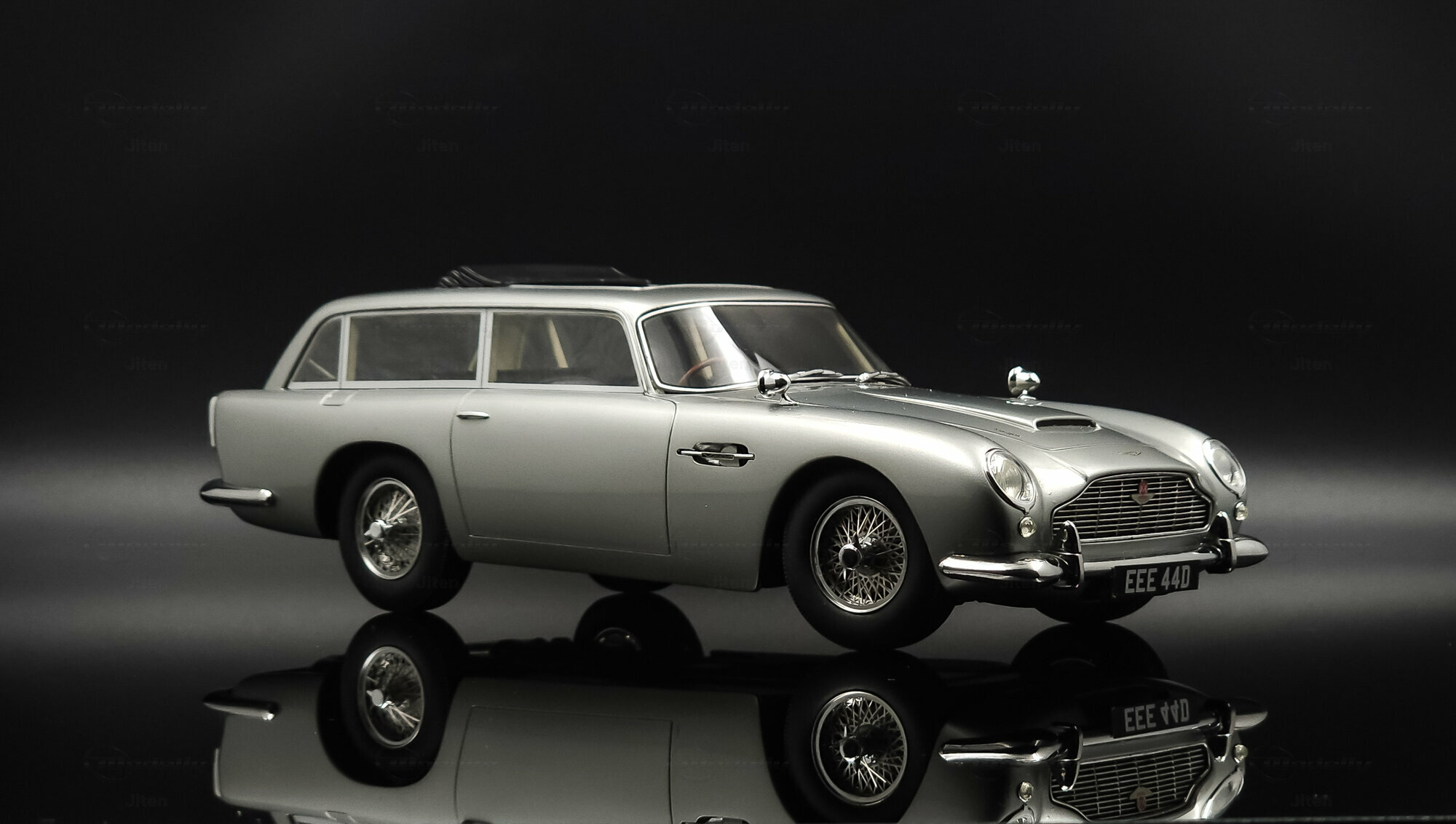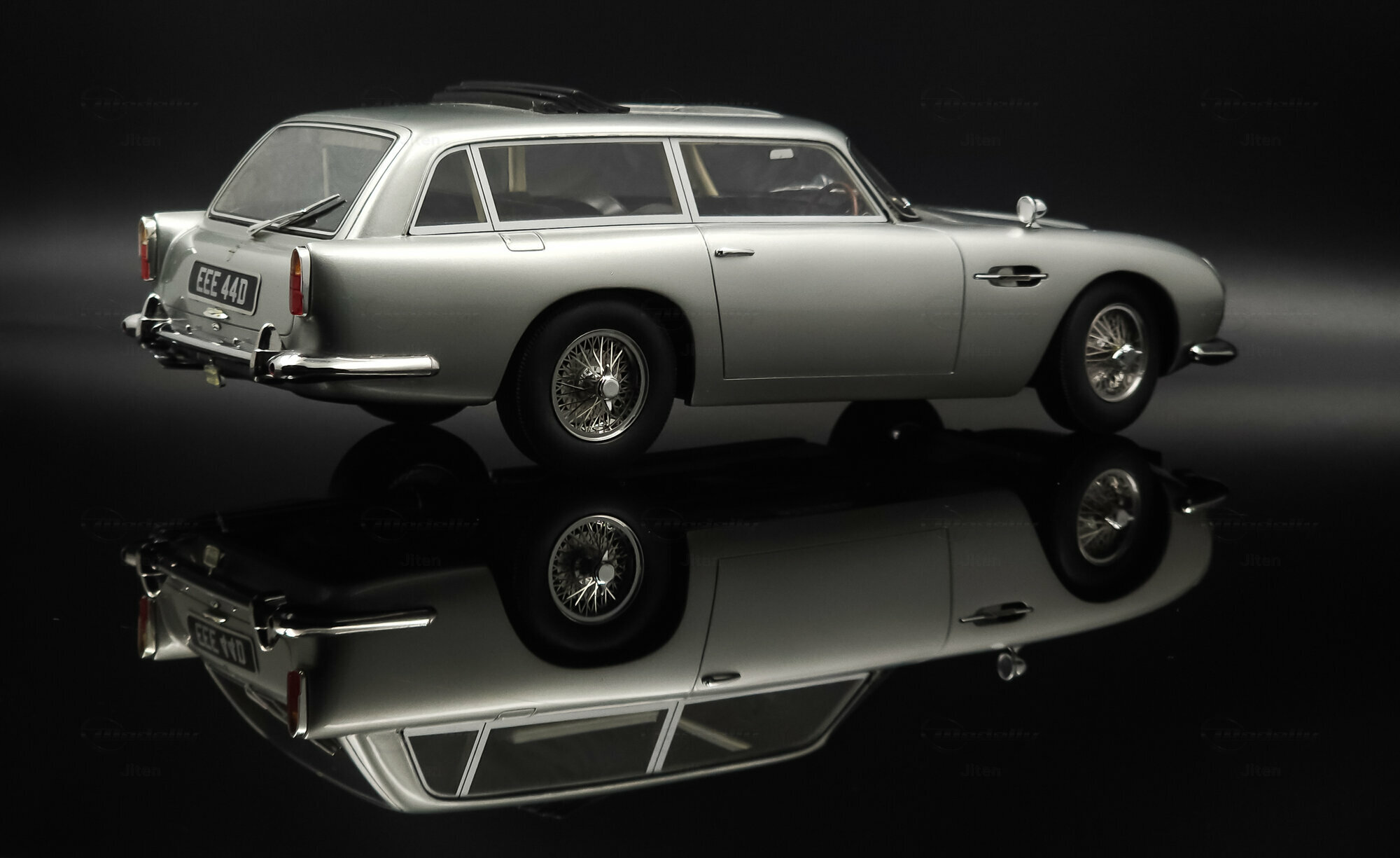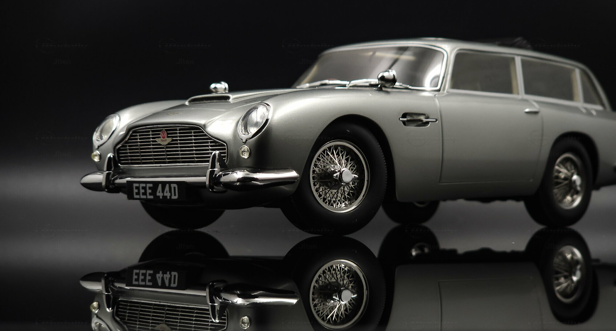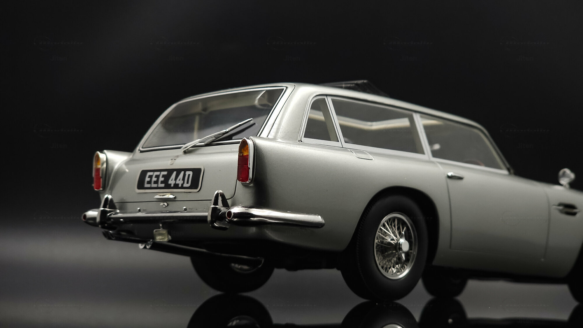 Das abgebildete Modell ist eine präzise Nachbildung des seltenen Aston Martin DB5 Shooting Brake. Es handelt sich um ein Sammlerstück im Maßstab 1:18, hergestellt von Cult Scale Models. Die Miniatur, die Teil der Sammlung des Modelly-Mitglieds Jiten ist, fällt durch ihre detailgetreue Verarbeitung im Material Diecast auf und spiegelt die luxuriösen Merkmale des Originals wider. Hinzu kommen die optischen Details des Modells: Die Metallic-Lackierung in einem silberfarbenen Ton verleiht ihm ein repräsentatives Erscheinungsbild. Die markante DB5-Front mit einem fein inszenierten Kühlergrill und die charakteristischen Speichenräder verstärken die authentische Optik. Auch die verchromten Stoßfänger und die Dachreling des Modells unterstreichen den Hauch von Luxus und Handwerkskunst, der mit dem Shooting Brake assoziiert wird. Der Nummernschild-Aufdruck „EEE 44D“ setzt einen finalen Akzent. Jeder Teil des Modells, vom Innenraum mit Sitzen in Lederoptik bis hin zu den funktionslosen Rückspiegeln, wurde präzise umgesetzt.