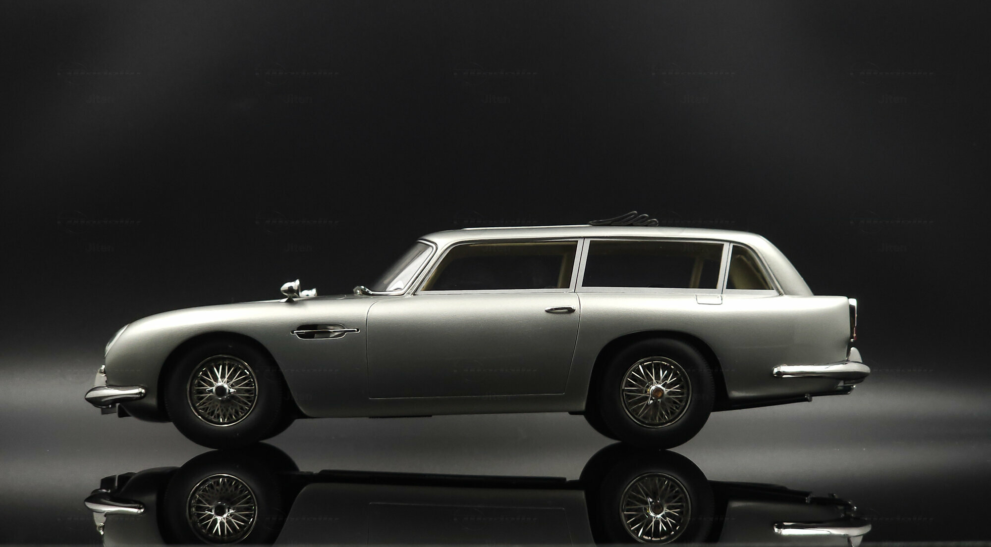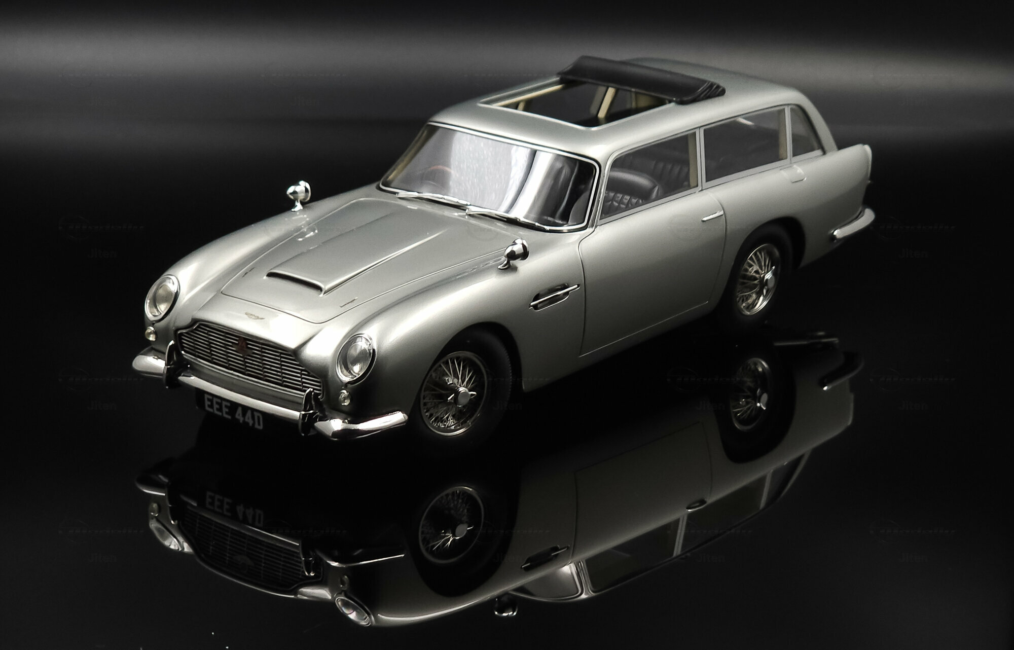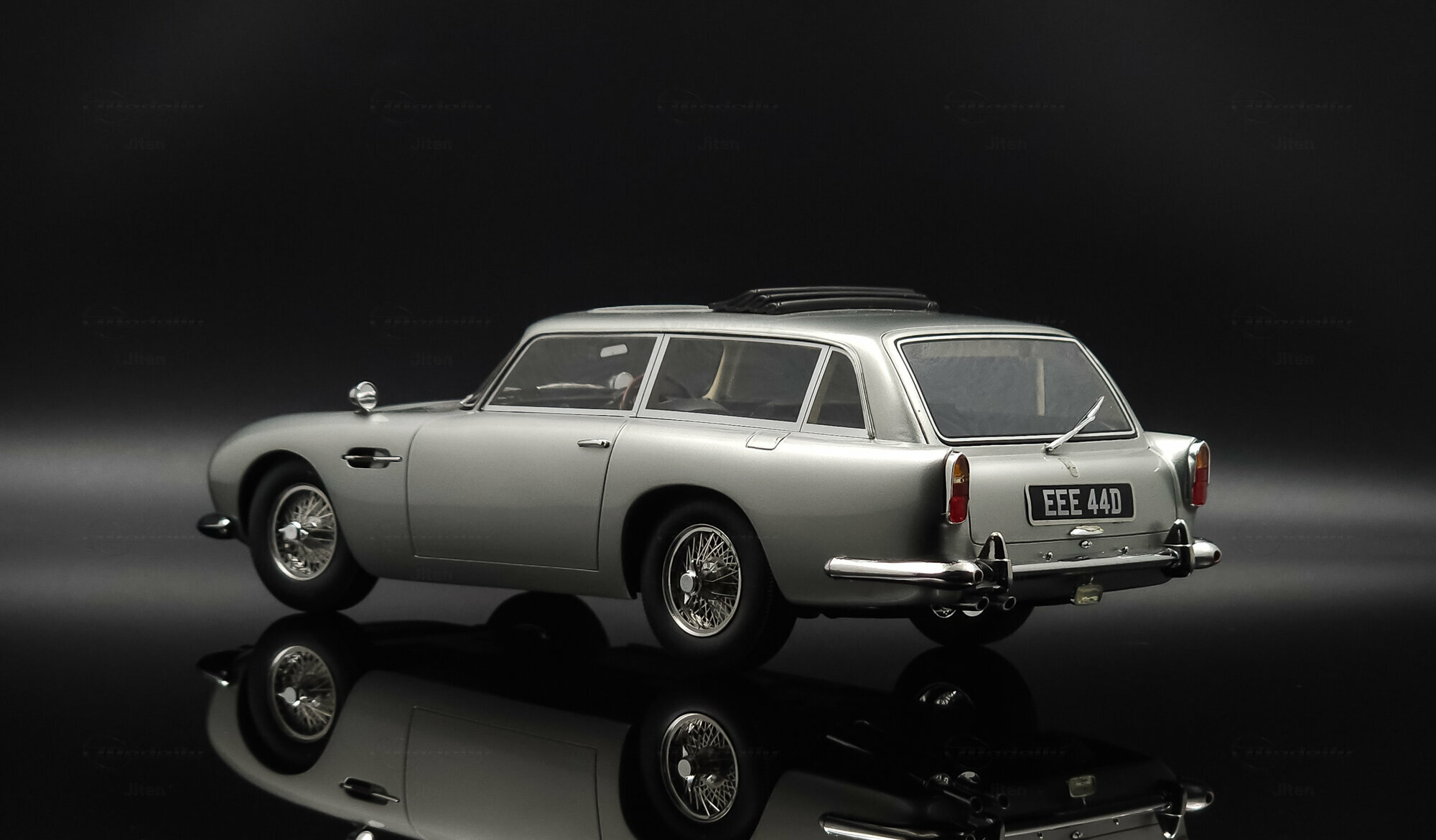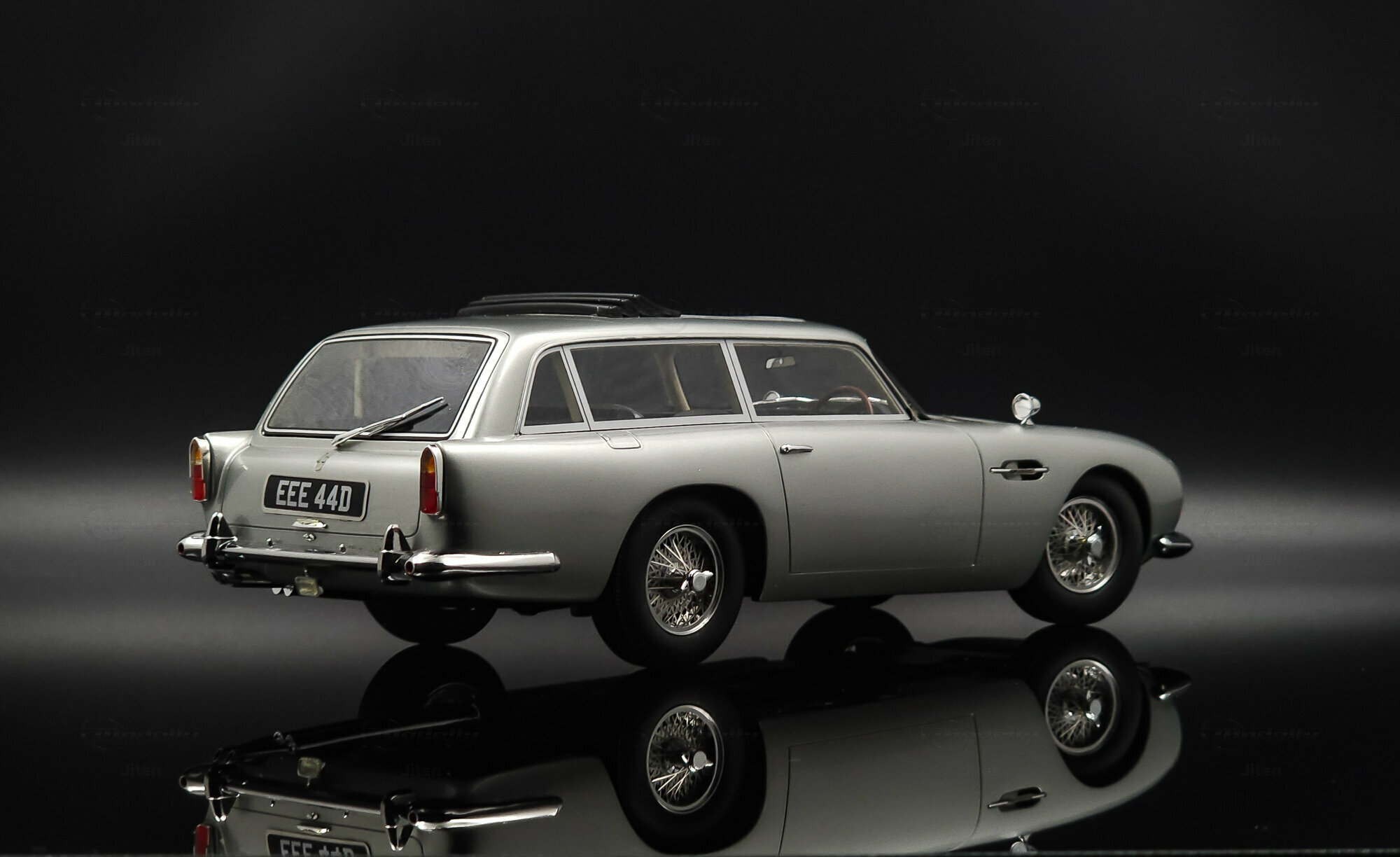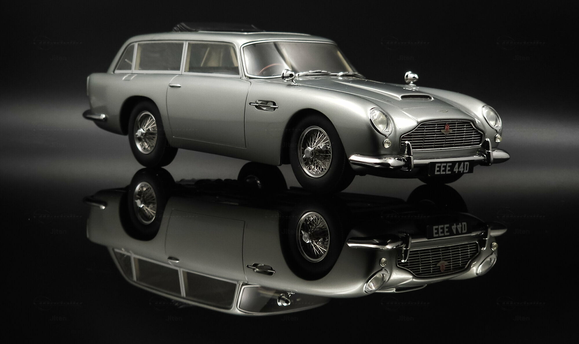 Das abgebildete Modell ist eine präzise Nachbildung des seltenen Aston Martin DB5 Shooting Brake. Es handelt sich um ein Sammlerstück im Maßstab 1:18, hergestellt von Cult Scale Models. Die Miniatur, die Teil der Sammlung des Modelly-Mitglieds Jiten ist, fällt durch ihre detailgetreue Verarbeitung im Material Diecast auf und spiegelt die luxuriösen Merkmale des Originals wider. Hinzu kommen die optischen Details des Modells: Die Metallic-Lackierung in einem silberfarbenen Ton verleiht ihm ein repräsentatives Erscheinungsbild. Die markante DB5-Front mit einem fein inszenierten Kühlergrill und die charakteristischen Speichenräder verstärken die authentische Optik. Auch die verchromten Stoßfänger und die Dachreling des Modells unterstreichen den Hauch von Luxus und Handwerkskunst, der mit dem Shooting Brake assoziiert wird. Der Nummernschild-Aufdruck „EEE 44D“ setzt einen finalen Akzent. Jeder Teil des Modells, vom Innenraum mit Sitzen in Lederoptik bis hin zu den funktionslosen Rückspiegeln, wurde präzise umgesetzt.