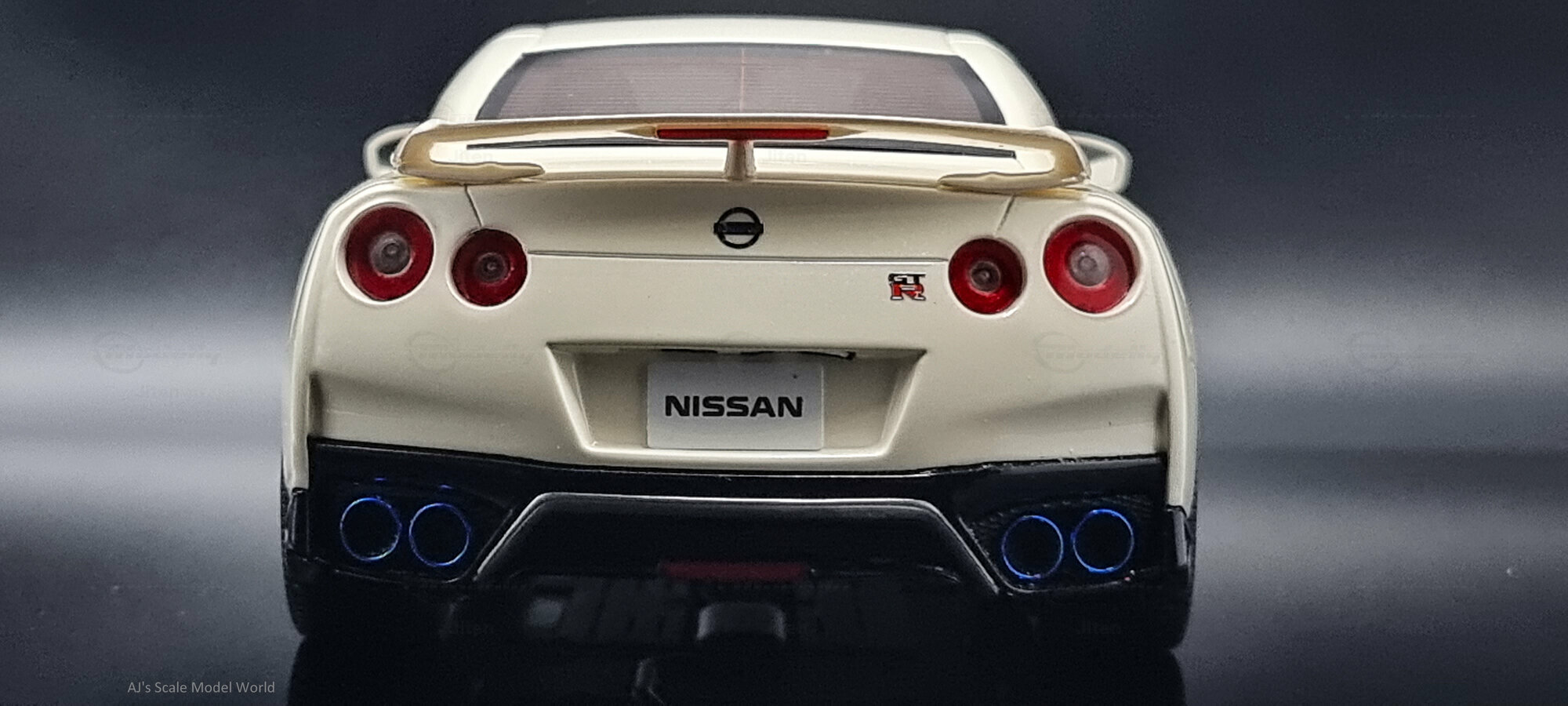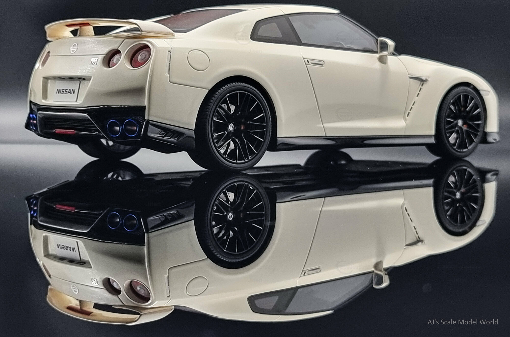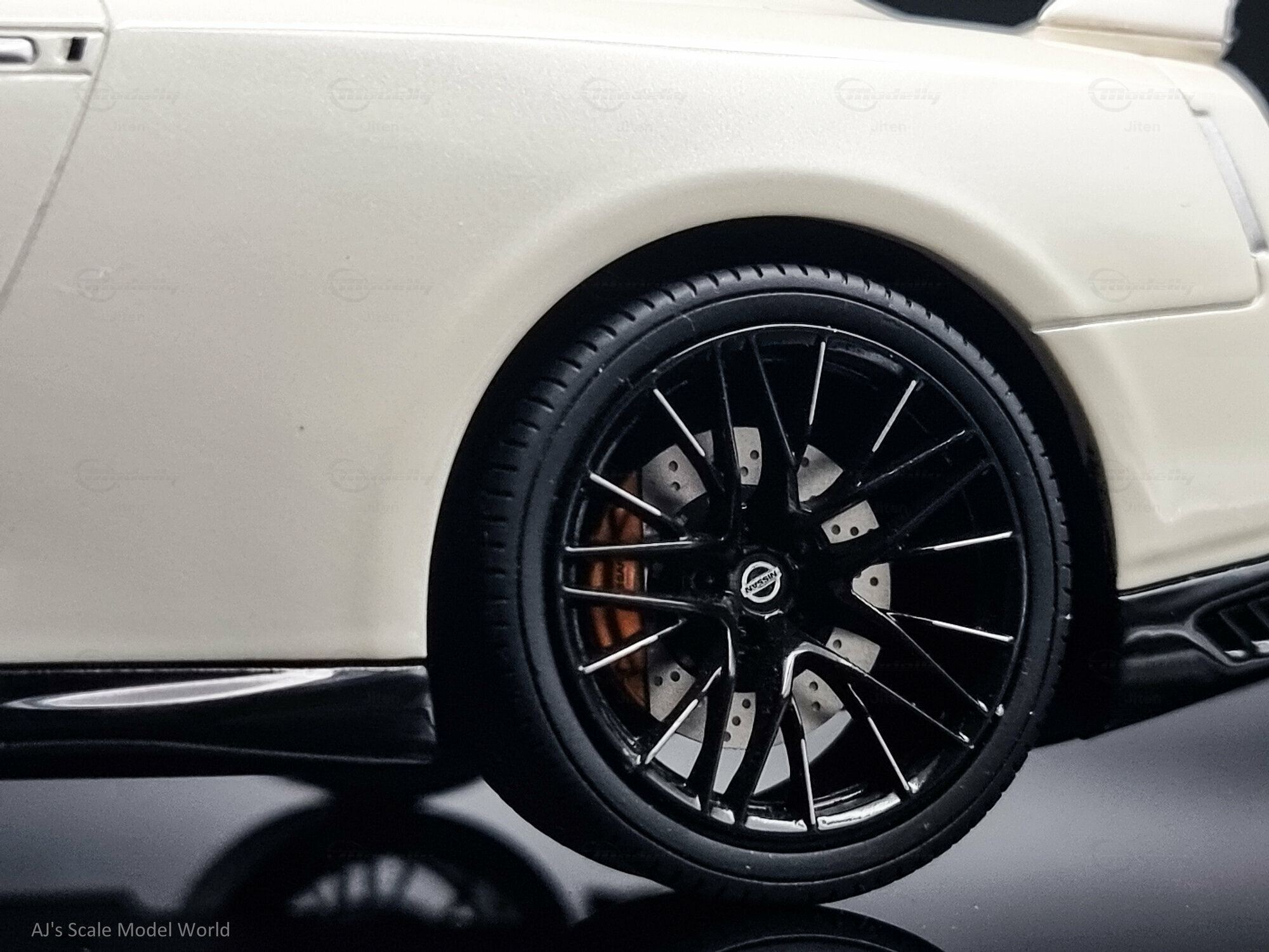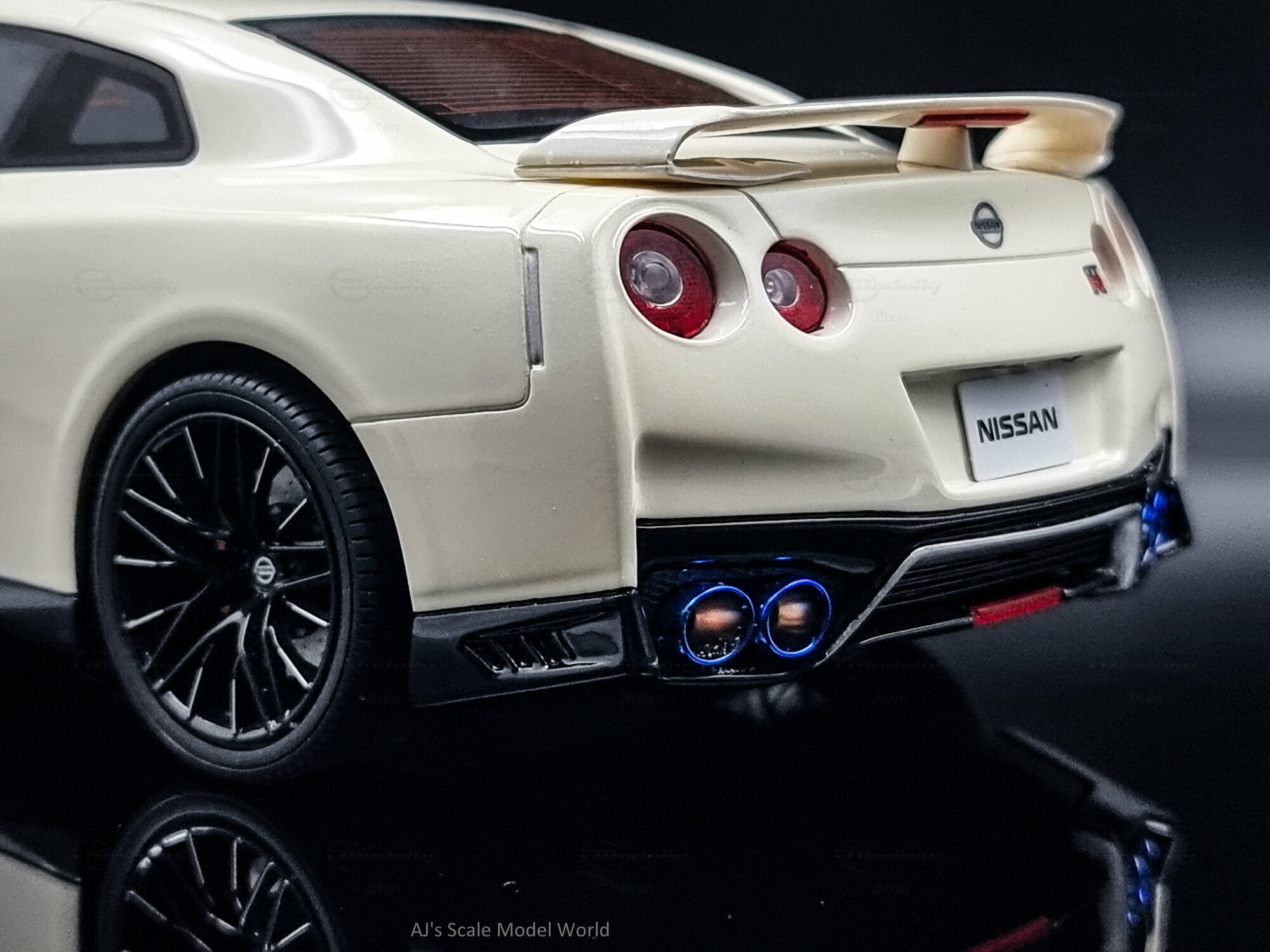 Das Modellauto im 1:18-Scale von GT Spirit Special - Kyosho besticht durch seine detailgetreue Nachbildung des Originals. Die Lackierung in einem eleganten Weißton, der durch die schwarzen Akzente und die sportlich gestalteten Yokohama Felgen ergänzt wird, gibt dem Modellauto ein authentisches und stilvolles Aussehen. Die Rückansicht zeigt präzise nachgebildete Rücklichter und einen realistischen Diffusor, der dem Original in nichts nachsteht. Auffällig sind auch die blauen Akzente an den Auspuffrohren, die dem Modell einen zusätzlichen Hauch von Sportlichkeit verleihen. Diese Miniatur ist zweifellos ein Muss für jeden Sammler und Liebhaber des Nissan GT-R Nismo.