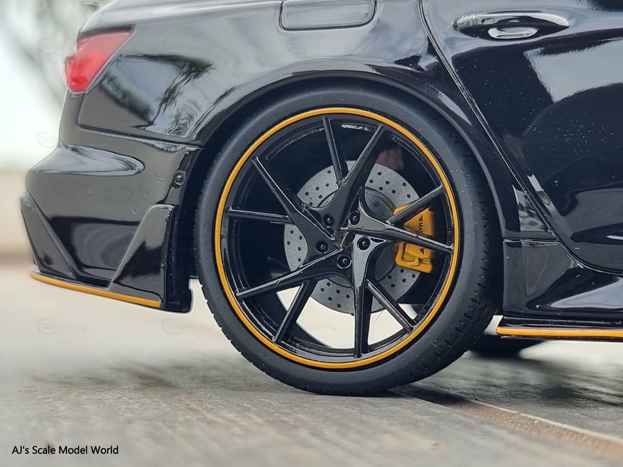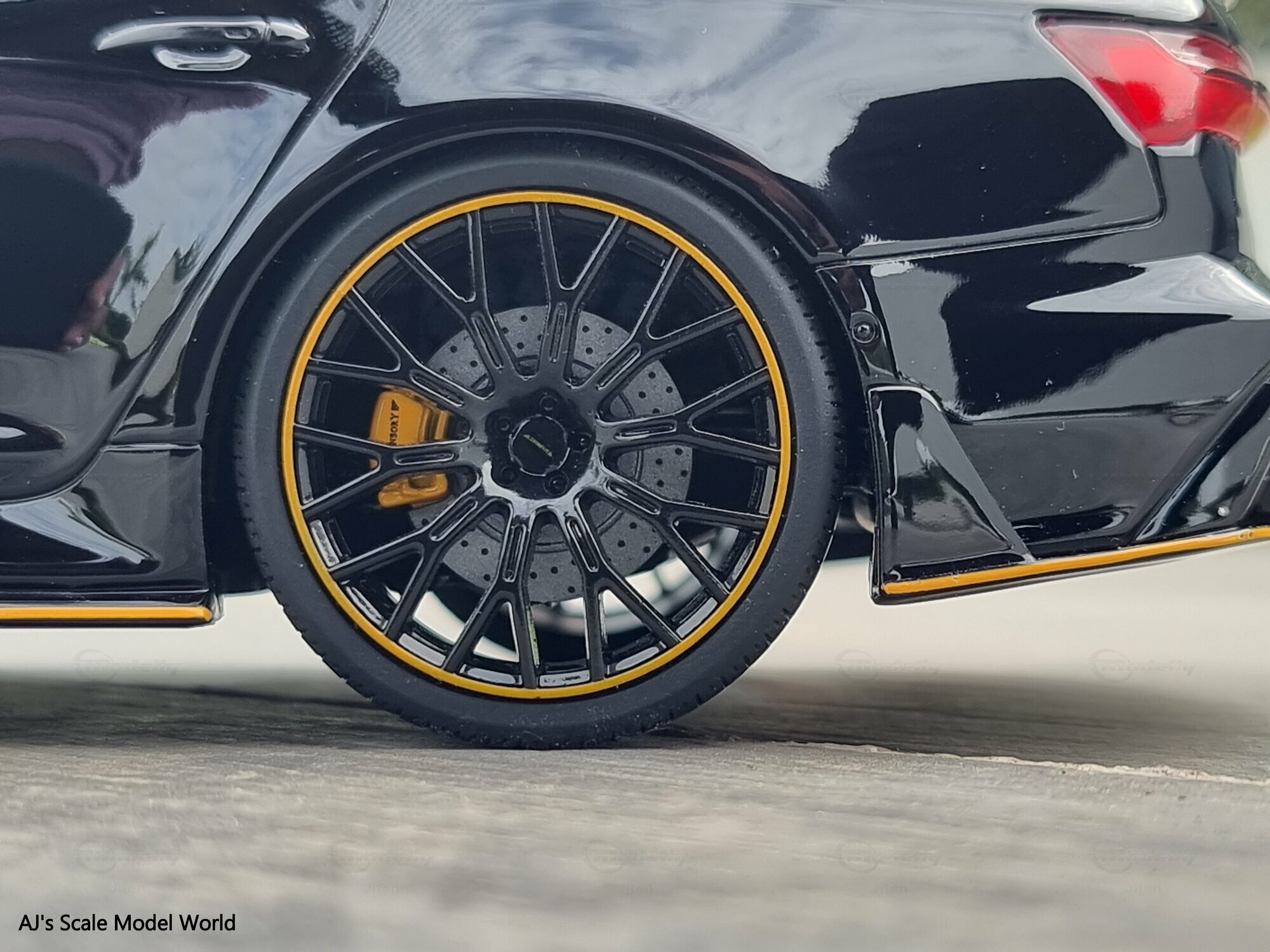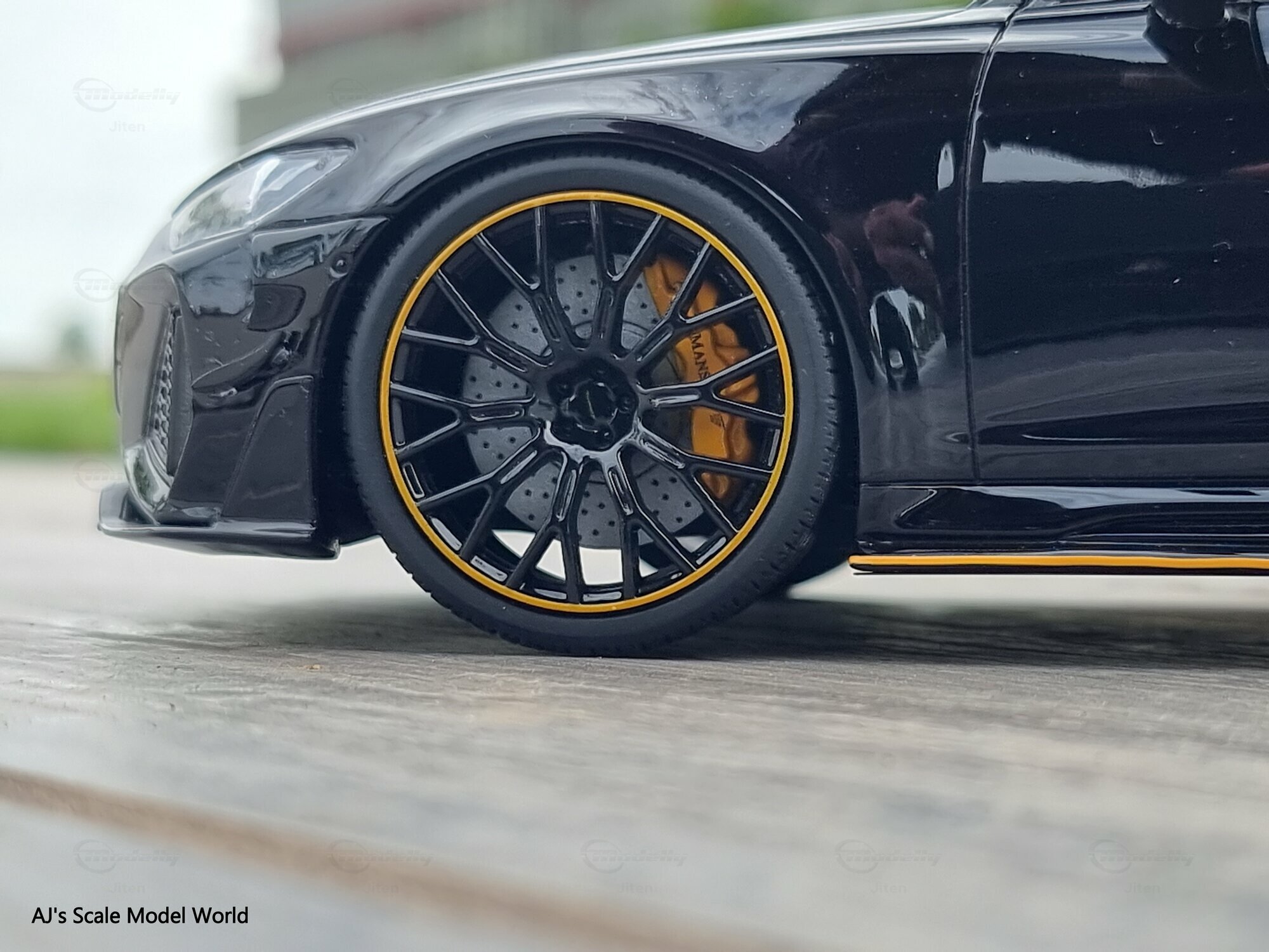 Wichtig zu betonen ist, dass dieses Modellfahrzeug modifiziert wurde und nicht zwangsläufig das Produkt darstellt, das ursprünglich von GTS produziert wurde. Die zweiteilige Lackierung in pechschwarz mit einem markanten gelben Streifen auf Motorhaube und Karosserie kennzeichnet das Modell. Auffällige gelbe Akzente an den Seiten und um die Radkästen verleihen dem Modell eine einzigartige und sportliche Optik. Eines der hervorstechendsten Merkmale dieses Modellautos sind die maßgefertigten Felgen von ABT Sportsline. Diese Räder sind eine Hommage an das Original und verleihen dem Modell zusätzliche Authentizität und Anziehungskraft.
