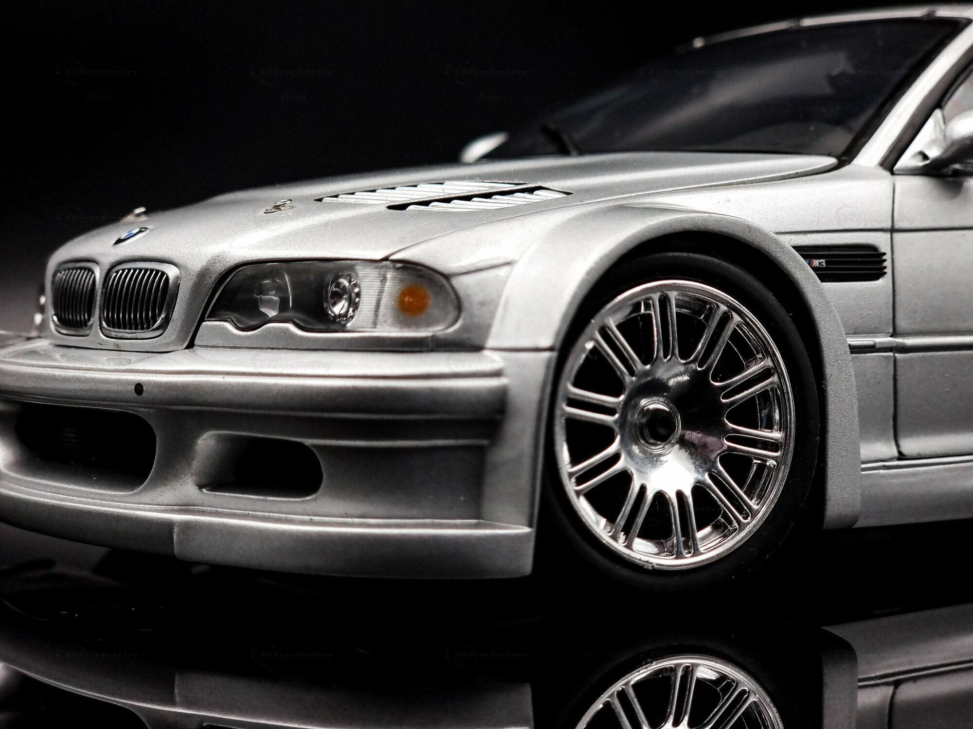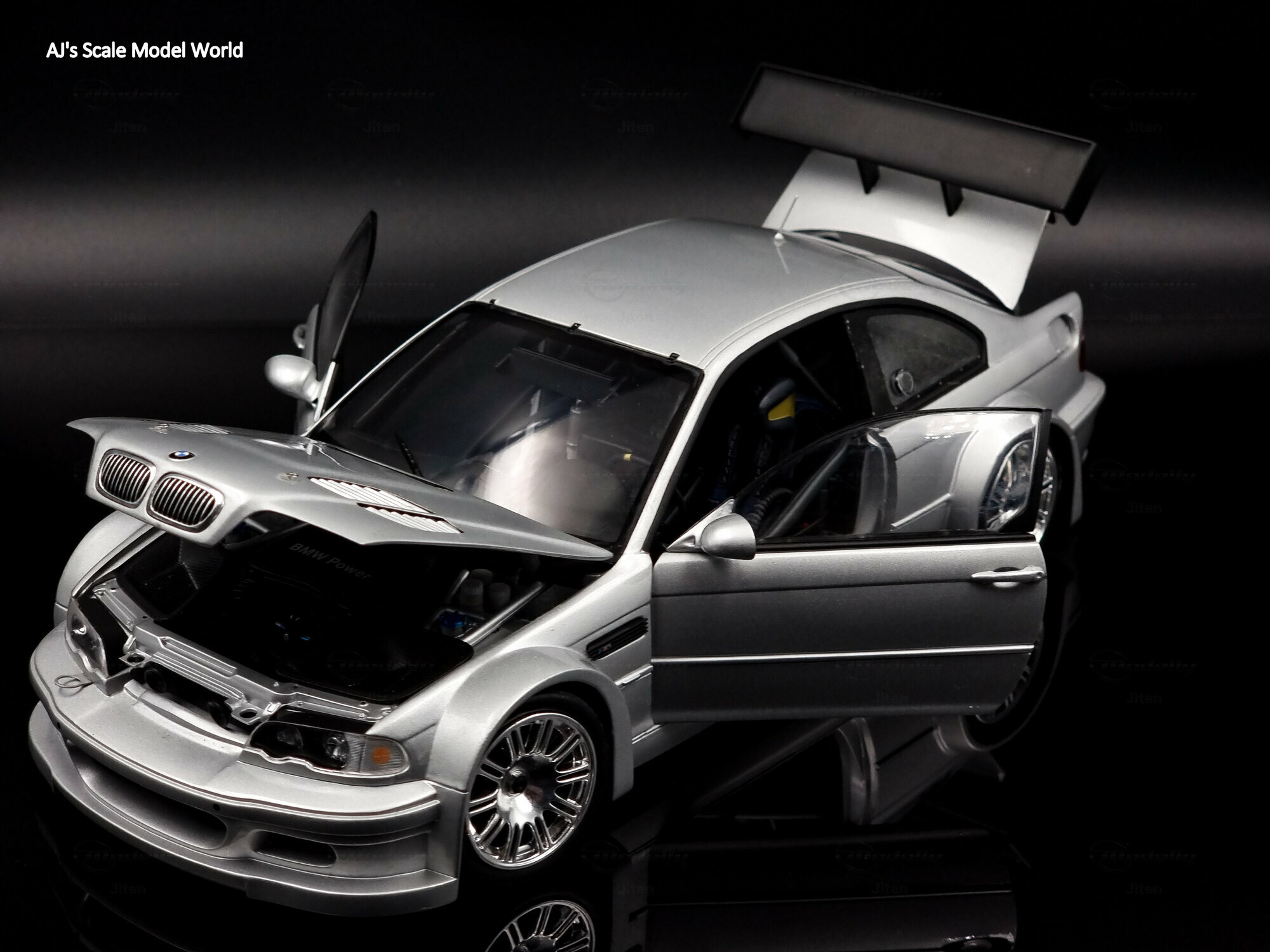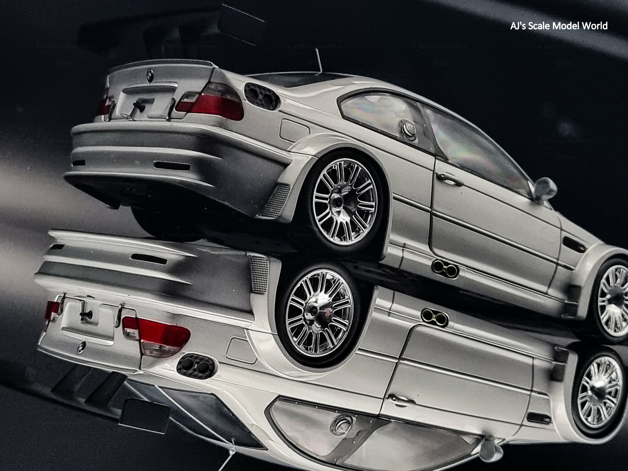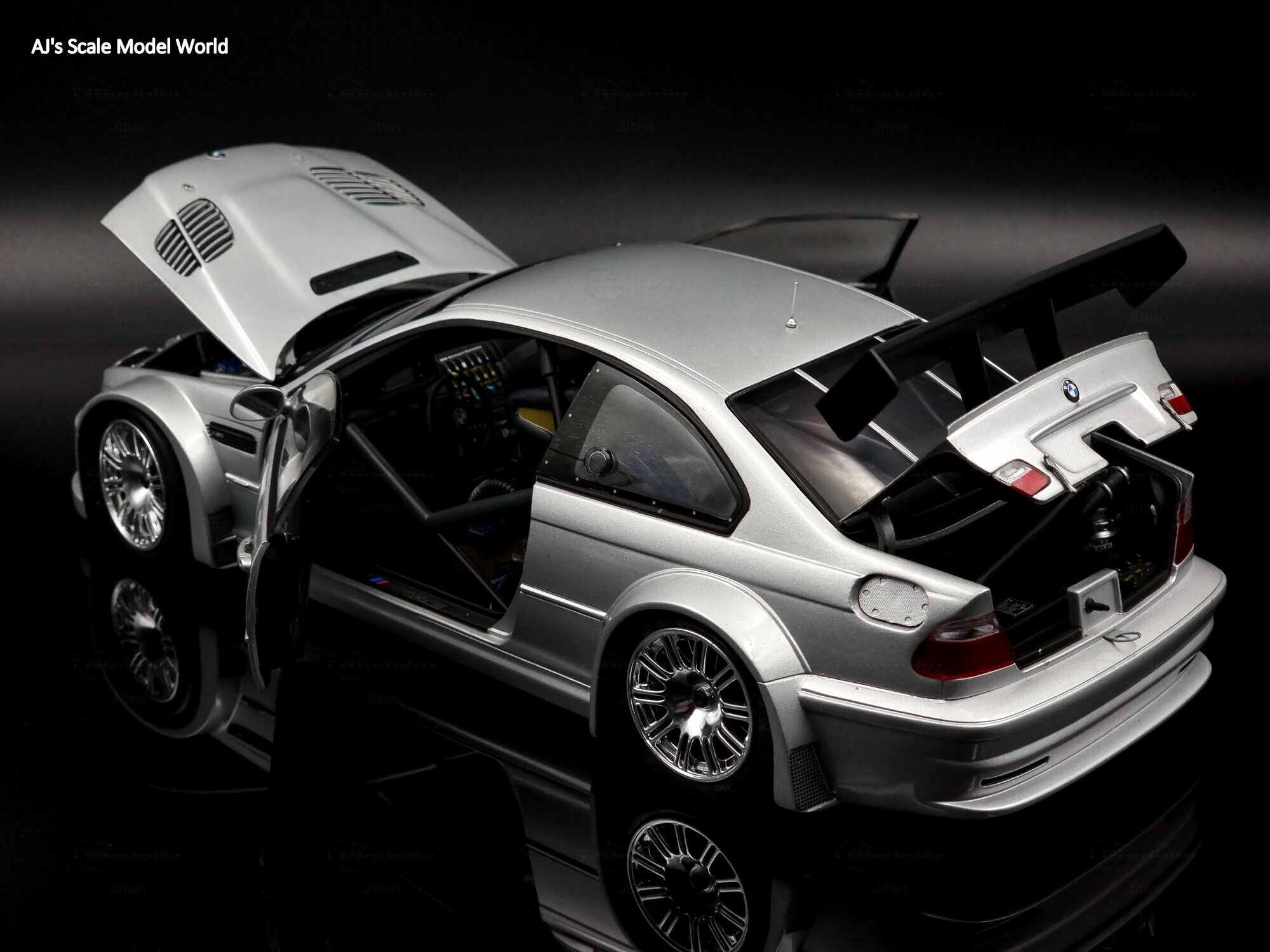 Die 1:18 Modellversion des BMW M3 GTR Street (E46), produziert von Minichamps und aus hochwertigem Druckgussmaterial gefertigt, fängt die essenziellen Designelemente des Originals brillant ein. Die silberne Lackierung kombiniert mit den auffälligen Lüftungsschlitzen auf der Motorhaube und den robusten Stoßfängern machen dieses Modell zu einem Hingucker in jeder Sammlung. Besonders die Detaillierung der Karosserie, inklusive der klar erkennbaren Kiemen in den Kotflügeln und das charakteristische "M" Emblem, sind bemerkenswert.