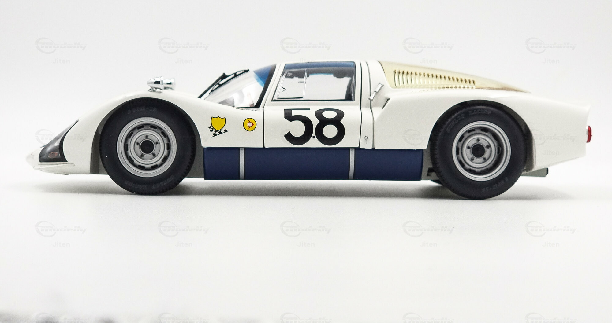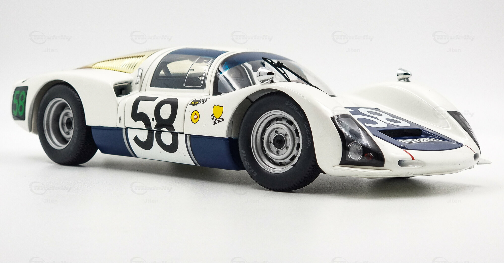 Das 1:18 Modell von Minichamps ist eine detaillierte Darstellung des ikonischen Porsche 906 K, hergestellt aus Die-Cast-Material. Dieses präzise gefertigte Modell zeichnet sich durch seine authentische Farbgebung und sorgfältig platzierte Decals aus. Auffallend sind die Lackierung in klassischem Weiß mit dunkelblauen Akzenten und die Startnummer 58, die das Modell stilvoll ziert. Im Miniaturformat lässt sich die Liebe zum Detail entdecken, von den akkuraten Proportionen bis hin zu den feinen Sponsorenaufklebern. Dies ist eine limitierte Edition von Minichamps, was die Exklusivität für Sammler noch erhöht. Besonders hervorzuheben ist die klare, mehrteilige Windschutzscheibe, die das Cockpit sowie die Inneneinrichtung perfekt zur Schau stellt.