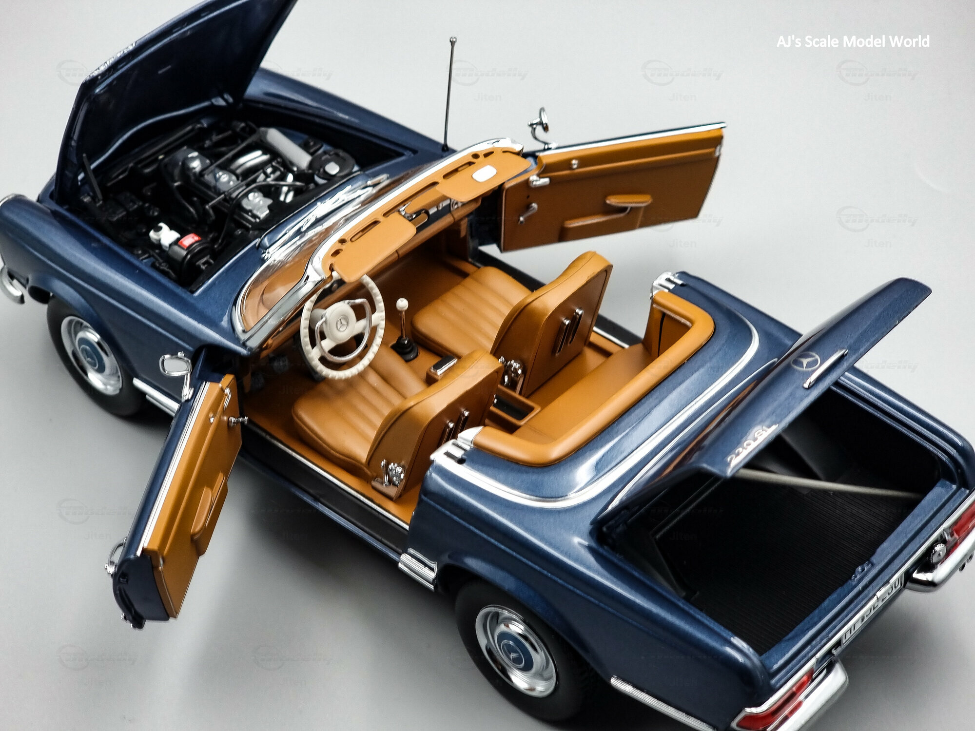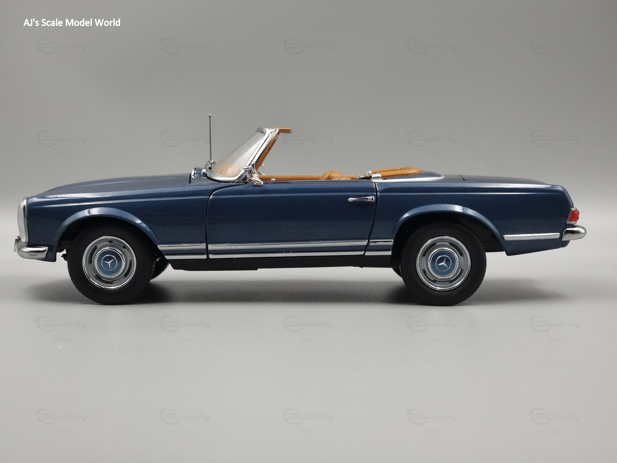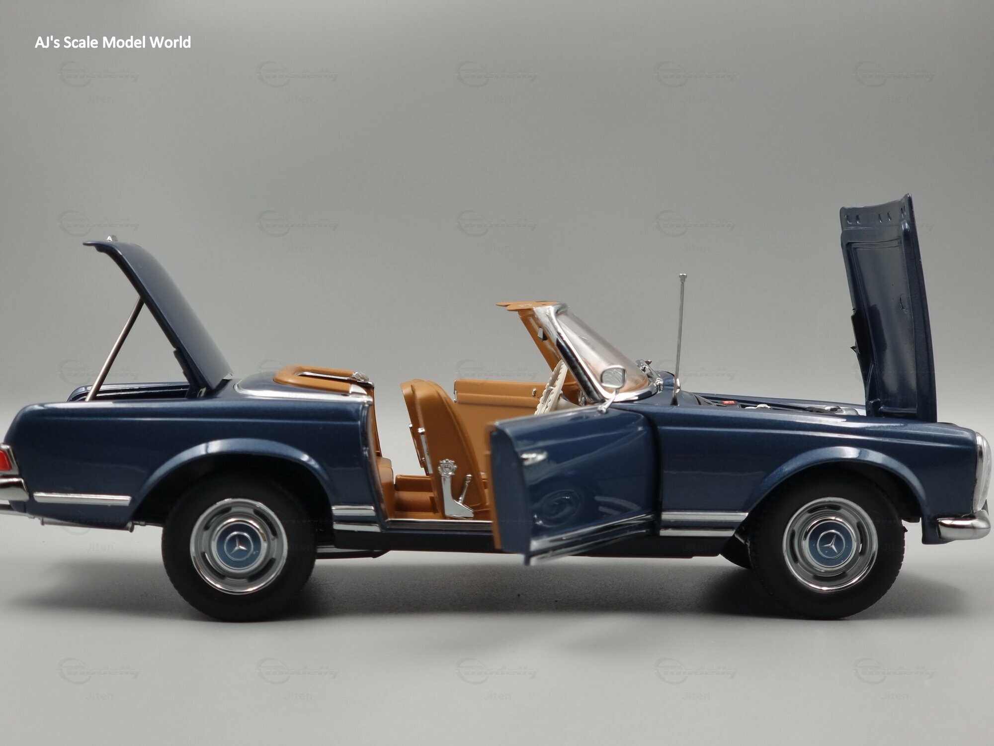 Das hier betrachtete Modell ist ein 1:18 Maßstab Modellauto von Norev, das aus dem Material Diecast gefertigt wurde. Das Modell ist Teil der Sammlung von Modelly Mitglied "Jiten". Dieses Modell zeigt eindrucksvoll die Detailgenauigkeit und Handwerkskunst, die in die Erstellung von Diecast-Modellen einfließt. Von den originalgetreuen Chromakzenten an der Frontpartie bis hin zu den zierlichen Mercedes-Emblemen auf den Radkappen spiegelt dieses Modell eine hohe Fertigungsqualität wider. Der dunkelblaue Lack sorgt für einen authentischen Look, während das abnehmbare Hardtop und das detaillierte Armaturenbrett die Features des Originals exakt nachbilden.
