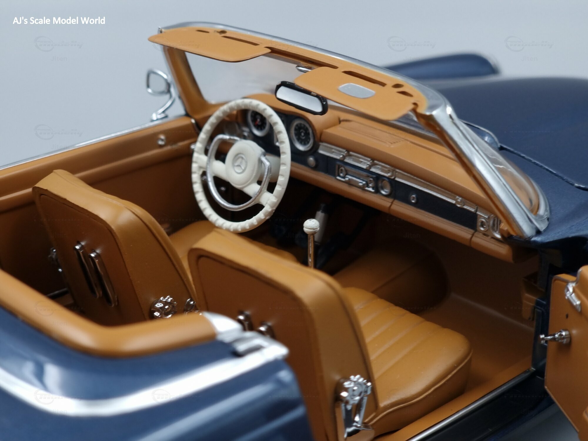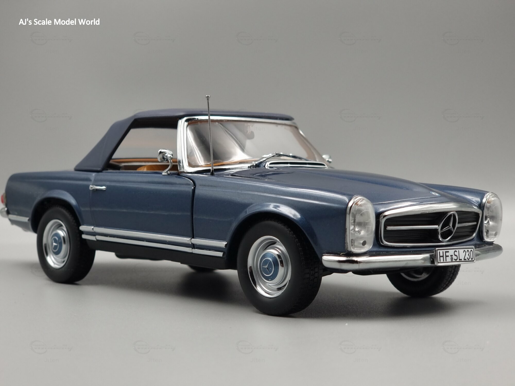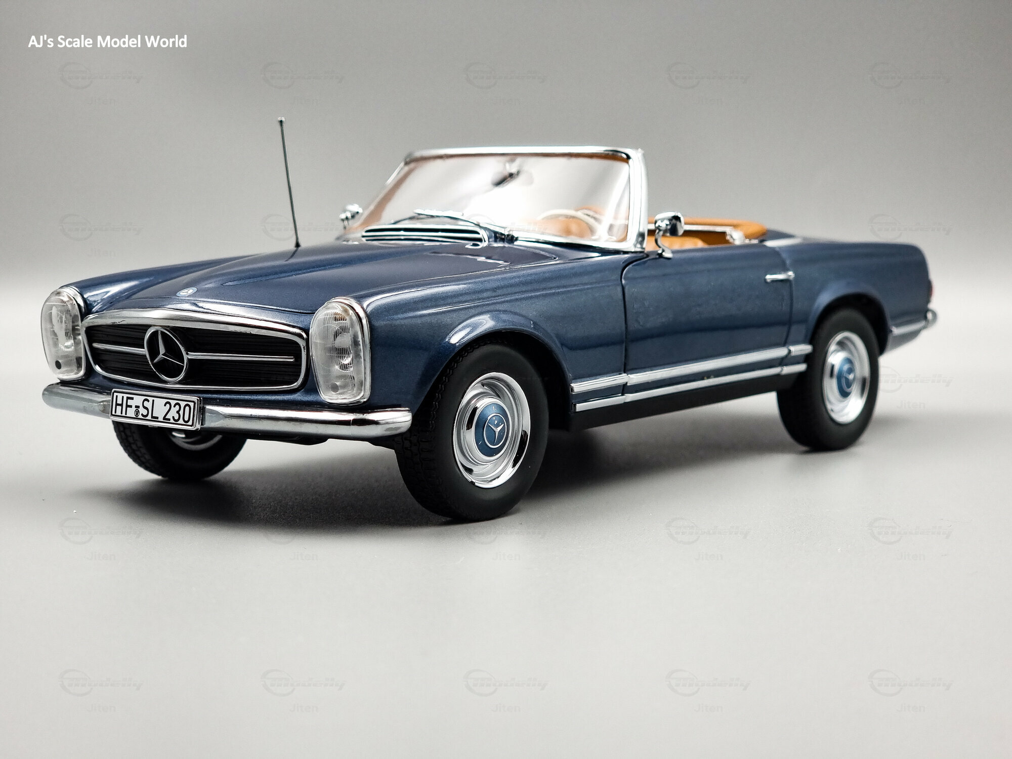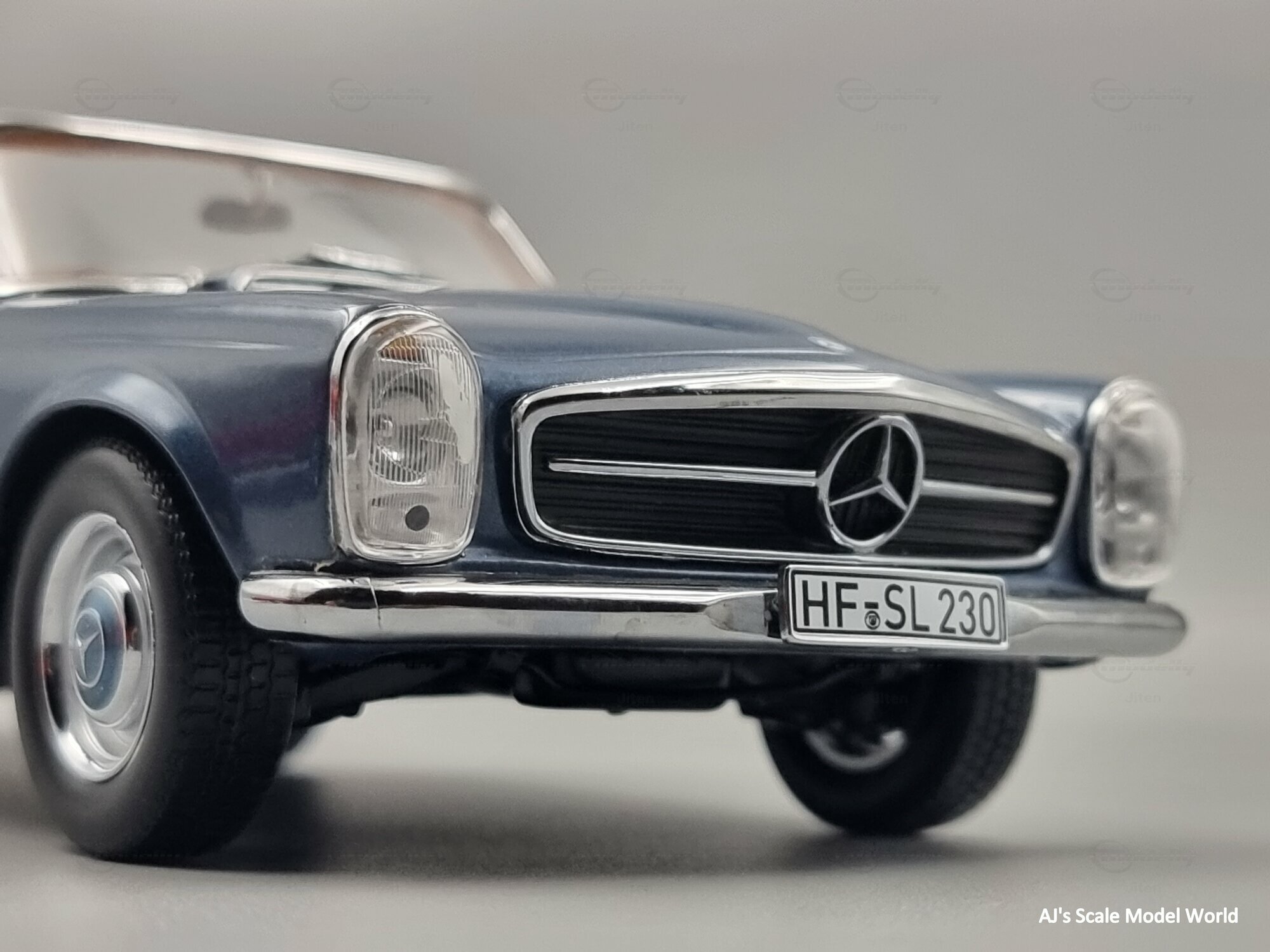 Das Modellauto von Norev im 1:18 Maßstab zeigt den Mercedes-Benz 230SL in einem detailgetreuen Miniaturformat. Die filigranen Details, wie das Lenkrad, die Sitze und die Armaturenbrett-Elemente, sind präzise nachgebildet und entsprechen dem Design des Originals. Die Räder drehen sich und die Reifen aus Gummi tragen das originale Mercedes-Benz Logo. Die Lackierung des Modells ist dunkelblau, was den eleganten Eindruck des Classic-Roadsters perfekt einfängt. Das abnehmbare Hardtop ist ebenfalls im Set enthalten, was es ermöglicht, den Wagen sowohl als Coupé als auch als Cabriolet zu präsentieren. Obwohl auf den vorliegenden Fotos keine spezifischen Customizations oder speziellen Merkmale bezüglich der Rims oder der Lackierung erkennbar sind, würde jeder Sammler den Wert und die Handwerkskunst dieses Modells schätzen.
