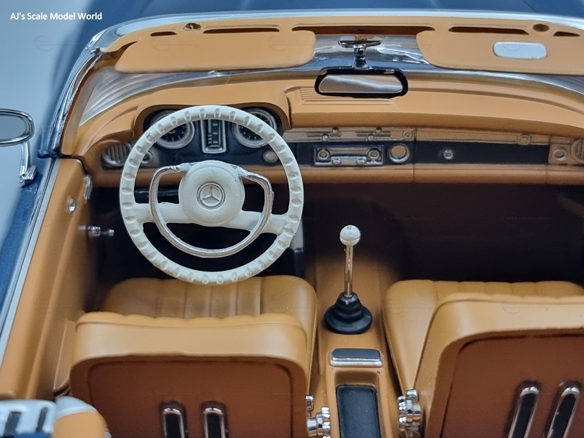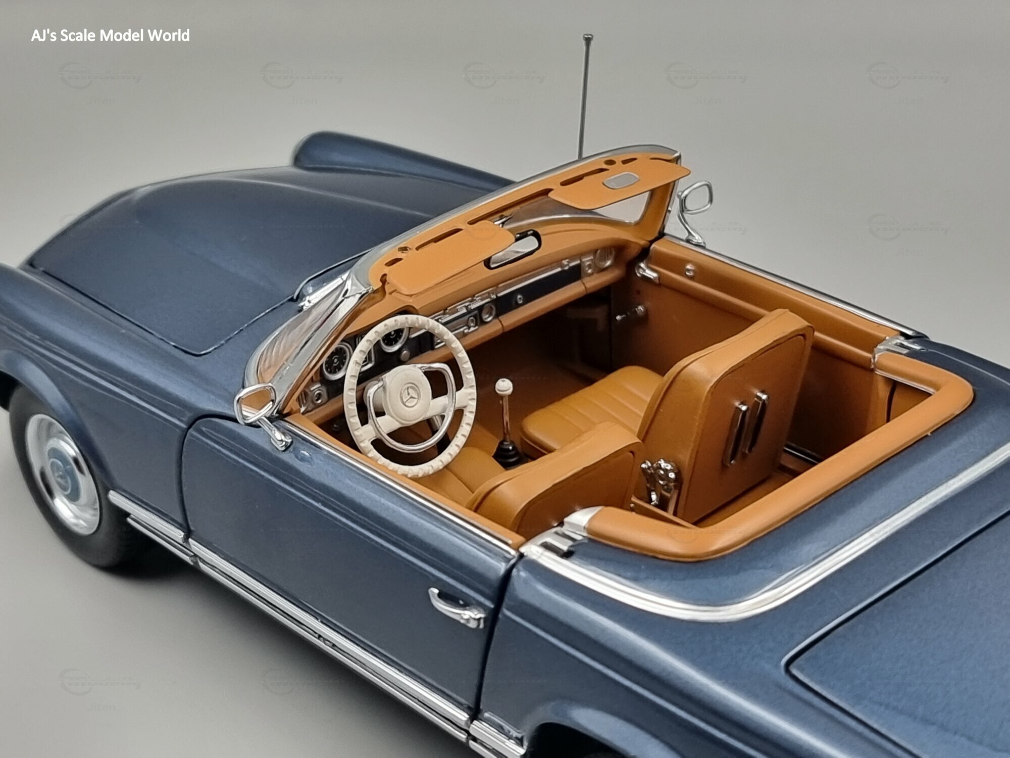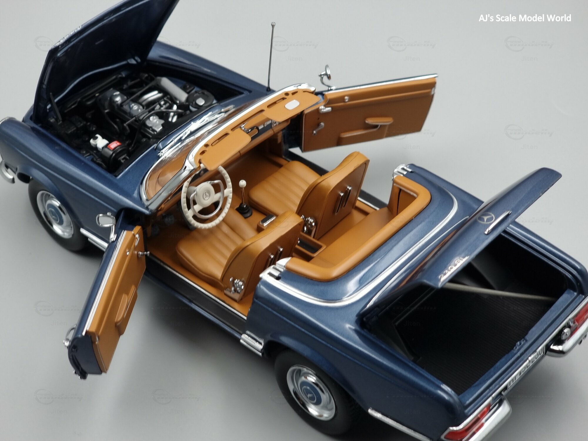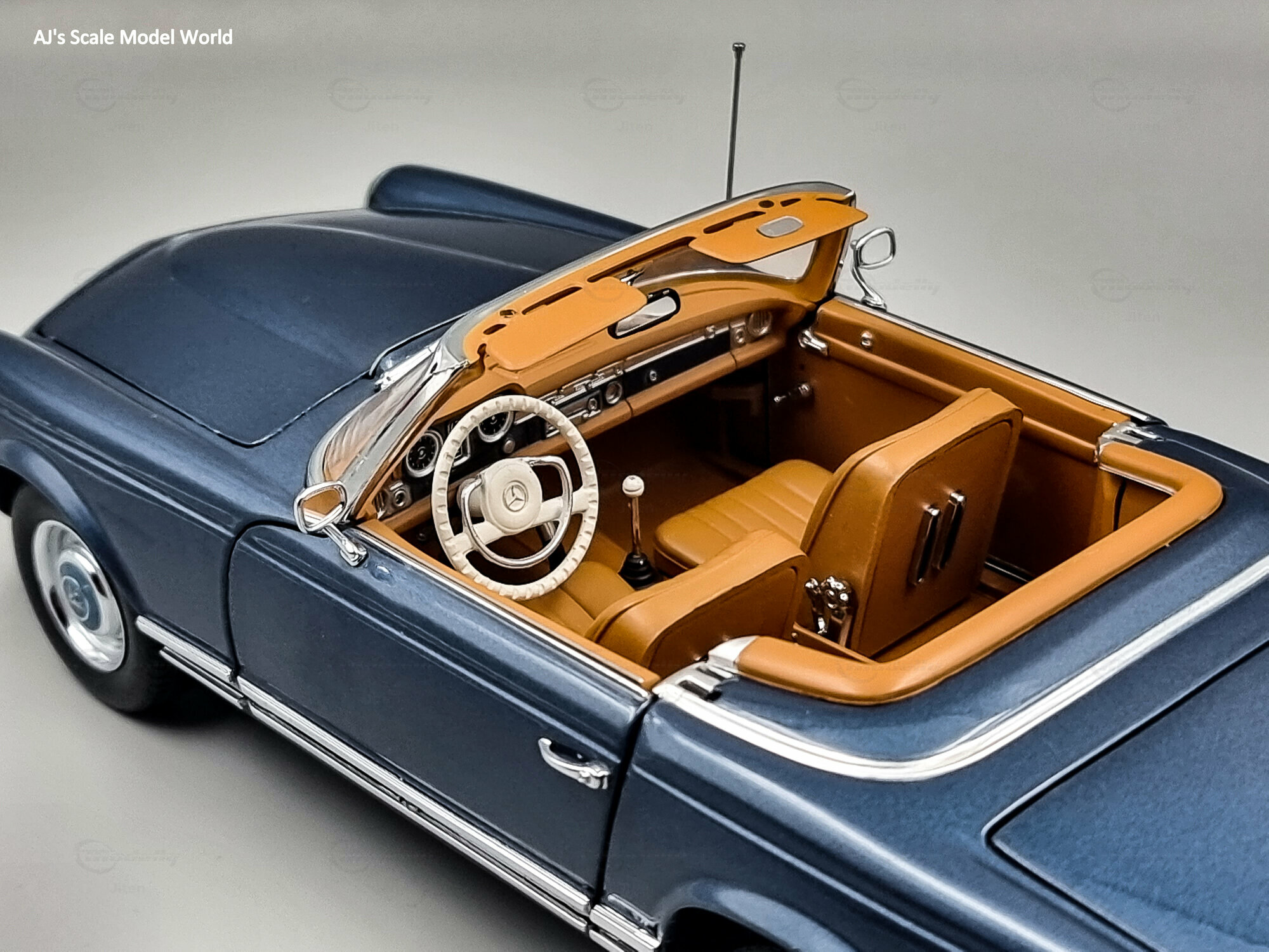 Das Modellauto von Norev im 1:18 Maßstab zeigt den Mercedes-Benz 230SL in einem detailgetreuen Miniaturformat. Die filigranen Details, wie das Lenkrad, die Sitze und die Armaturenbrett-Elemente, sind präzise nachgebildet und entsprechen dem Design des Originals. Die Räder drehen sich und die Reifen aus Gummi tragen das originale Mercedes-Benz Logo. Die Lackierung des Modells ist dunkelblau, was den eleganten Eindruck des Classic-Roadsters perfekt einfängt. Das abnehmbare Hardtop ist ebenfalls im Set enthalten, was es ermöglicht, den Wagen sowohl als Coupé als auch als Cabriolet zu präsentieren. Obwohl auf den vorliegenden Fotos keine spezifischen Customizations oder speziellen Merkmale bezüglich der Rims oder der Lackierung erkennbar sind, würde jeder Sammler den Wert und die Handwerkskunst dieses Modells schätzen.
