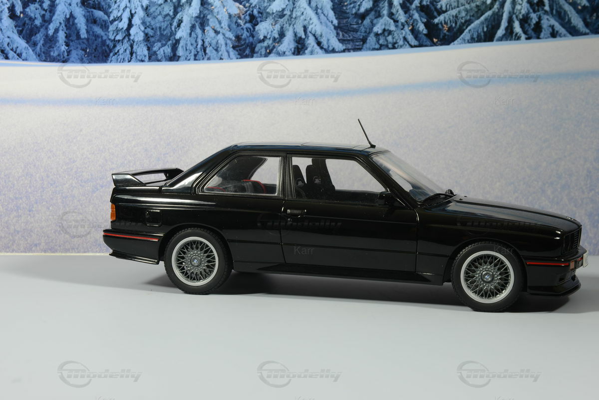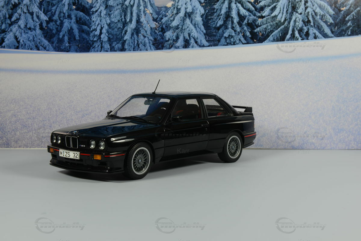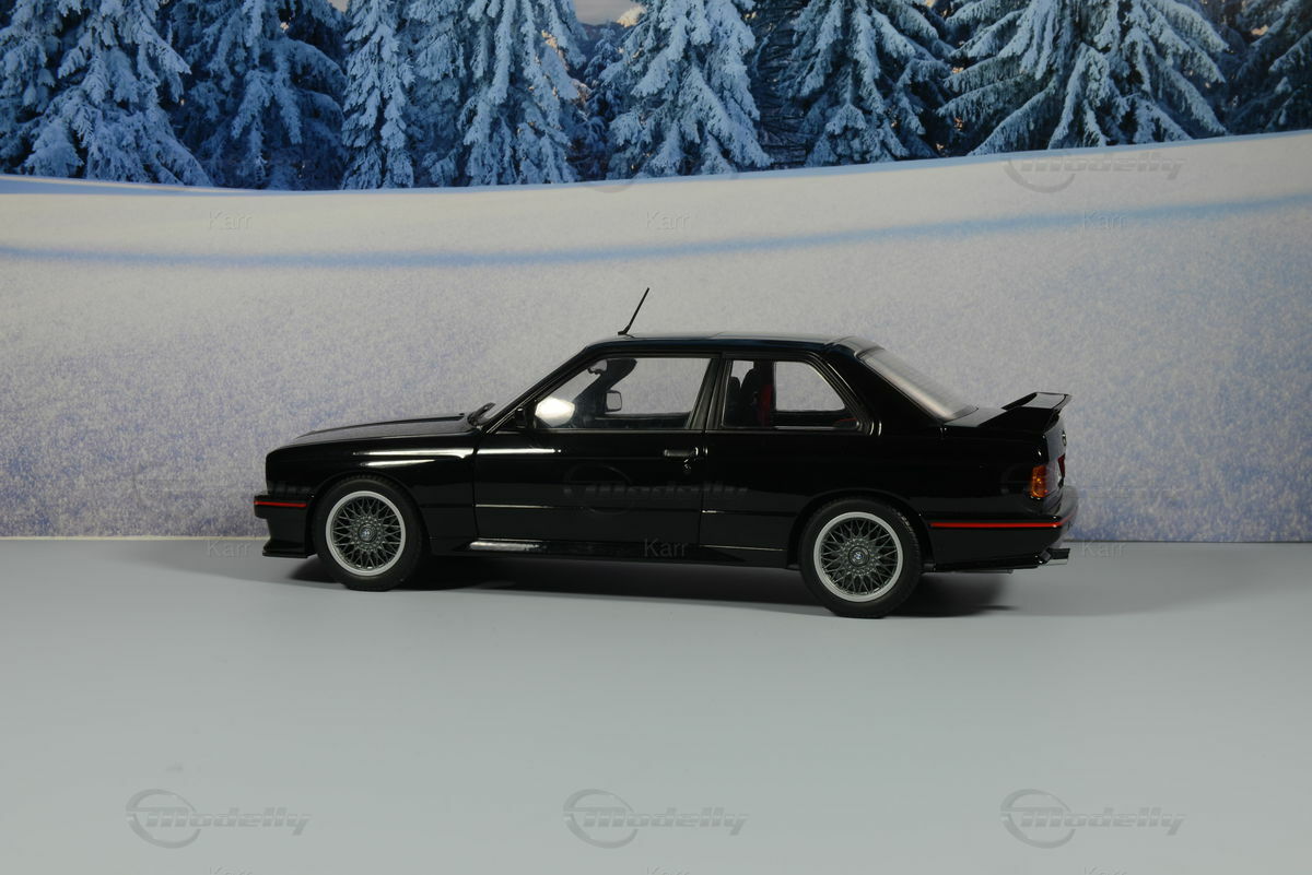 Die hier gezeigte Miniatur des BMW E30 M3 ist ein hochwertiges 1:18-Modell von AUTOart, gefertigt aus diecast-Material. Das Modell, das Teil der Sammlung des Modelly-Mitglieds "Karr" ist, besticht durch seine Detailgenauigkeit und die hochwertige Verarbeitung. Das Modell im Maßstab 1:18 ist im originalgetreuen Schwarz lackiert, was die sportliche Eleganz des Wagens unterstreicht. Die Karosserie des Modells zeigt präzise Details, wie die roten Zierlinien und die typischen BMW-Nieren. Besonders bemerkenswert sind die detailliert nachgebildeten Felgen und die realistisch wirkenden Reifen, die dem Modell ein authentisches Erscheinungsbild verleihen.