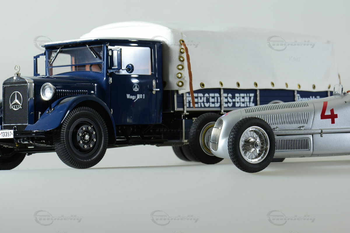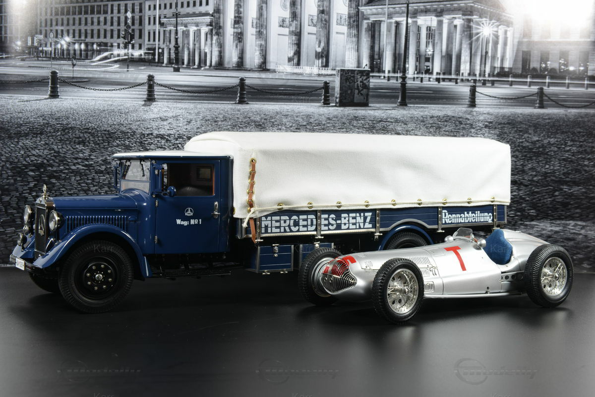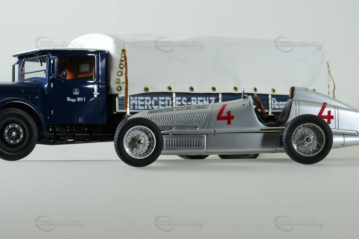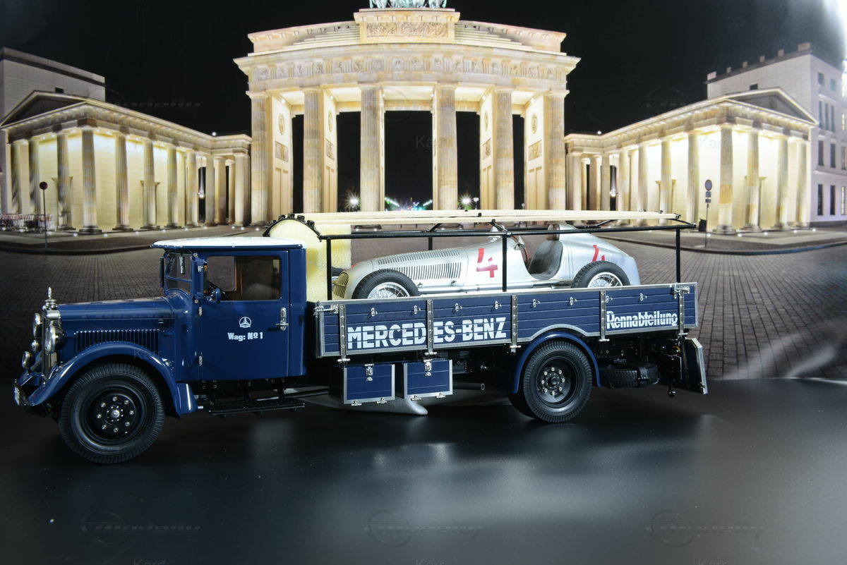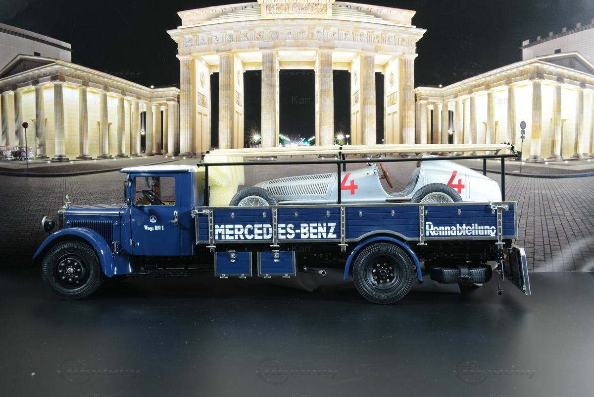 Das präsentierte Modellauto, basierend auf dem Mercedes-Benz Lo 2750 Renntransporter, ist ein exaktes Nachbild des Originals im Maßstab 1:18 und wurde von CMC gefertigt. Das Modell besticht durch seine hohe Detailtreue und ist aus hochwertigem Diecast-Material hergestellt. Zu den bemerkenswerten Details des Modells gehören die exakt nachgebildeten Reifen, die detaillierte Innenausstattung mit angedeuteten Ziffernblättern und der aufklappbare Kofferraum. Die lackierten Metallteile und die präzise Verarbeitung machen dieses Modell zu einem Highlight jeder Modellautosammlung. Besonders zu erwähnen sind die stramm gespannten Spanngurte auf der Ladefläche sowie die Kennzeichnung als "Wag: Nr 1" auf den Fahrzeugtüren, die den historischen Renn-Charakter des Modells unterstreichen. Der Sammler "Karr" hat dieses detailreiche Modell in seiner Sammlung, das durch die sorgfältig nachgebildeten Details wie Radkappen und Felgen seine historische Bedeutung besonders zur Geltung bringen. Die Kombination aus authentischer Lackierung, betriebsfähigen Türen und fein bearbeiteten Oberflächen macht dieses Modell zu einem unverzichtbaren Sammlerstück für jeden Modellautofan.