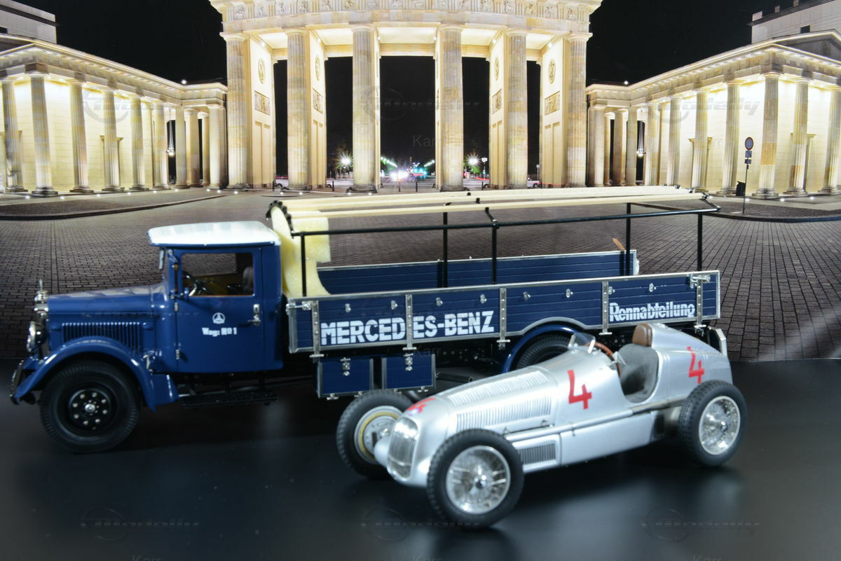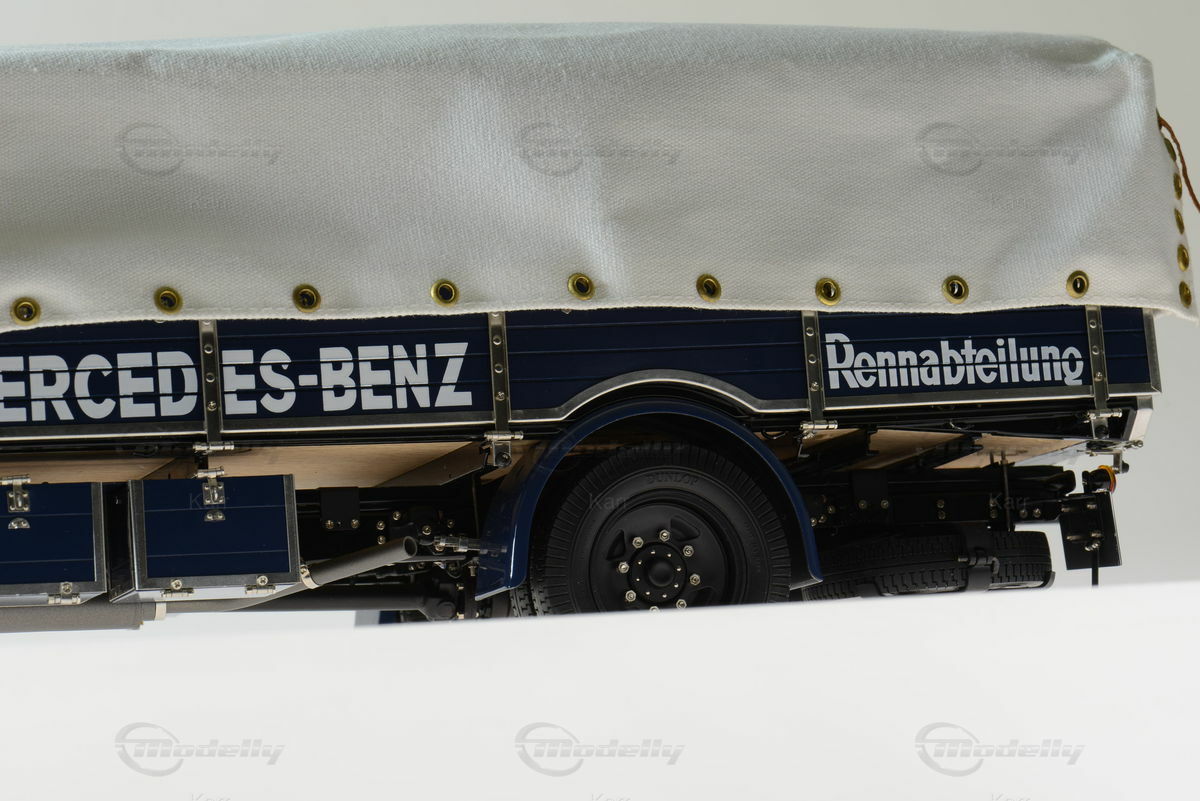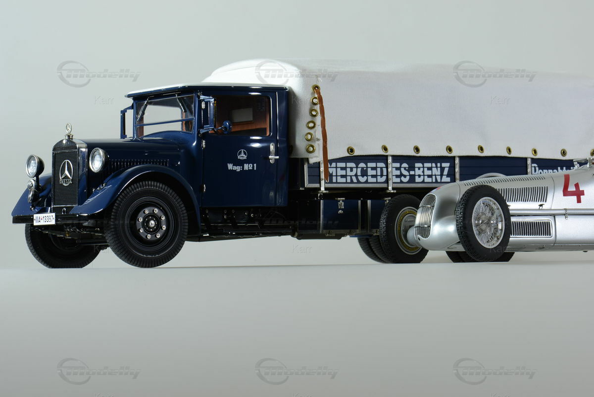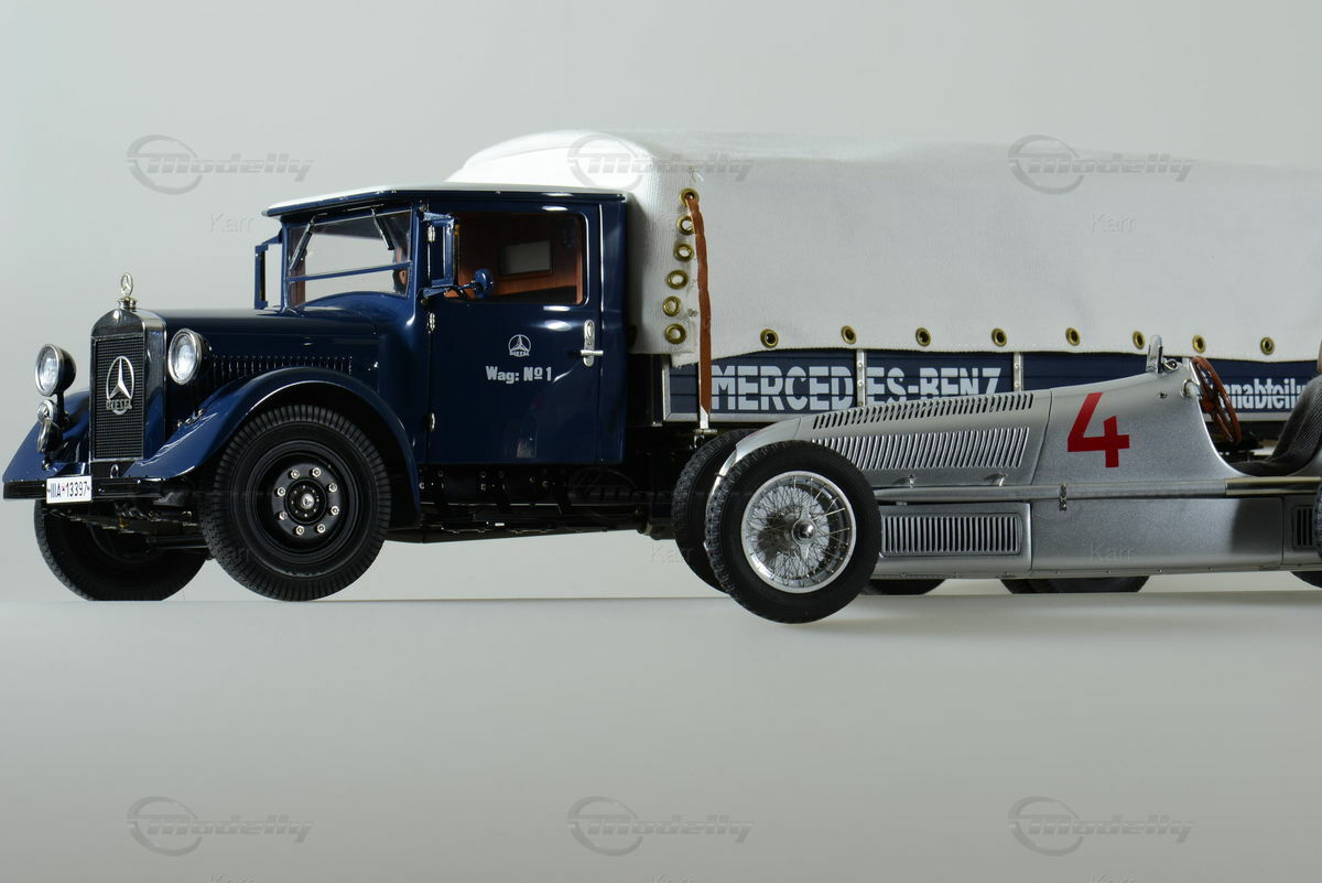 Das präsentierte Modellauto, basierend auf dem Mercedes-Benz Lo 2750 Renntransporter, ist ein exaktes Nachbild des Originals im Maßstab 1:18 und wurde von CMC gefertigt. Das Modell besticht durch seine hohe Detailtreue und ist aus hochwertigem Diecast-Material hergestellt. Zu den bemerkenswerten Details des Modells gehören die exakt nachgebildeten Reifen, die detaillierte Innenausstattung mit angedeuteten Ziffernblättern und der aufklappbare Kofferraum. Die lackierten Metallteile und die präzise Verarbeitung machen dieses Modell zu einem Highlight jeder Modellautosammlung. Besonders zu erwähnen sind die stramm gespannten Spanngurte auf der Ladefläche sowie die Kennzeichnung als "Wag: Nr 1" auf den Fahrzeugtüren, die den historischen Renn-Charakter des Modells unterstreichen. Der Sammler "Karr" hat dieses detailreiche Modell in seiner Sammlung, das durch die sorgfältig nachgebildeten Details wie Radkappen und Felgen seine historische Bedeutung besonders zur Geltung bringen. Die Kombination aus authentischer Lackierung, betriebsfähigen Türen und fein bearbeiteten Oberflächen macht dieses Modell zu einem unverzichtbaren Sammlerstück für jeden Modellautofan.
