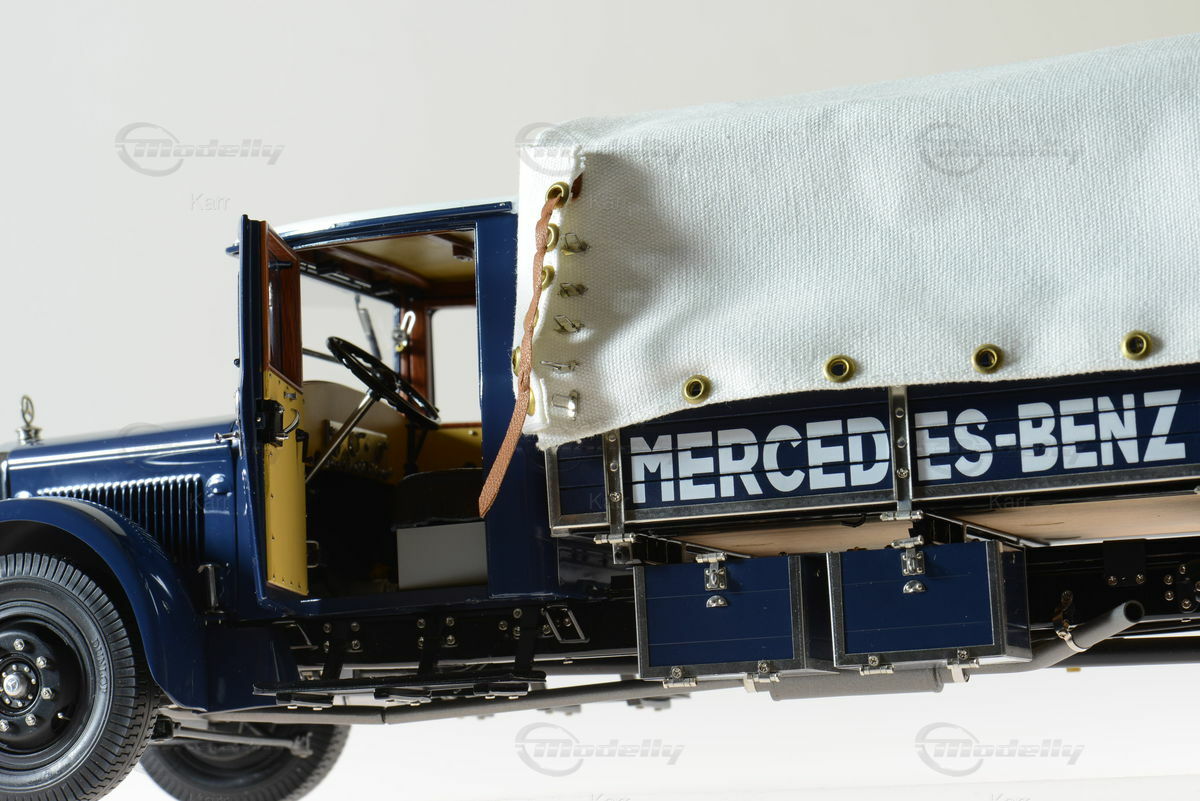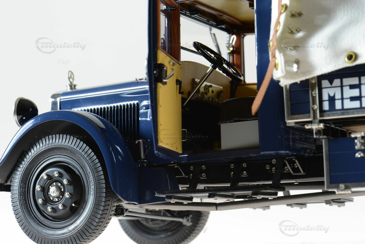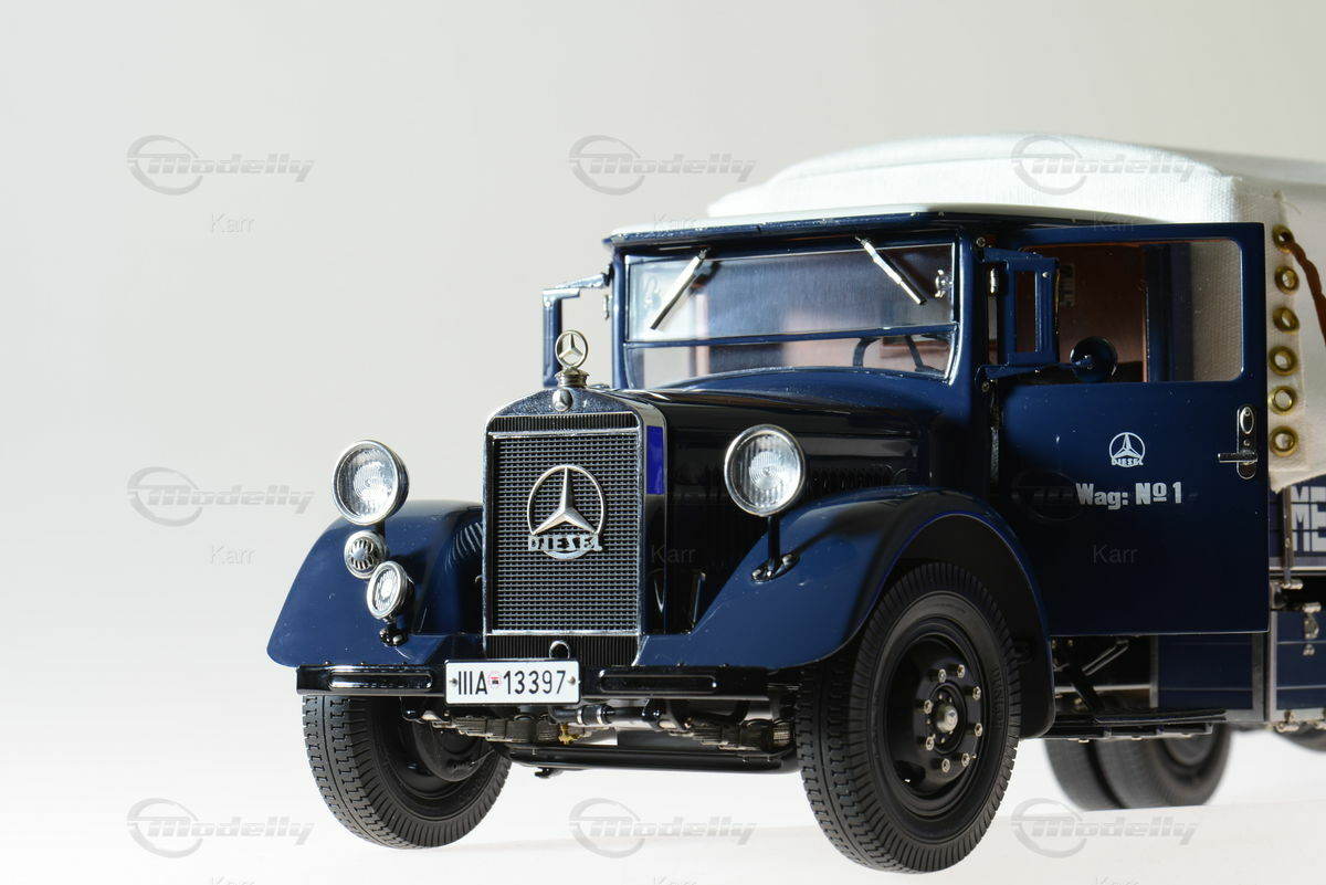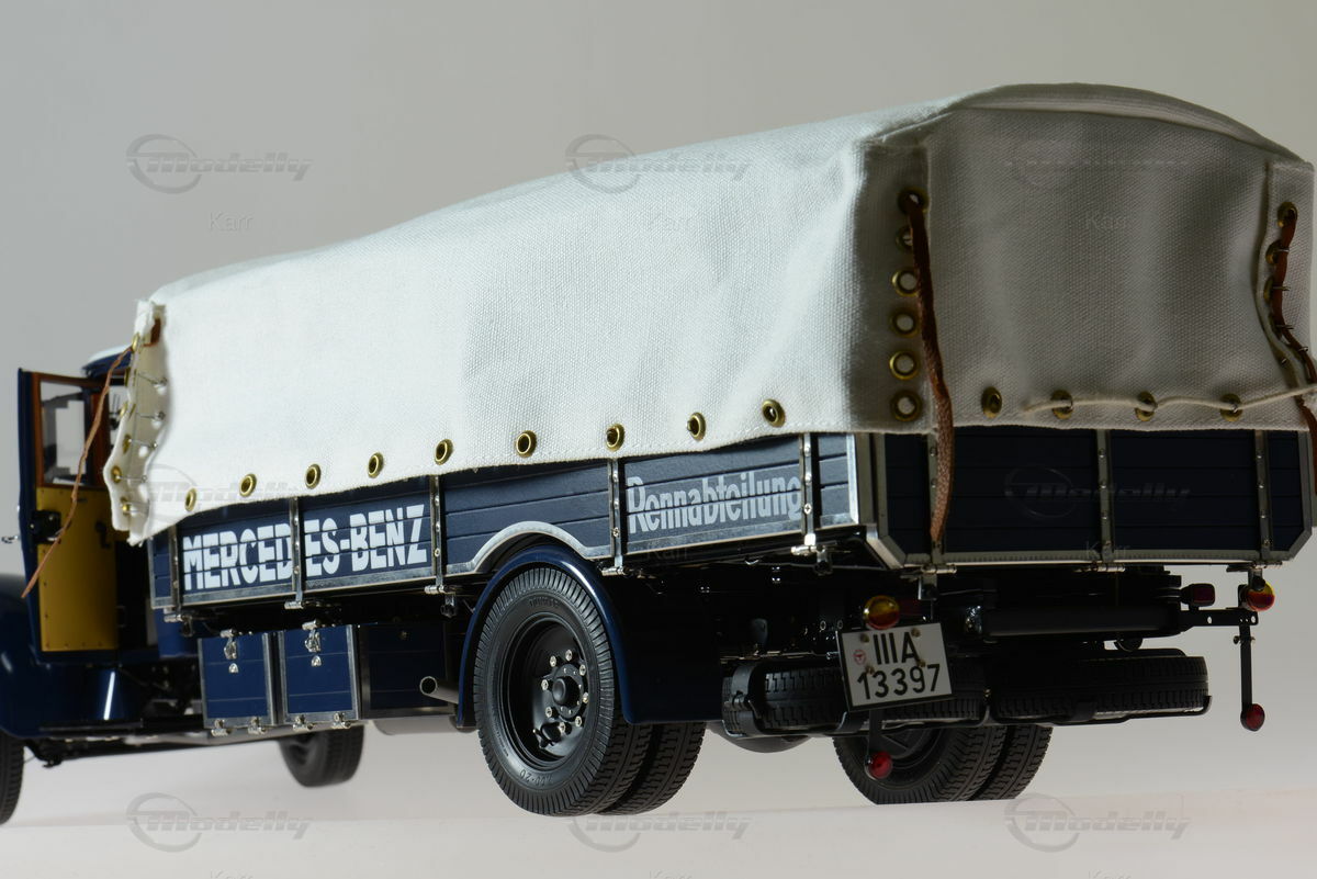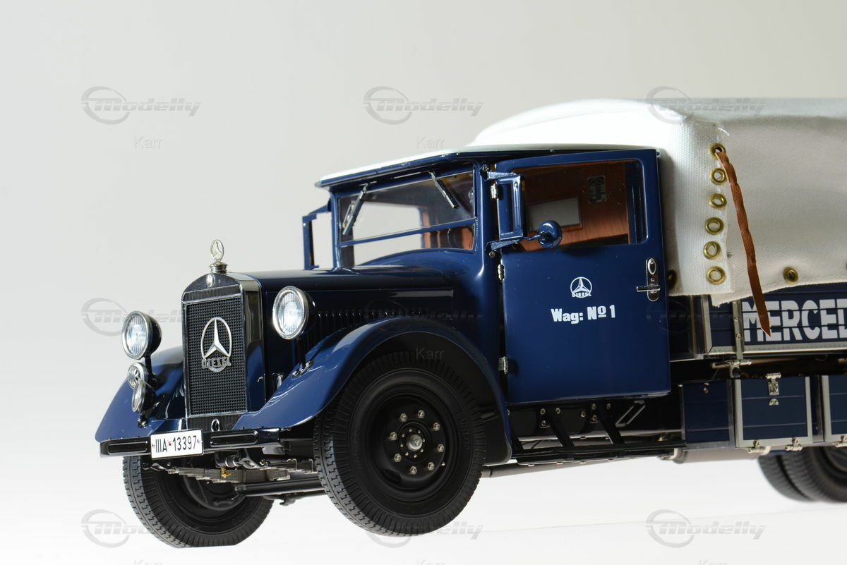 Das präsentierte Modellauto, basierend auf dem Mercedes-Benz Lo 2750 Renntransporter, ist ein exaktes Nachbild des Originals im Maßstab 1:18 und wurde von CMC gefertigt. Das Modell besticht durch seine hohe Detailtreue und ist aus hochwertigem Diecast-Material hergestellt. Zu den bemerkenswerten Details des Modells gehören die exakt nachgebildeten Reifen, die detaillierte Innenausstattung mit angedeuteten Ziffernblättern und der aufklappbare Kofferraum. Die lackierten Metallteile und die präzise Verarbeitung machen dieses Modell zu einem Highlight jeder Modellautosammlung. Besonders zu erwähnen sind die stramm gespannten Spanngurte auf der Ladefläche sowie die Kennzeichnung als "Wag: Nr 1" auf den Fahrzeugtüren, die den historischen Renn-Charakter des Modells unterstreichen. Der Sammler "Karr" hat dieses detailreiche Modell in seiner Sammlung, das durch die sorgfältig nachgebildeten Details wie Radkappen und Felgen seine historische Bedeutung besonders zur Geltung bringen. Die Kombination aus authentischer Lackierung, betriebsfähigen Türen und fein bearbeiteten Oberflächen macht dieses Modell zu einem unverzichtbaren Sammlerstück für jeden Modellautofan.