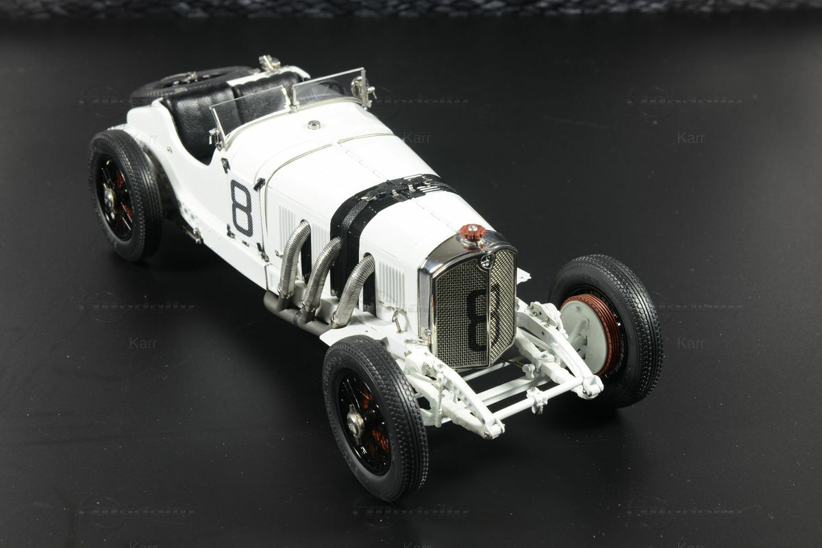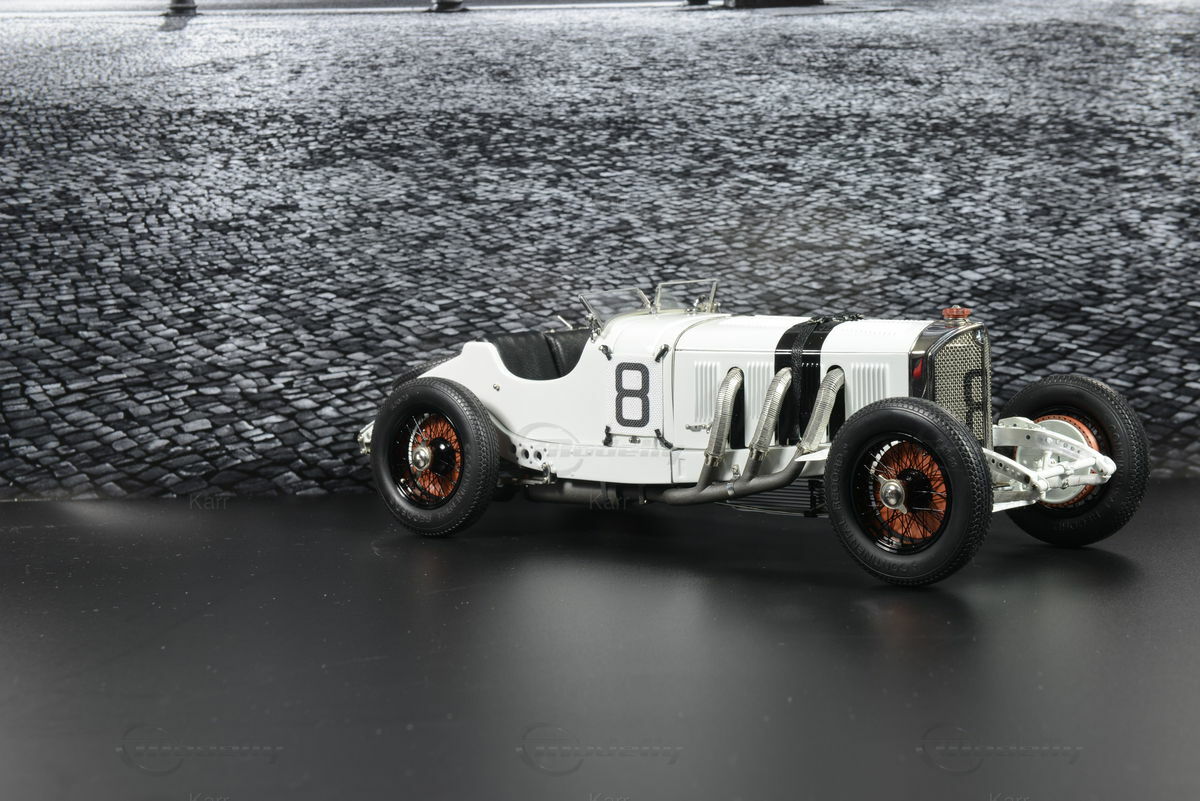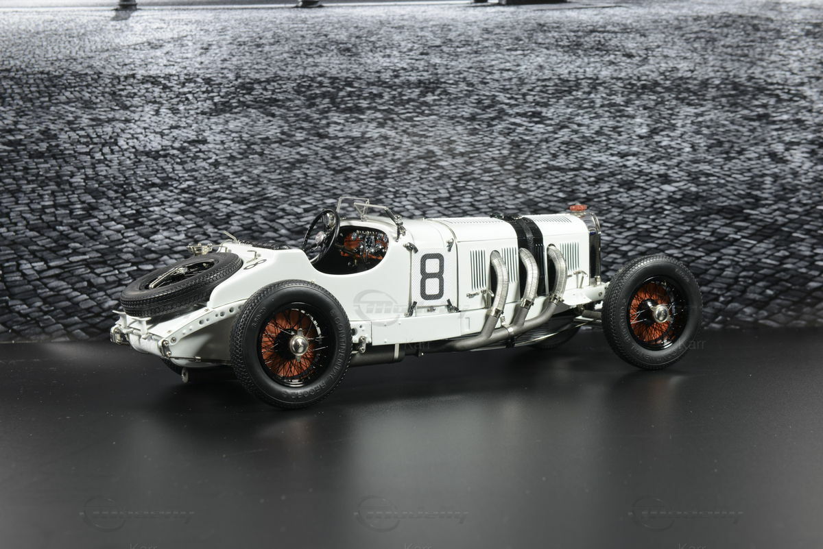 Die Miniatur von CMC im Maßstab 1:18 ist ein wahres Meisterwerk und ein Muss für jeden Sammler und Liebhaber von Modellautos. Auf den Fotos kann man die akribische Aufmerksamkeit für Details erkennen, die in diese Nachbildung eingeflossen sind. Der Kühlergrill, die Speichenräder und die detaillierte Nachbildung des Motors spiegeln die Exzellenz und Präzision wider, die in diesem Modell stecken. Das markante Nummernschild "8" und das klassische Mercedes-Stern-Emblem auf dem Kühlergrill verleihen dem Modell einen authentischen Look. Jedes kleine Detail, von den Auspuffrohren bis zu den Lederriemen, die die Motorhaube sichern, ist perfekt proportioniert und detailliert umgesetzt. Diese Miniatur ist wirklich eine Hommage an einen der großen Klassiker der Automobilgeschichte.