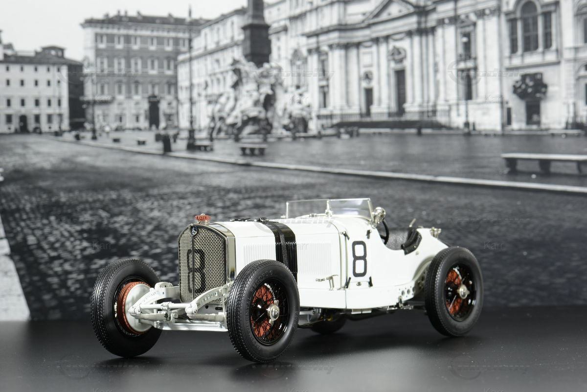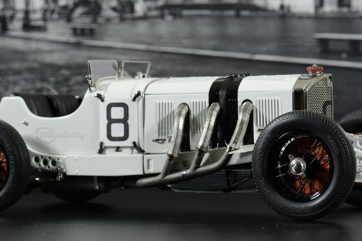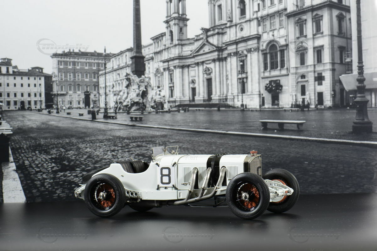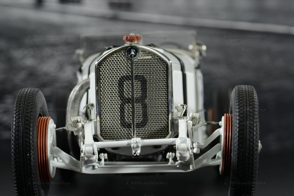 Die Miniatur von CMC im Maßstab 1:18 ist ein wahres Meisterwerk und ein Muss für jeden Sammler und Liebhaber von Modellautos. Auf den Fotos kann man die akribische Aufmerksamkeit für Details erkennen, die in diese Nachbildung eingeflossen sind. Der Kühlergrill, die Speichenräder und die detaillierte Nachbildung des Motors spiegeln die Exzellenz und Präzision wider, die in diesem Modell stecken. Das markante Nummernschild "8" und das klassische Mercedes-Stern-Emblem auf dem Kühlergrill verleihen dem Modell einen authentischen Look. Jedes kleine Detail, von den Auspuffrohren bis zu den Lederriemen, die die Motorhaube sichern, ist perfekt proportioniert und detailliert umgesetzt. Diese Miniatur ist wirklich eine Hommage an einen der großen Klassiker der Automobilgeschichte.