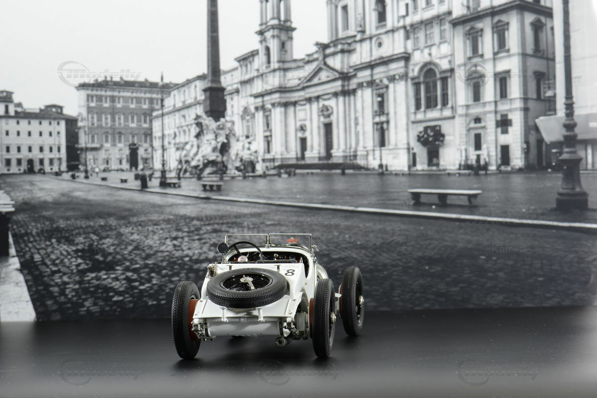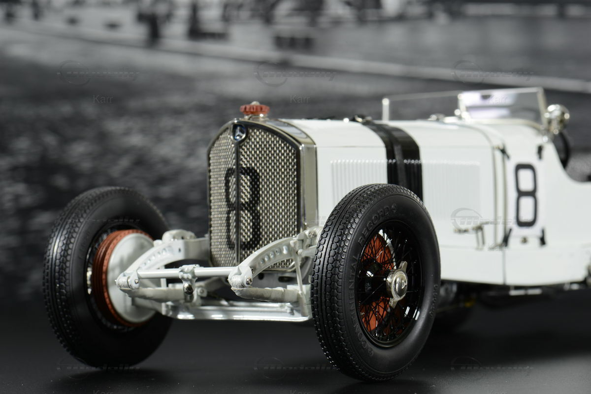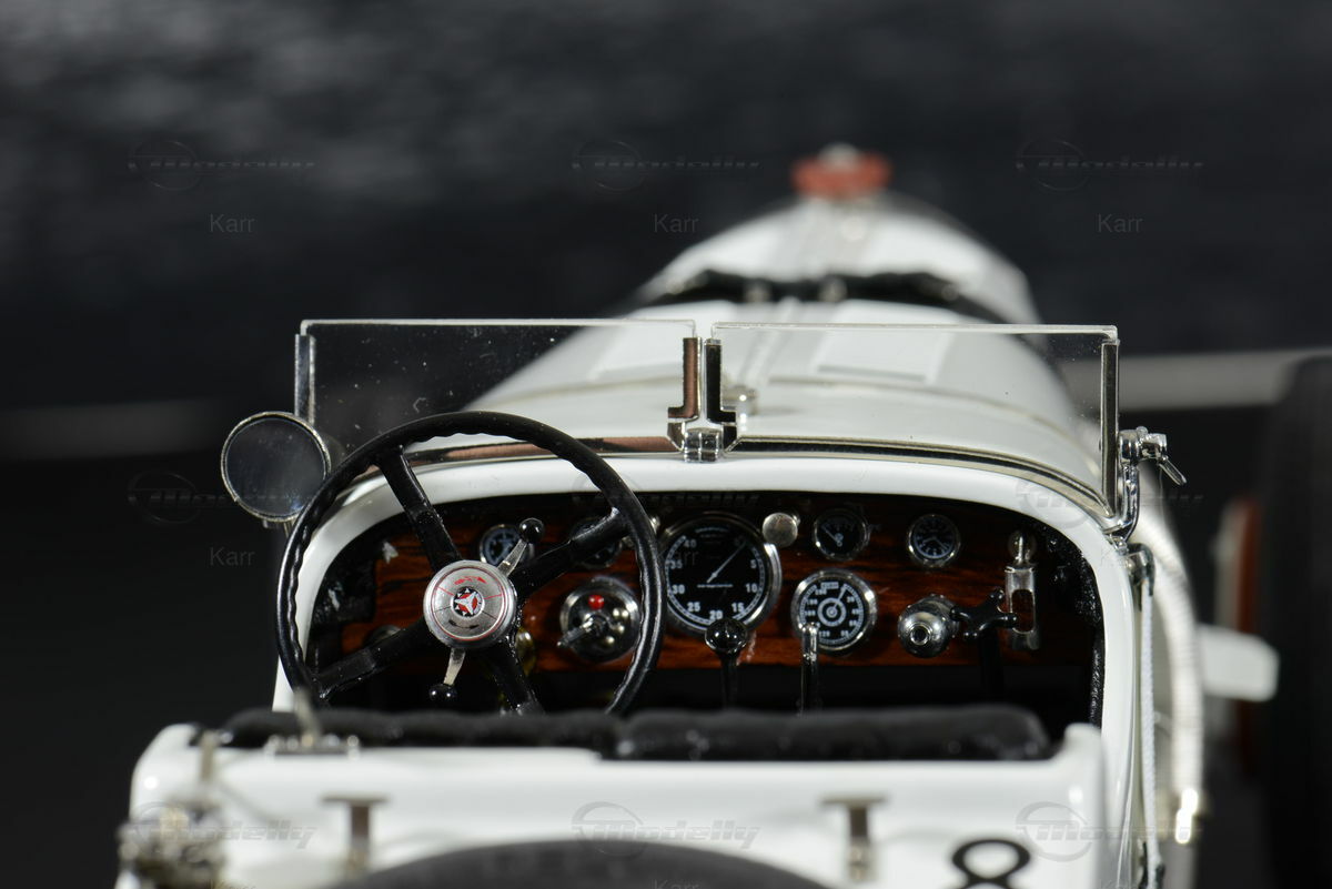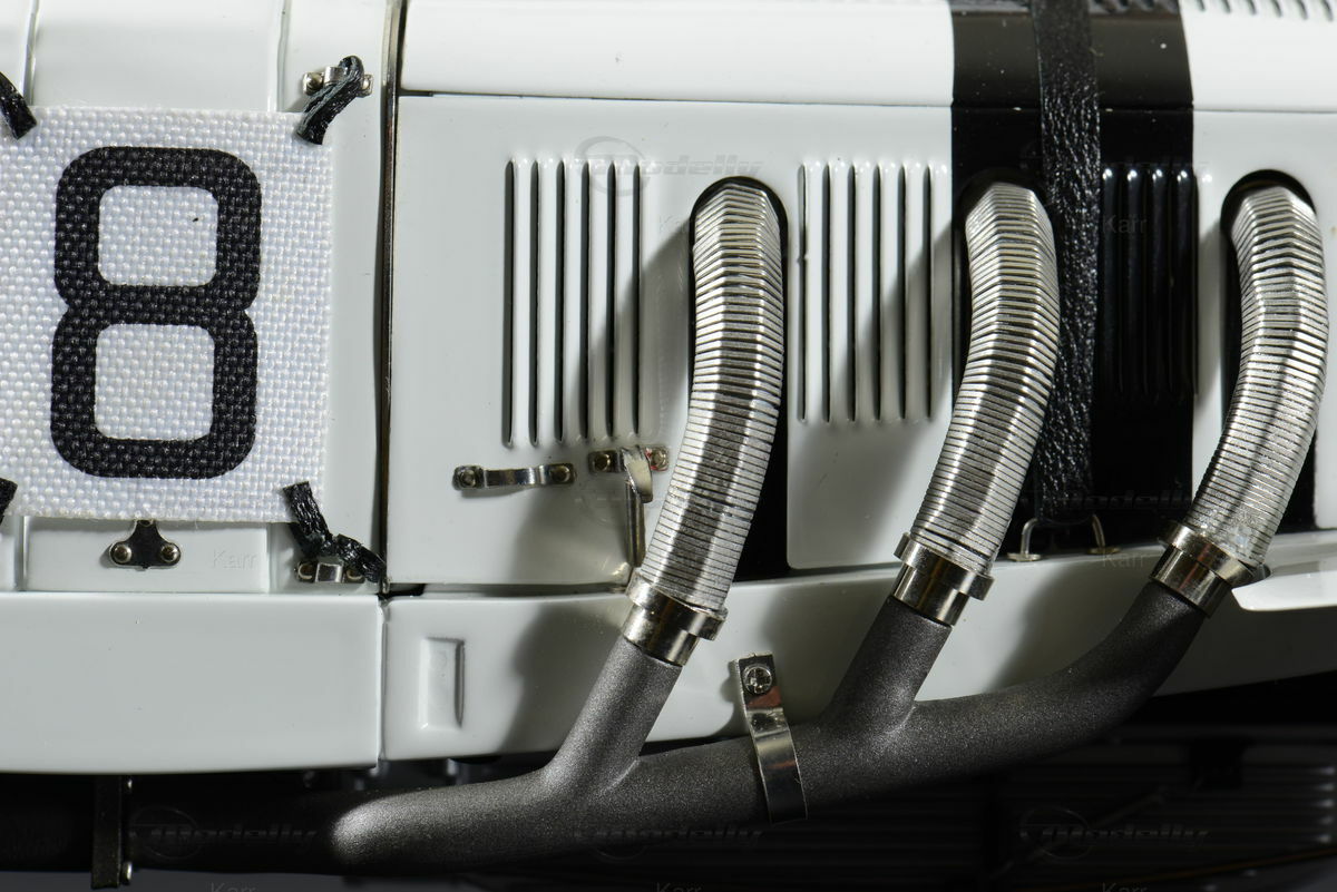 Diese originalgetreu nachgebildete 1:18-Modellversion des Mercedes-Benz SSKL wurde von CMC gefertigt, einem renommierten Hersteller von Modellautos. Die Miniatur ist eine präzise Replik und zeigt mit beeindruckender Detailgenauigkeit die charakteristischen Merkmale des Originals. Das Modell ist aus hochwertigem Diecast-Material gefertigt, was ihm Festigkeit und Detailtreue verleiht. Jedes Detail, von der Lackierung bis hin zu den Sponsorenaufklebern, ist sorgfältig nachgebildet. Das Auto aus der Sammlung von Modelly-Mitglied "Karr" zeigt die markante weiße Lackierung mit der Nummer "8" und den typischen Rennstreifen, die den SSKL in der Rennszene so bekannt gemacht haben. Auch die aufwändig gestalteten Felgen und die exakte Nachbildung des Motors sind beeindruckend.