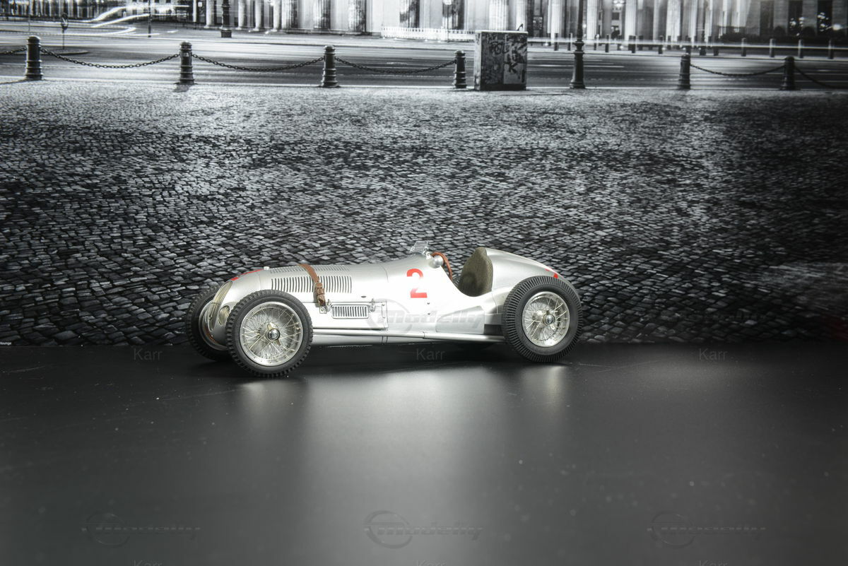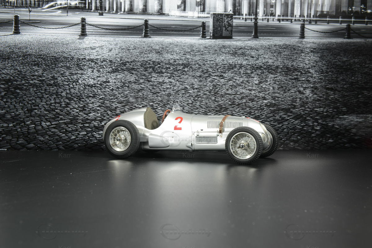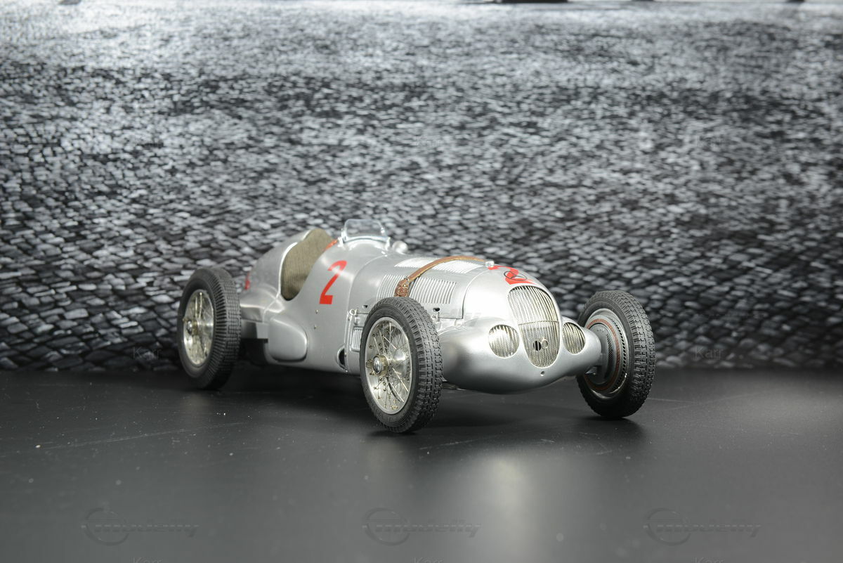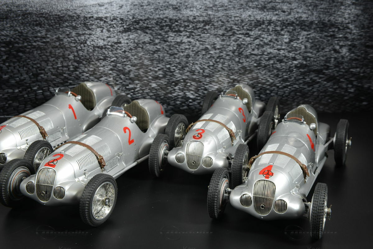Für Modellautosammler weltweit ist die Nachbildung des Mercedes-Benz W125 von CMC ein beliebtes Sammlerstück im Maßstab 1:18, wie sie sich auch in der Kollektion von Modelly-Mitglied "Karr" befindet. Das hier gezeigte Modell überzeugt durch eine hohe Originaltreue und umfasst erkennbare Details wie das silberne Karosseriedesign, die rote Startnummer "2" und realistische Nachbildungen der Speichenräder. Gut sichtbar sind auch die feinen Lederriemen, die die Motorhaube sichern, sowie der Mercedes-Stern an der Front. Die lackierte Oberfläche ist in einem klassischen Silber gehalten – dem legendären Silberpfeil-Look, der in den 1930ern zum Markenzeichen deutscher Grand-Prix-Wagen wurde. Die Miniatur aus dem Hause CMC besteht aus dem Material Diecast, wodurch eine robuste und wertige Haptik sichergestellt wird. Die Bemalung und Gestaltung orientiert sich eng am Vorbild aus dem Jahr 1937 und stellt die Schönheit und Schlichtheit dieses bedeutenden Rennwagens detailgenau dar. Auch die proportionierte Umsetzung der Lüftungsschlitze und der Innenraum mit schlichter Fahrerkabine, charakteristischen Tachometern und schmalem Sitz werden am Modell dargestellt. Alles in allem ist dieses 1:18 Diecast-Modell, wie es im Besitz von "Karr" gezeigt wird, sowohl für Einsteiger als auch für spezialisierte Sammler durch seine Präzision und seinen hohen Wiedererkennungswert ein interessantes Exponat.