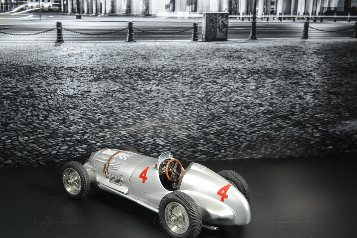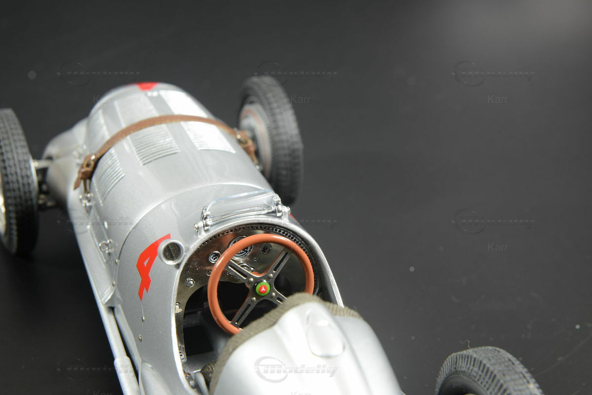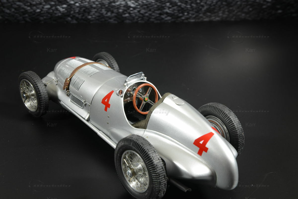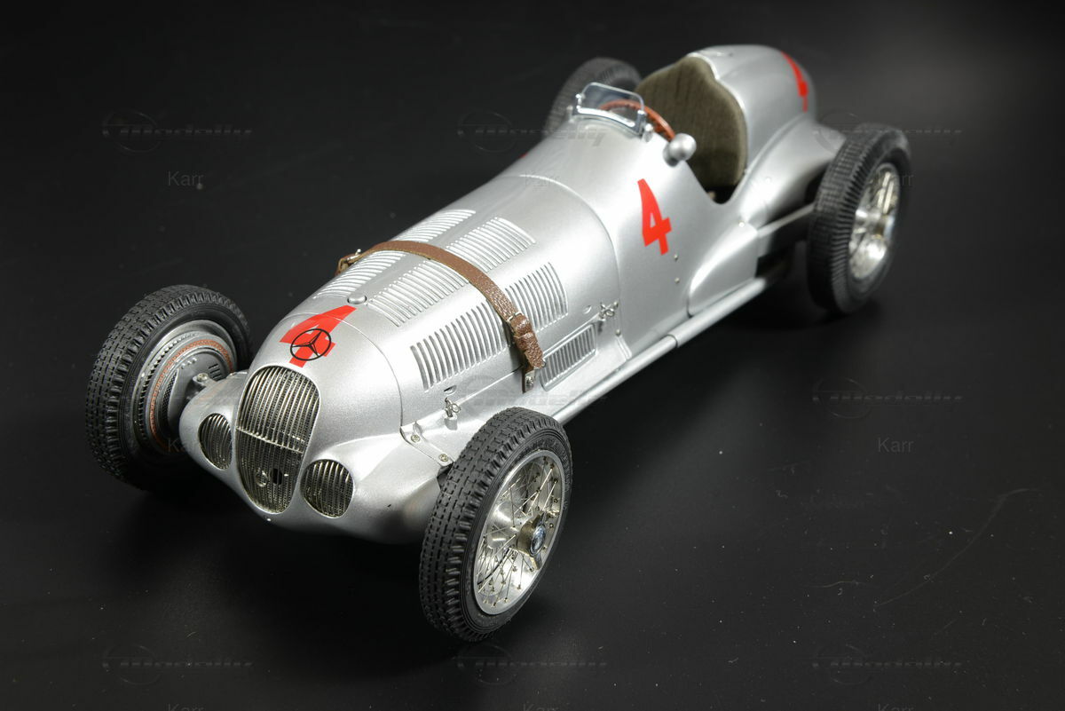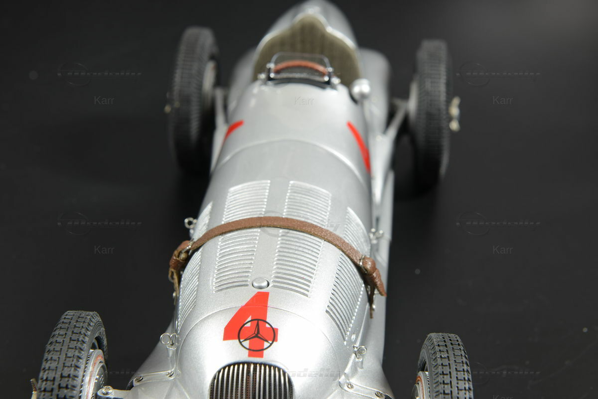 Diese detailgetreue Nachbildung des Mercedes-Benz W125 im Maßstab 1:18 ist ein Modellauto, das von CMC produziert wurde. Hergestellt auf Basis von Diecast-Material, besticht das Modell durch seine authentische Darstellung sämtlicher Fahrzeugdetails. Die Liebe zum Detail ist bemerkenswert und spiegelt die Besonderheiten des Originalwagens akkurat wider. Jedes Element, vom markanten Kühlergrill bis hin zu den filigranen Speichenrädern, wurde sorgfältig nachgebildet. Besonderes Augenmerk liegt auch auf den roten Nummer 4-Beschriftungen, die dem Modell eine historische Authentizität verleihen.
