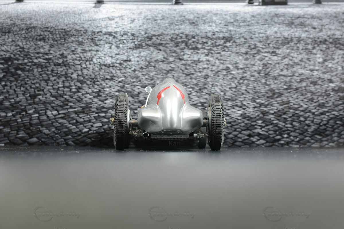 Das Modell des Mercedes-Benz W125 im Maßstab 1:18 präsentiert sich in einer silbernen Lackierung, die auch als "Silberpfeil" bekannt ist. Diese Sonderlackierung, die ohne jegliche Sponsorenaufdrucke auskommt, unterstreicht das klassische und elegante Design des Wagens. Die breite Aluminiumkarosserie mit den Belüftungsschlitzen und der befestigte Lederriemen über den Motorhaubenbereich verleihen der Miniatur ein authentisches Aussehen. Das Interieur des Modells zeigt ein lenkbares Lenkrad aus Holz und detaillierte Armaturen – eine Hommage an die Originalausstattung des historischen Rennfahrzeugs.