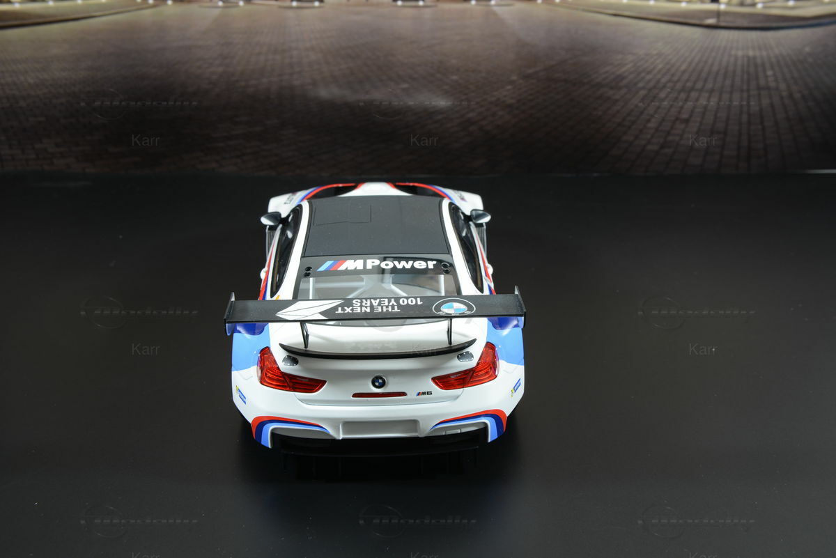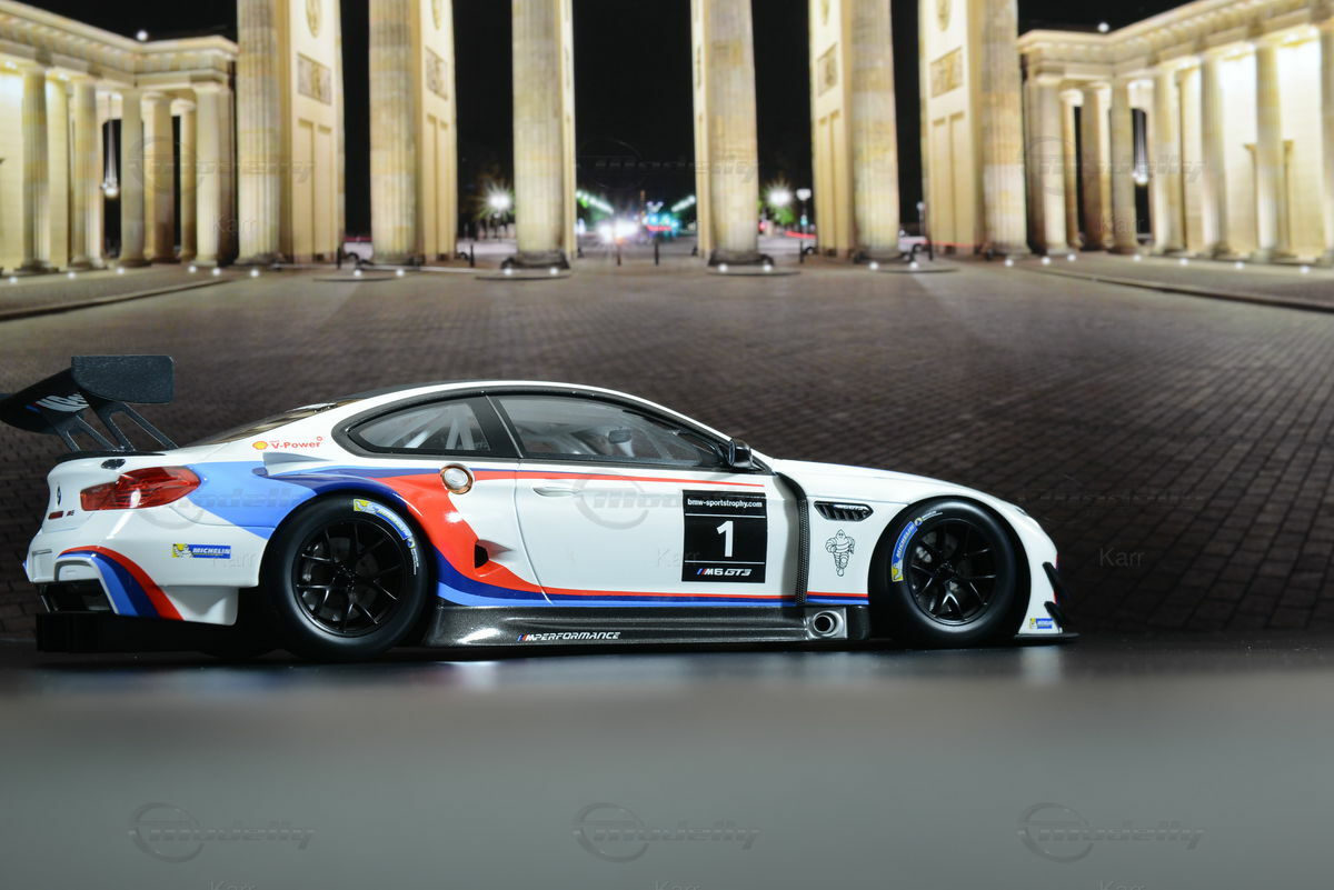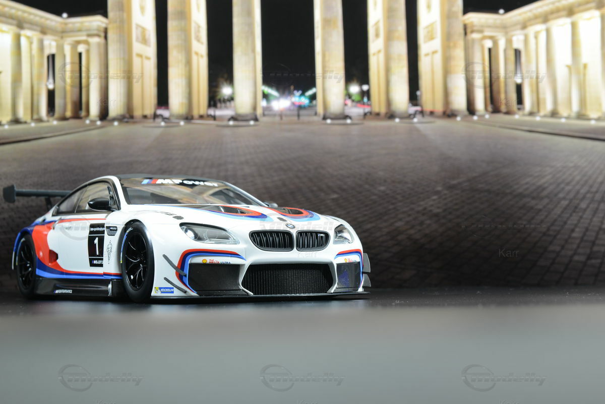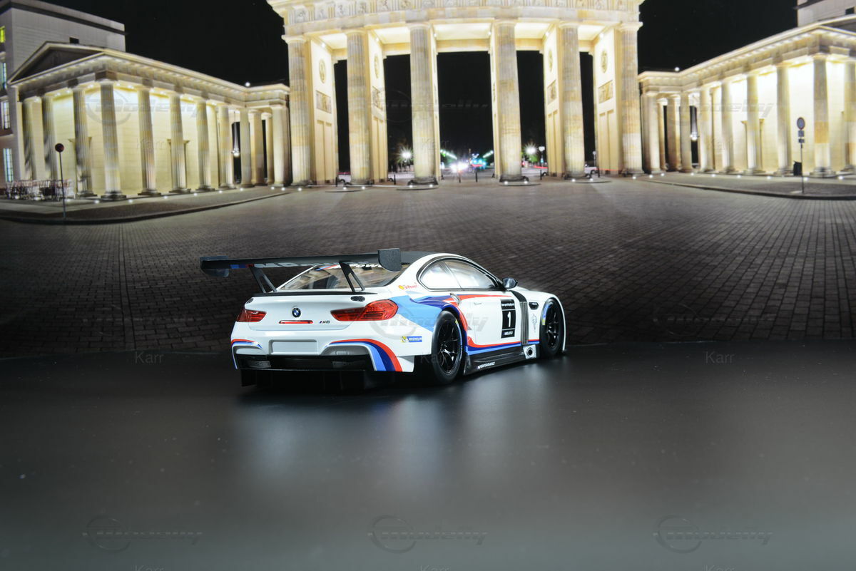 Das 1:18 Modellauto von Kyosho, das auf dem BMW M6 GT3 (F13) basiert, besticht durch eine exakte Nachbildung der charakteristischen Lackierung und Details des Originals. Das Modellauto, das aus Resin gefertigt ist, spiegelt die lebhaften Farben und das aerodynamische Design des Rennwagens perfekt wider. Die weiße Grundfarbe wird durch die typischen BMW M Sport Streifen in Blau, Rot und Dunkelrot ergänzt. Das Modell verfügt über präzise Repliken der Sponsorenlogos, darunter Michelin und Shell. Jede Kontur und jede Form des Originals wurde mit größter Sorgfalt nachgebildet, was zu einer atemberaubenden Detailtreue führt, die Sammler weltweit schätzen.