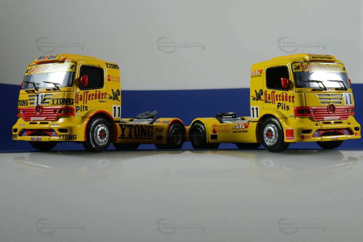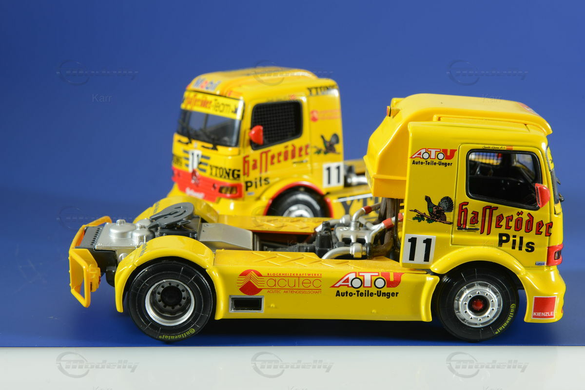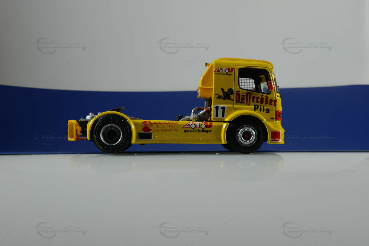 Der Mercedes-Benz Renntruck Hasseröder Pils ist ein bemerkenswertes Schmuckstück im Bereich des Automobilsports. Der Originaltruck wurde in den Jahren 1996 bis 1998 produziert und gehört zur Actros Generation. Bekannt für seine Zuverlässigkeit und seine außergewöhnliche Leistung auf der Rennstrecke, wurde dieser Truck schnell zu einem Symbol der Stärke und Innovation. Entwickelt von dem Team um Heinz-Werner Schmidt und Bernhard Bihr, wurde der Renntruck konstruiert, um extremen Belastungen standzuhalten und hohe Geschwindigkeiten zu erreichen. Der Vorgänger des Actros war der Mercedes-Benz SK, ebenfalls eine erfolgreiche Lkw-Serie im Motorsport.