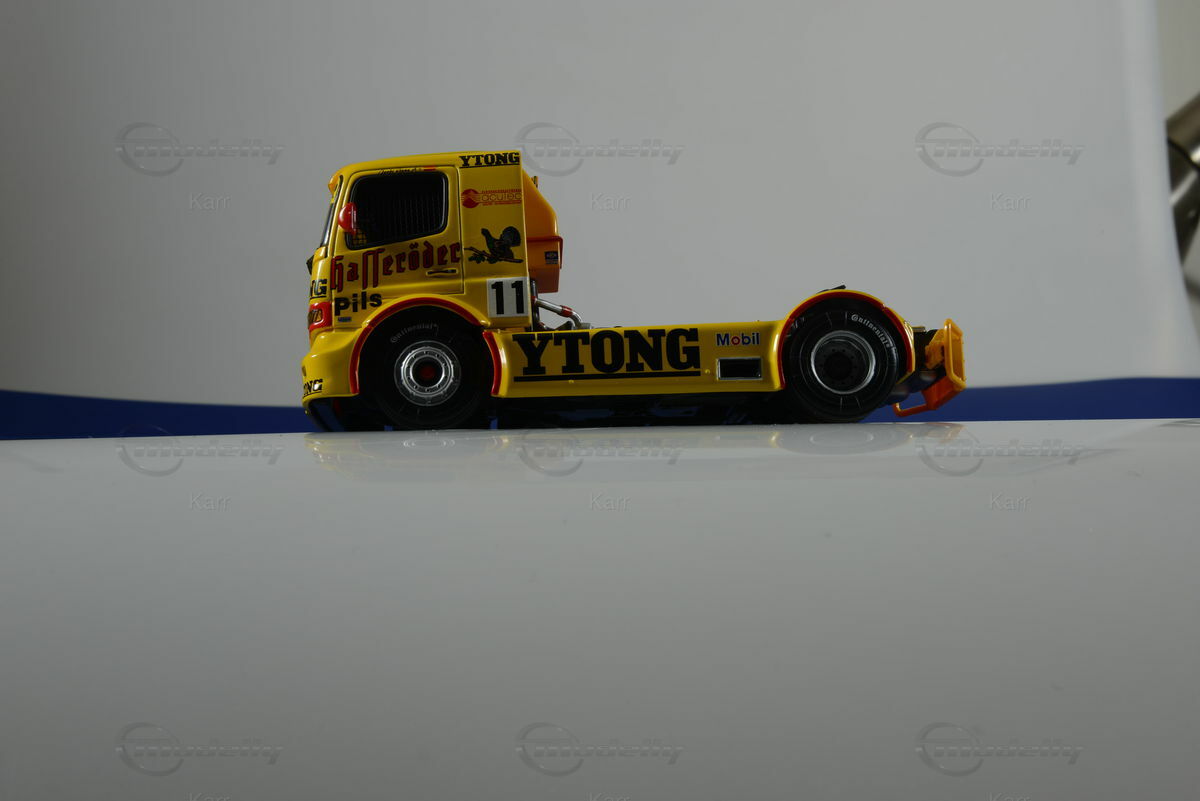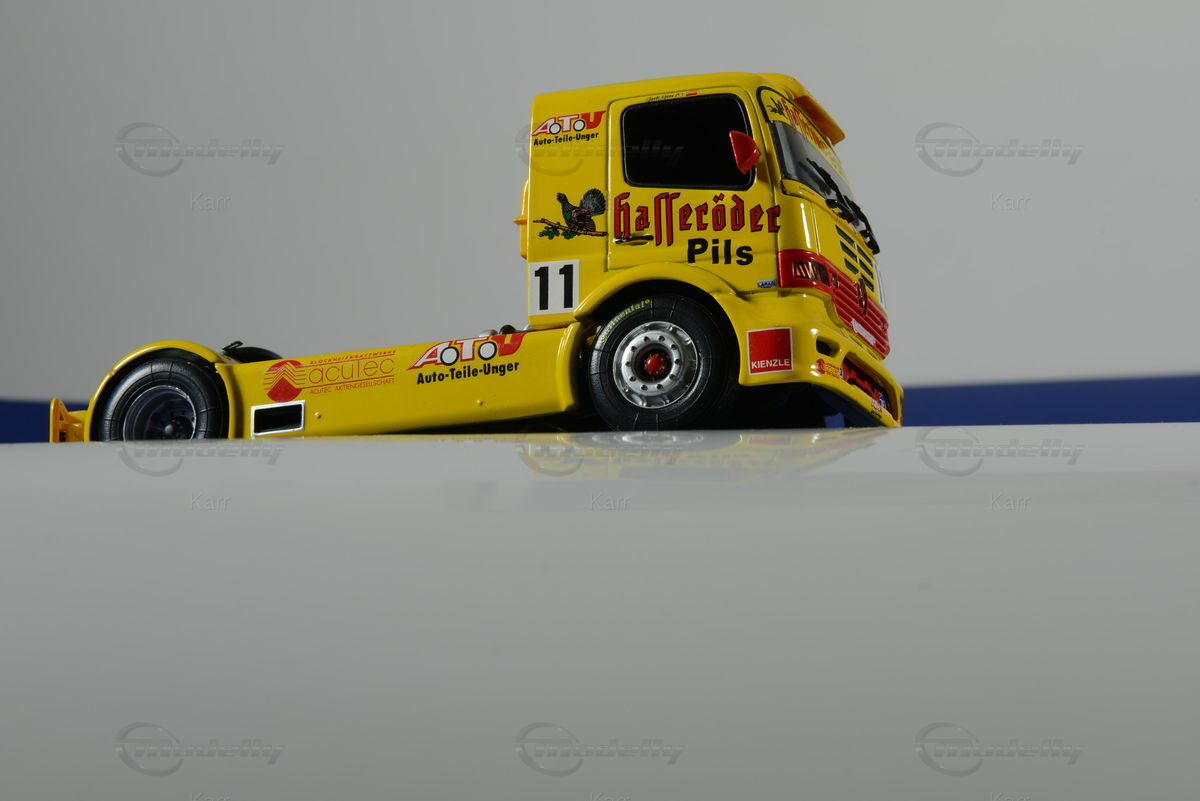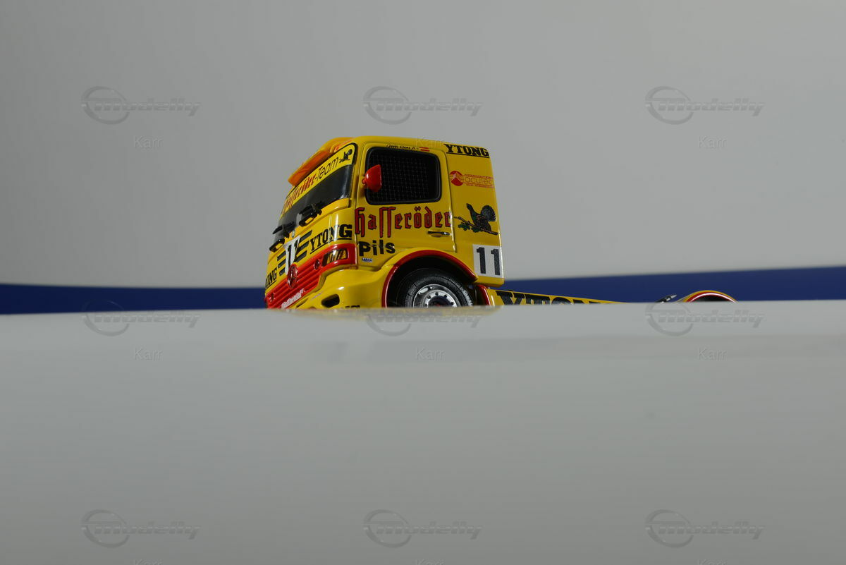 Der hergestellte Modelltruck im Maßstab 1:50 von Pauls Modell Art / Minichamps repräsentiert den Mercedes-Benz Renntruck Hasseröder Pils in eindrucksvoller Weise. Dieses Modell, das aus Resin gefertigt ist, stellt eine präzise Miniatur des Originaltrucks dar und zeigt feinste Details, die unter Sammlern sehr geschätzt werden. Das leuchtend gelbe Chassis mit den markanten roten und schwarzen Akzenten ist auf den ersten Blick erkennbar. Die detaillierte Nachbildung der Frontpartie, einschließlich Kühlergrill sowie der präzise dargestellten Scheinwerfer und Sponsoren-Logos, ist ein Beispiel für die hohe Qualität von Pauls Modell Art / Minichamps. Zu den sichtbaren Sponsorendekoren auf dem Modell gehören Hasseröder Pils, Ytong, Mobil und A.T.U..