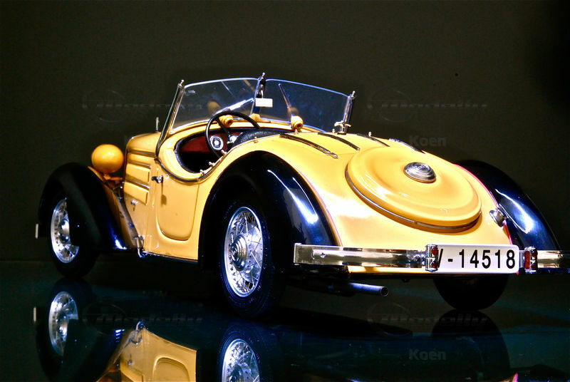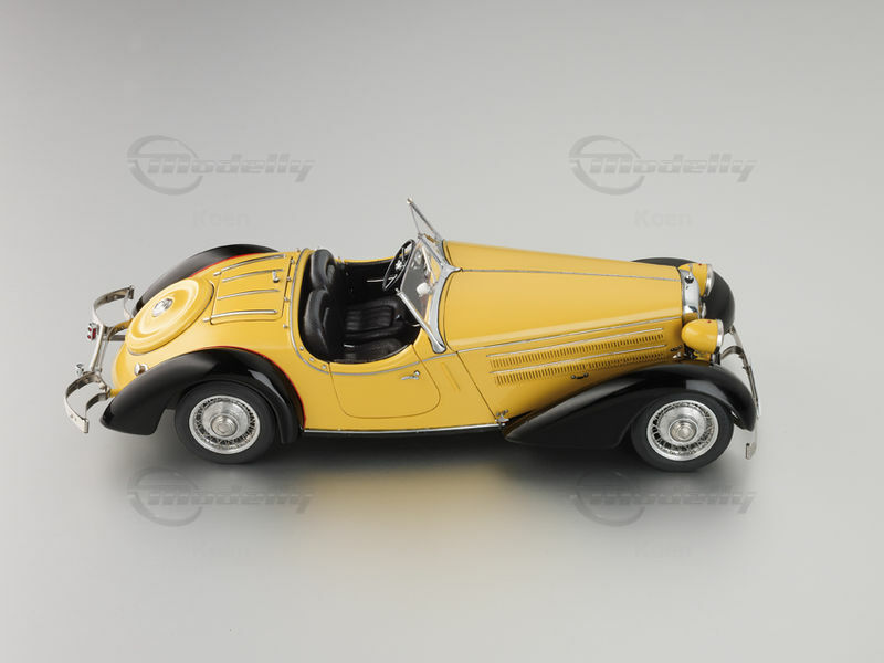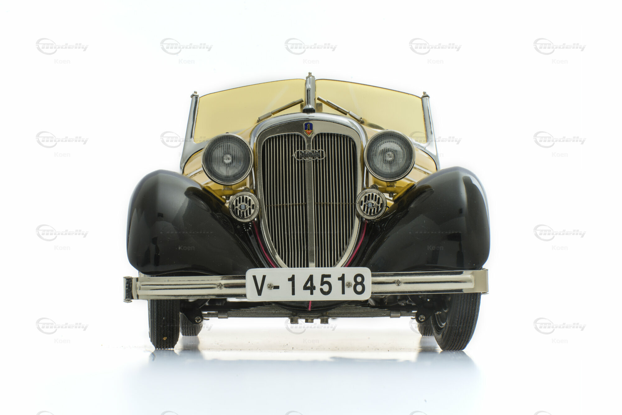Das hier dargestellte Modellauto im Maßstab 1:18 von CMC zeigt die strahlende Schönheit des Originals. Die Verarbeitungsqualität lässt keine Wünsche offen, die Details sind präzise und exquisit ausgearbeitet. Zu den sichtbaren Merkmalen gehören die beiden großen, runden Scheinwerfer und der prächtige verchromte Kühlergrill mit dem prominent platzierten Audi-Emblem. Die Außenspiegel, Stoßstangen und die gesamte Karosserie sind in einer glänzenden Zweifarblackierung gestaltet - eine Kombination aus Schwarz und Gelb, die dem Fahrzeug einen eleganten und gleichzeitig auffälligen Auftritt verleiht. Die gelbe Farbgebung des Windschutzglases trägt zusätzlich zum Charisma des Modells bei.