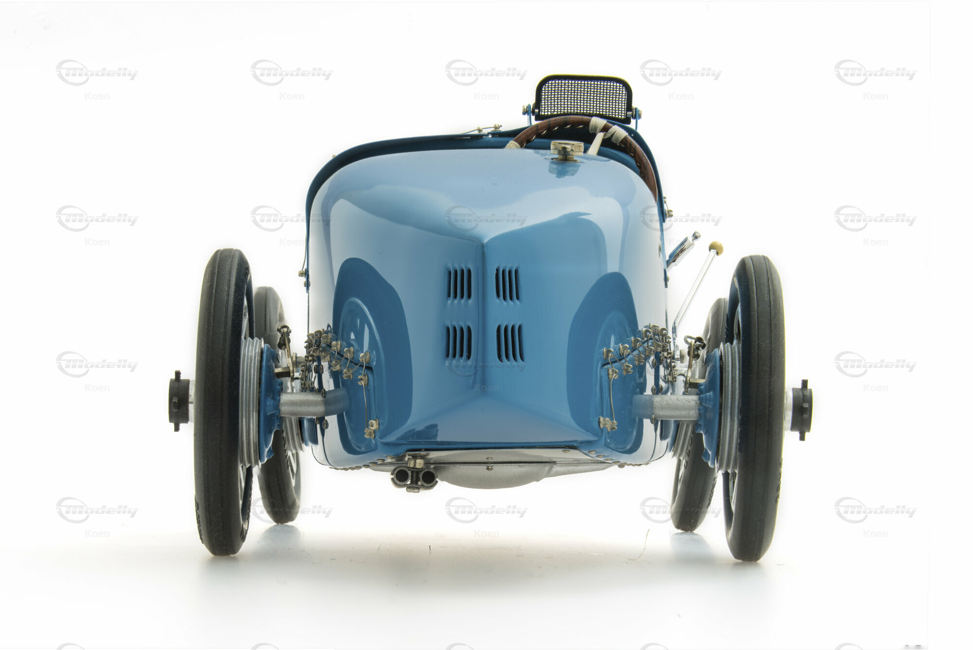 An die maßstabgetreu geformte Karosserie sind ein außenliegender beweglicher Schalt- und ein Handbremshebel intergriert. Der Handbremshebel betätigt über Stahldrahtseilzüge die beweglichen Hinterradbremsbänder.