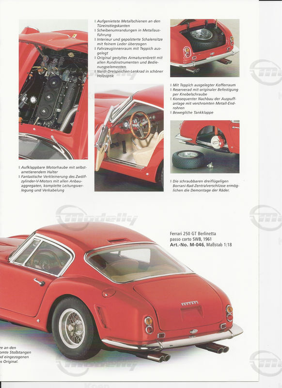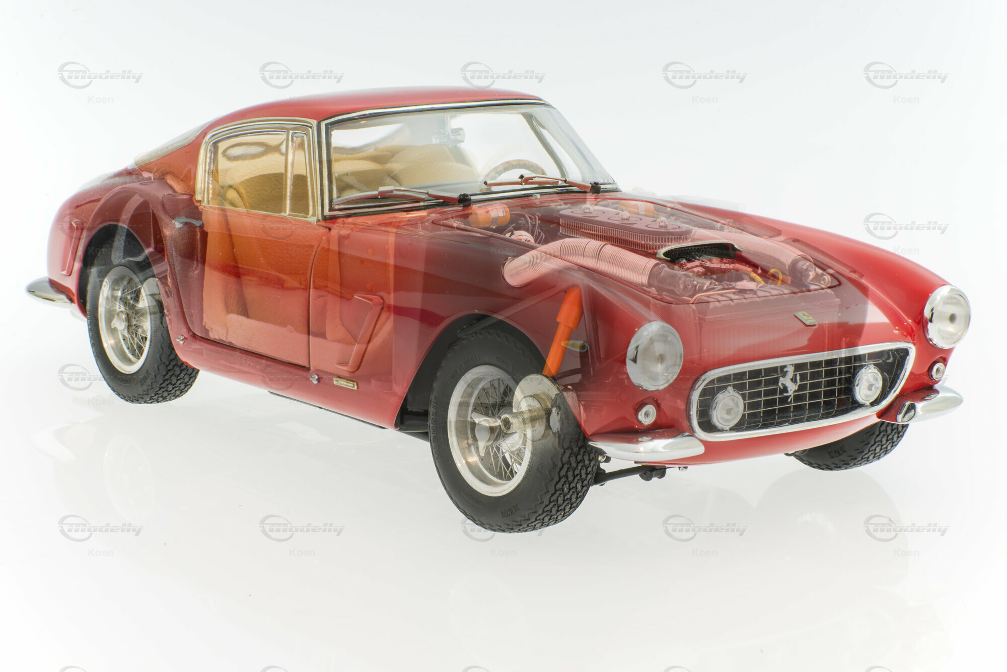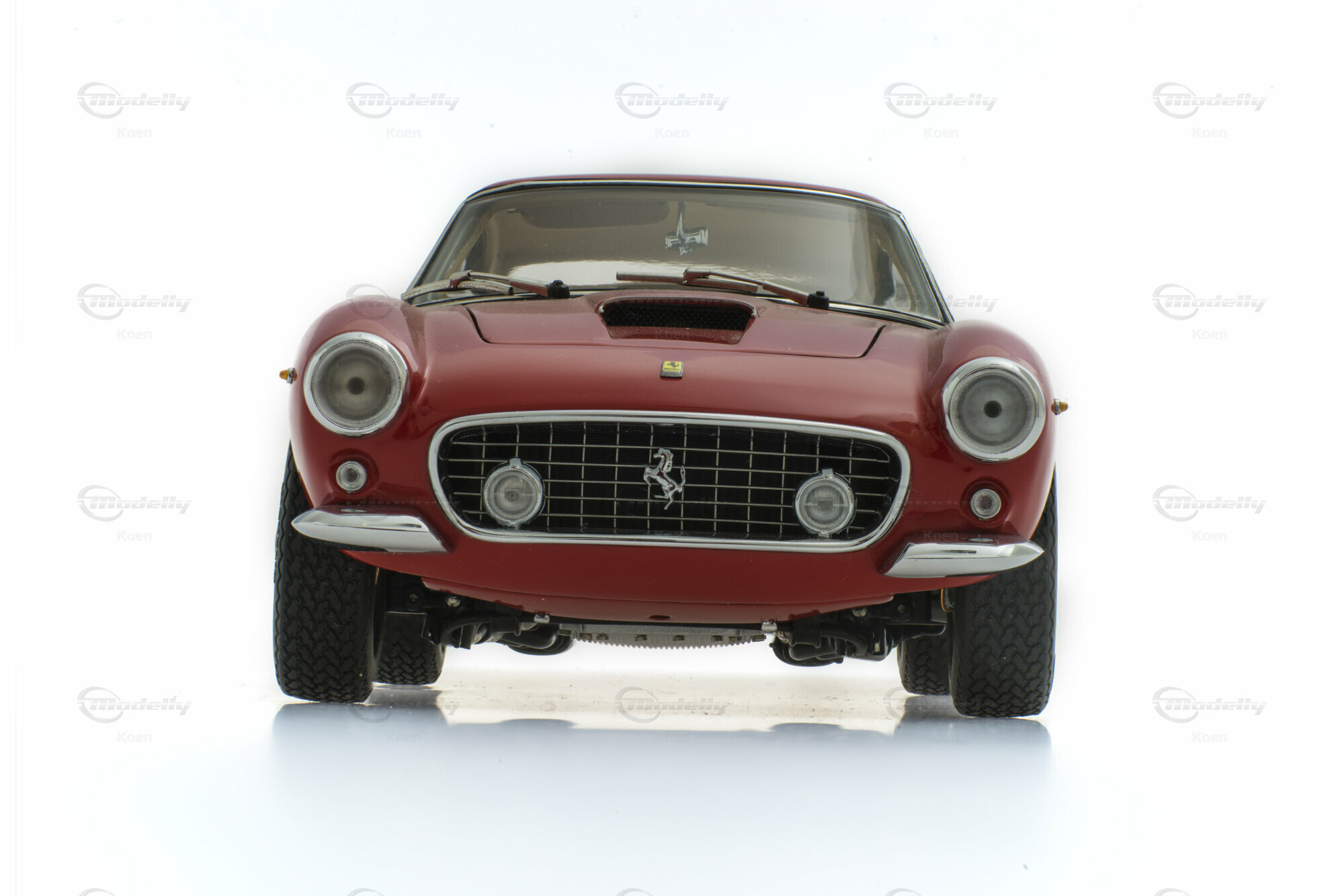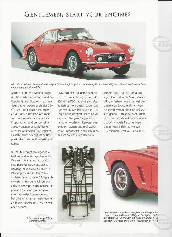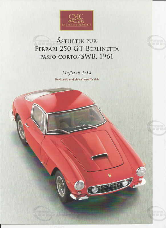 CMC hat sich für den Nachbau der Luxusausführung (Lusso) der 250 GT SWB-Straßenversion des Baujahres 1961 entschieden. Das Ganzmetall-Modell wird aus 1.141 Teilen handmontiert. Jedes Detail der vom Designer Sergio Pininfarina entworfenen Karosserie ist akribisch genau und maßstabsgetreu umgesezt. Natürlich kann sich im Modell auch der nach seinem Konstrukteur benannte legendäre Colombo-Zwölfzylinder-V-Motor sehen lassen. Er lässt den brüllenden Sound erahnen, den die zwölf Zylinder im Original von sich geben. Und so wünscht man sich, man könne auf dem Schalensitz des Modells Platz nehmen, um auf den Befehl zu warten "Gentlemen, start your engines".