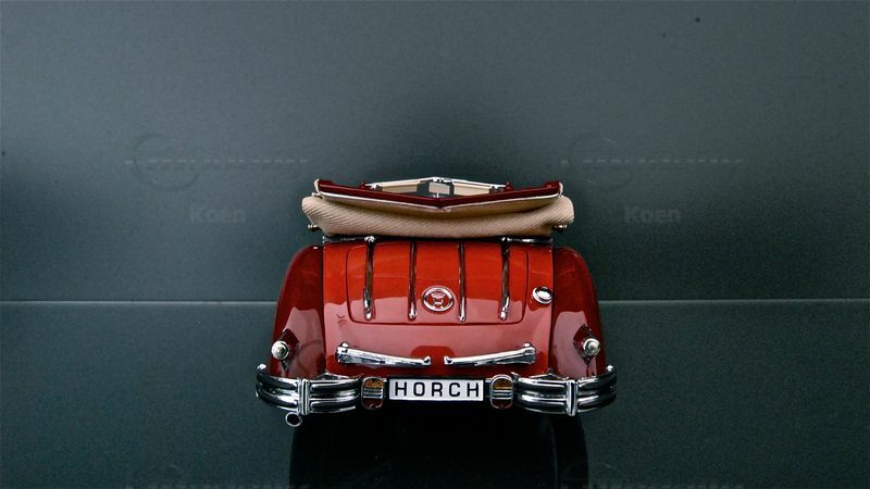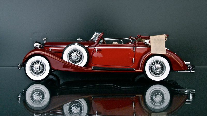 Den legendären Typ 853, damals ein exquisites Luxusfahrzeug hat CMC als geschlossenes oder offenes Cabriolet in rot und weinrot mit goldfarbener Zierlinie und handbemalten Weißwandreifen im Maßstab 1:24 nachgebaut - originalgetreu bis ins kleinste Detail.