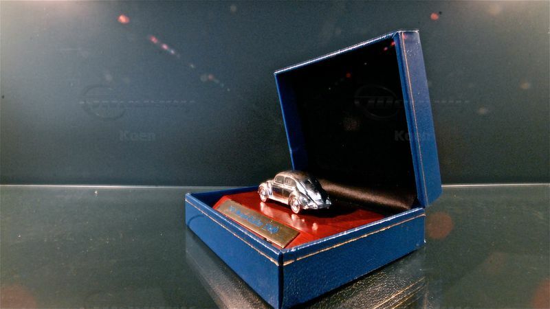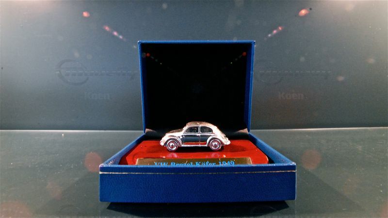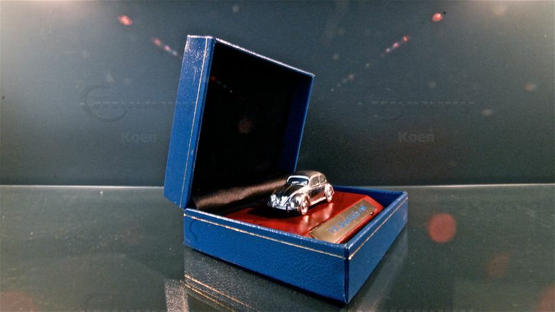 "VW Käfer, "Brezelkäfer" die-cast Modell M 1:87 in Vorbereitung. Versilbert, montiert auf Edelholzplatte. Liefertermin ab August 1996."
