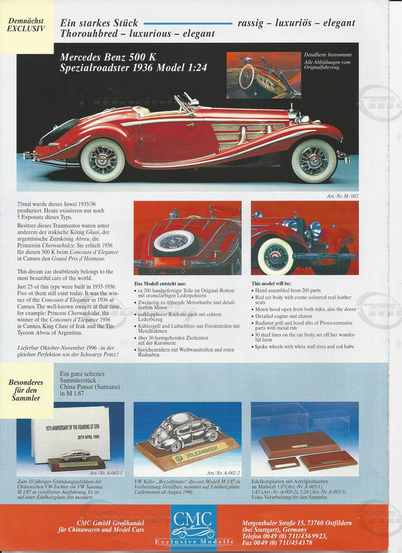 Diesen Katalog zeigt das Modell des Jahres 1995; Der schwarze Prinz und eine Neuankundigung für 1996: der MB Sportroadster 500 K in Rot.