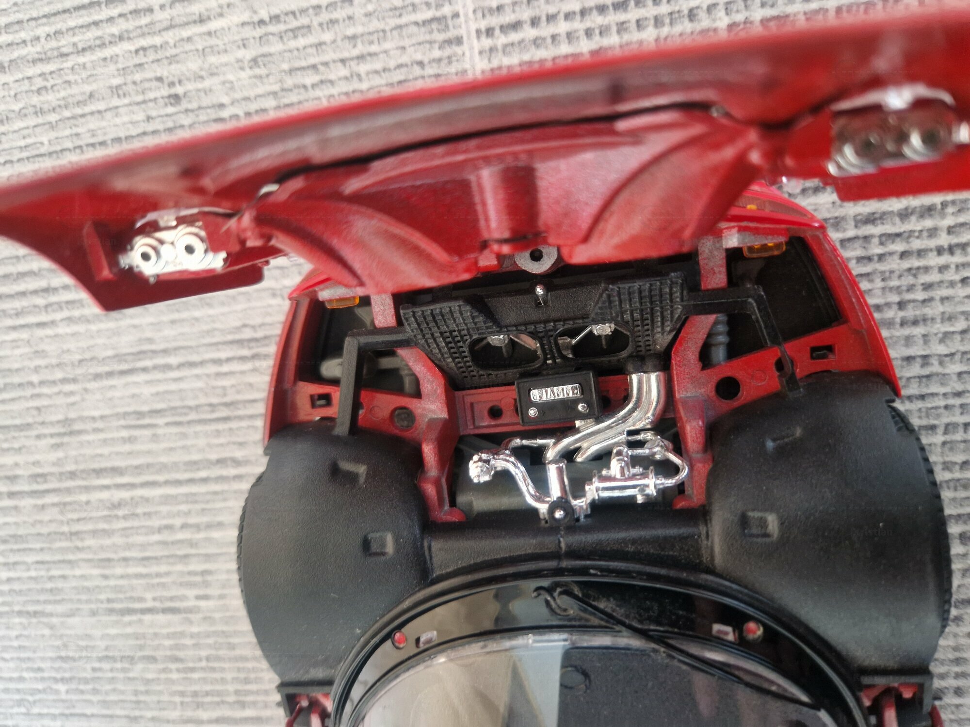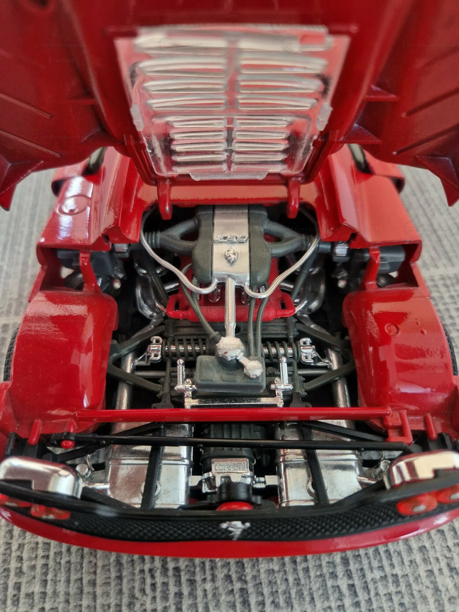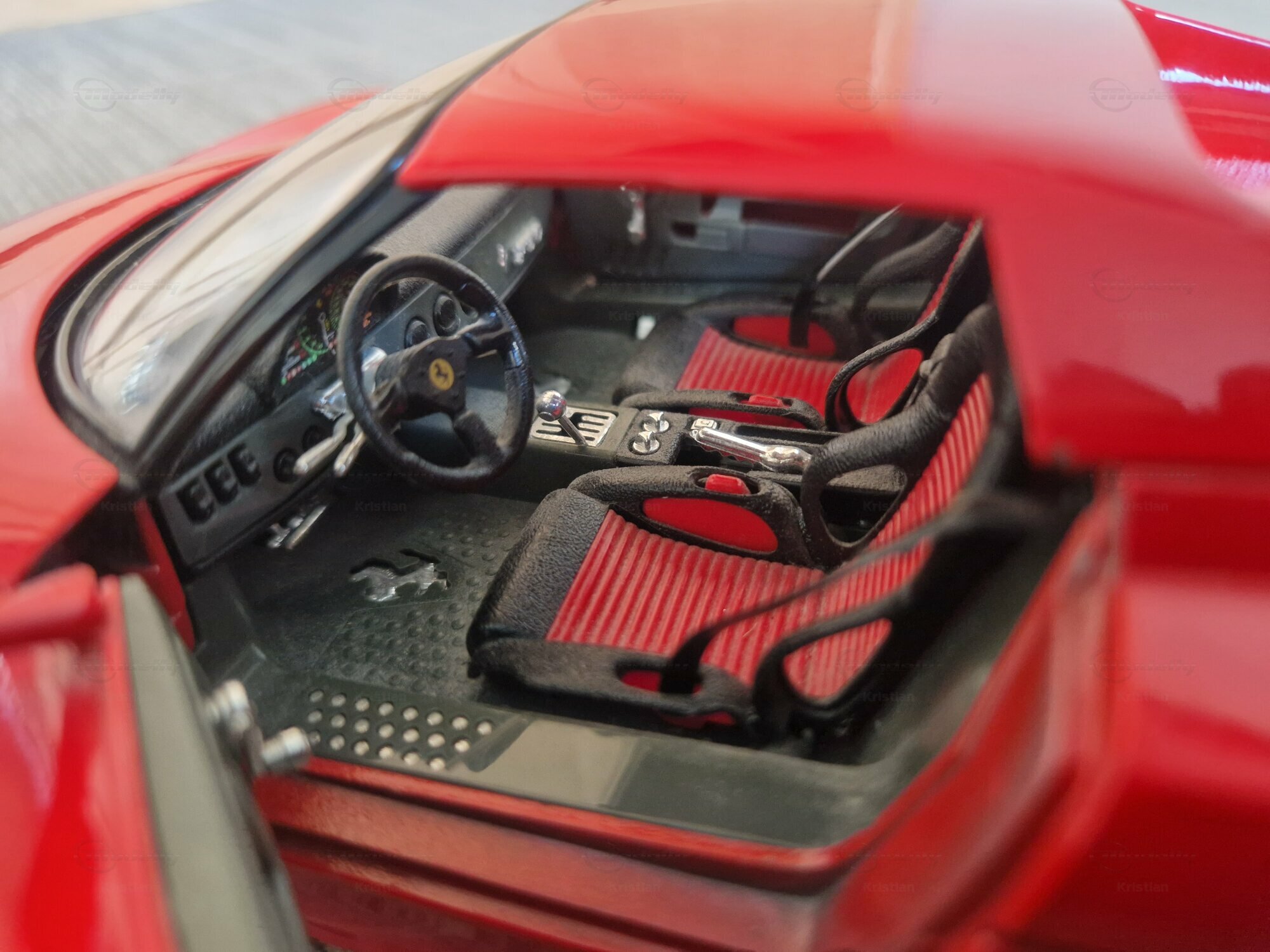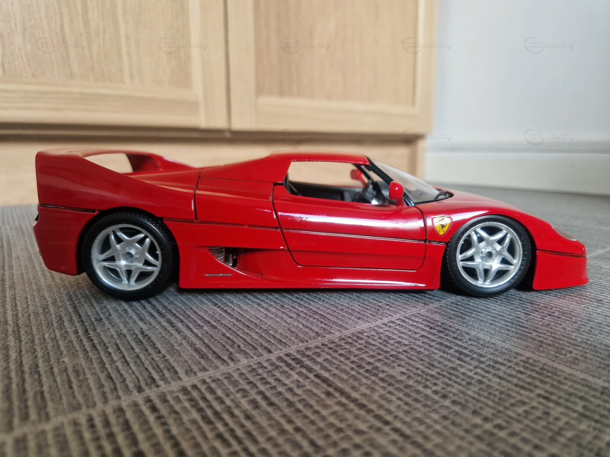Das hier vorgestellte Modell, das Teil der Sammlung von Modelly-Mitglied "Kristian" ist, ist ein 1:18-Maßstab-Nachbau des Ferrari F50, hergestellt von Bburago. Der Miniaturwagen ist aus einer Mischung von Materialien gefertigt, die Detailtreue und Langlebigkeit garantieren. Die Lackierung ist in einem klassischen Ferrari-Rot gehalten und trägt das berühmte Ferrari-Logo auf der Motorhaube sowie seitlich an den Flanken. Die Nachbildung zeigt präzise Details wie die aerodynamischen Linien, die Doppelstoßstange und die einzigartig geformten Scheinwerfer. Die Felgen scheinen sorgfältig reproduziert zu sein, obwohl der genaue Hersteller der Felgen nicht identifizierbar ist.