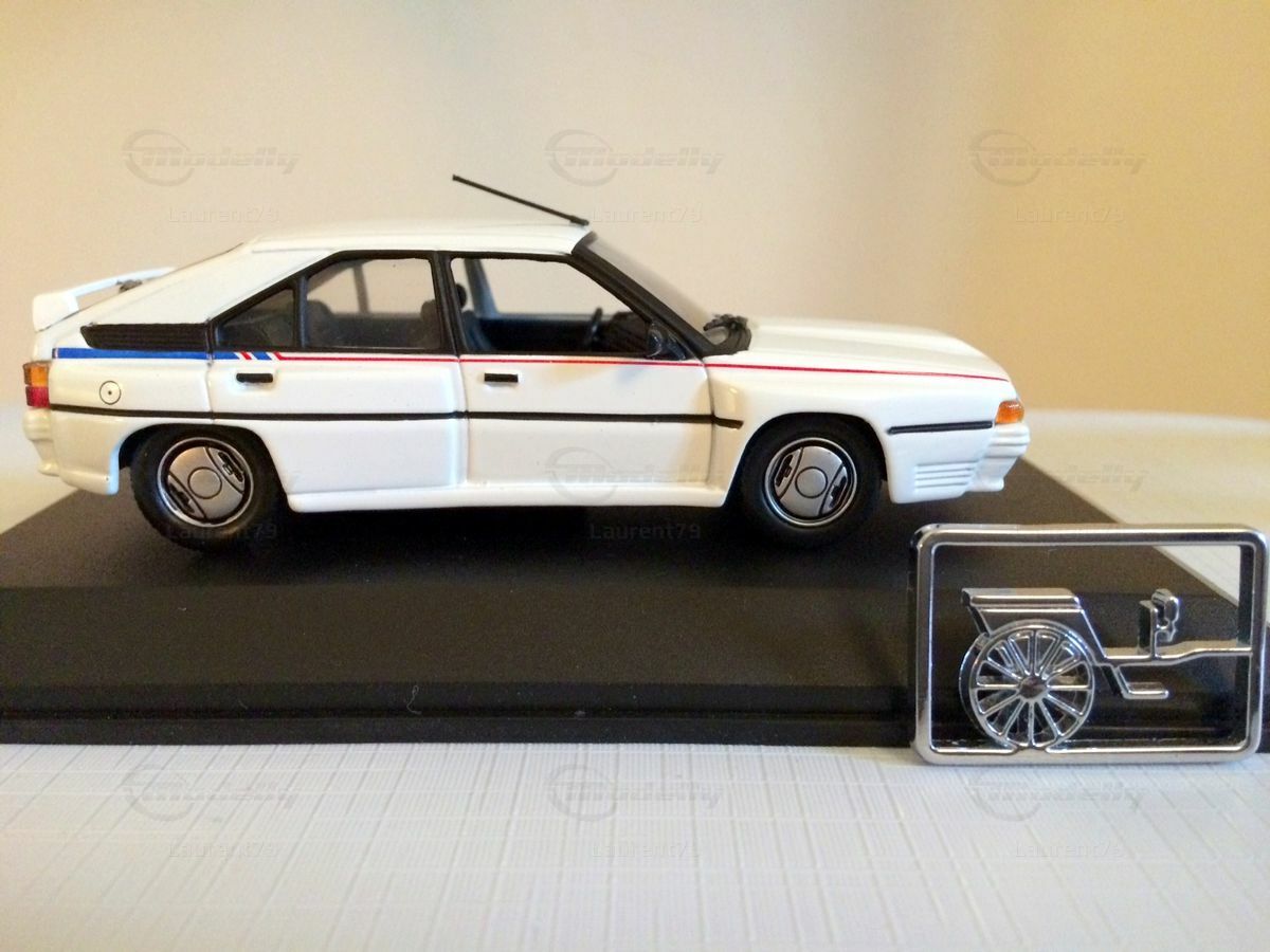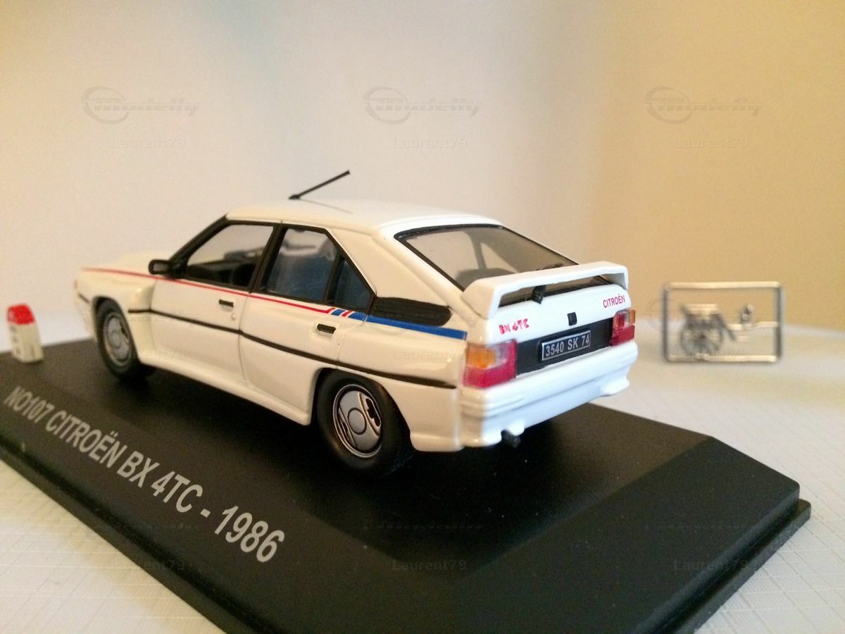 Die Lackierung des Modells sticht ebenfalls hervor. Es hat eine weiße Grundfarbe mit feinen roten und blauen Streifen, die sich über die Länge des Fahrzeugs ziehen. Diese Farbkombination erinnert stark an die Rennfarben des Originalfahrzeugs. Des Weiteren sind Details wie die Scheinwerfer, der Frontgrill und die Embleme des Herstellers präzise nachgebildet. Jede Kurve und Linie des Autos wurde sorgfältig reproduziert, um einen möglichst genauen Nachbau des Citroën BX 4TC zu schaffen.