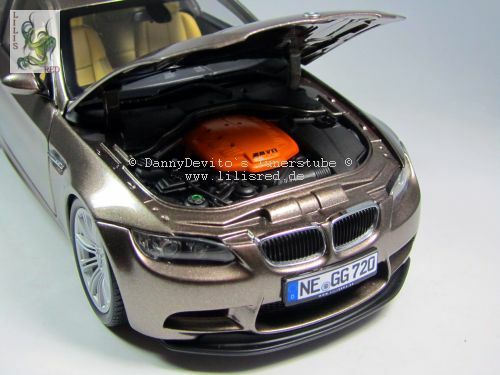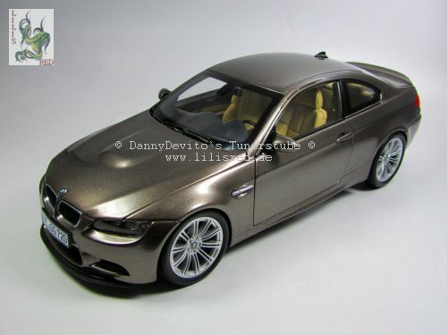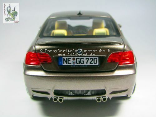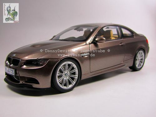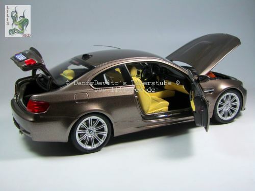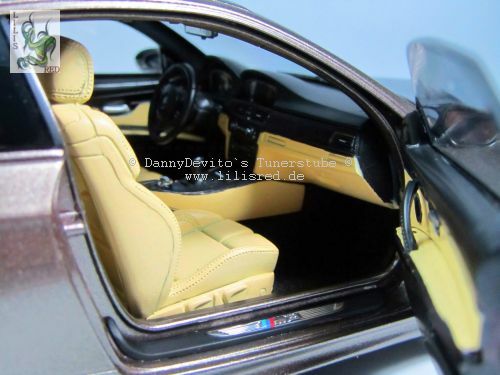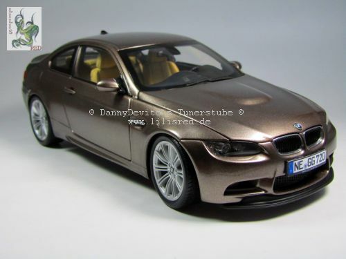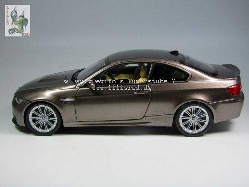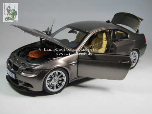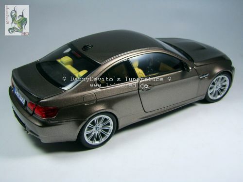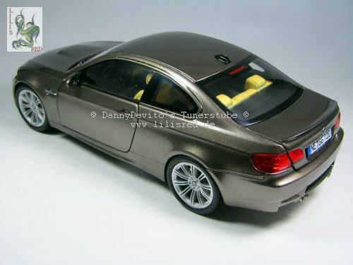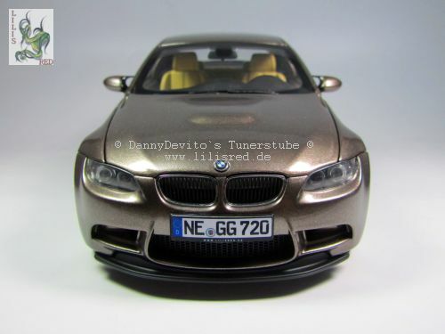 Die Fotos des modifizierten 1:18 Diecast-Modells des BMW M3 Coupé (E92) zeigen einen exzellenten Grad an Detailtreue und Handwerkskunst. Die Modifikation hebt die Metallic-Lackierung hervor, die in einem eleganten Braun-Ton gehalten ist, der nahtlos an den Stil und die Eleganz des Originals anknüpft. Auffallend sind auch die Felgen. Wenn sie von einem bestimmten Hersteller wie BC Forged stammen und das Modell BC-FF21 tragen, wäre dies ein erwähnenswertes Detail, das die Authentizität und Individualität des Modells weiter unterstreicht. Solche Felgen sind oft maßgeschneidert und tragen erheblich zur ästhetischen Anziehungskraft des Fahrzeugs bei. Zudem sind die feinen Konturen und Logos, einschließlich des unverkennbaren BMW-Emblems, präzise und akzentuiert angebracht. Dies sorgt für eine authentische Wiedergabe des Originals.
