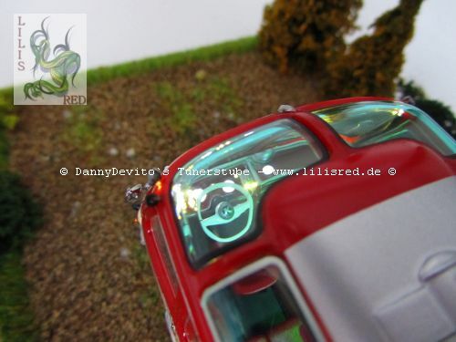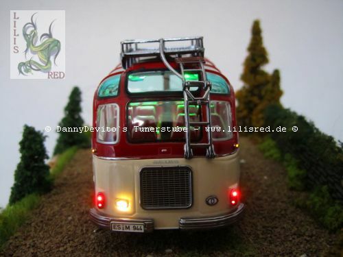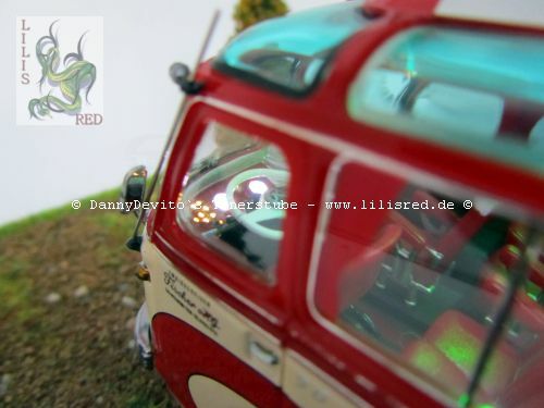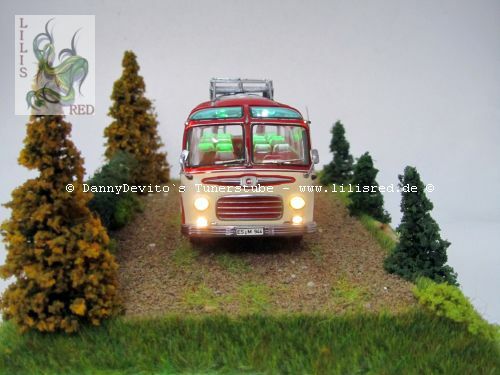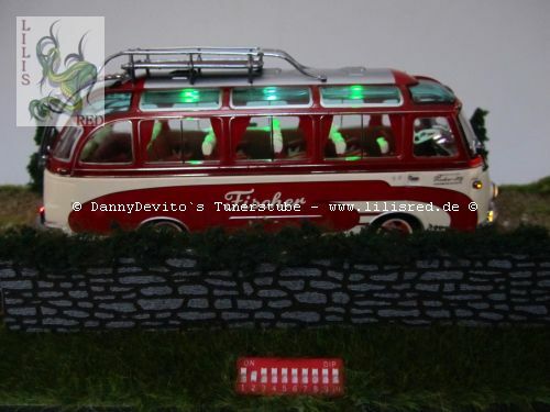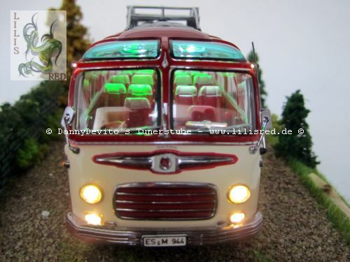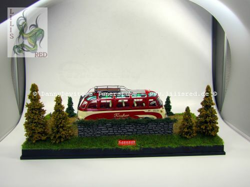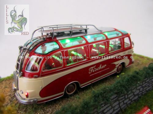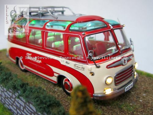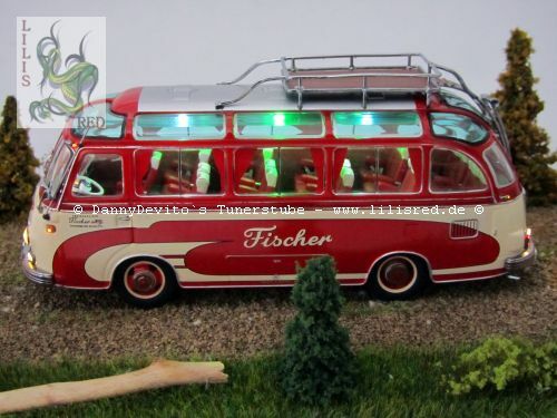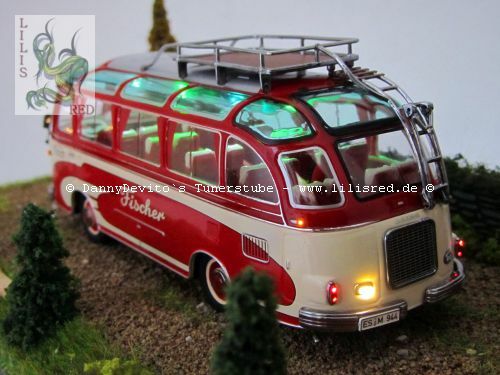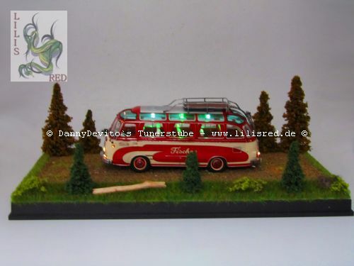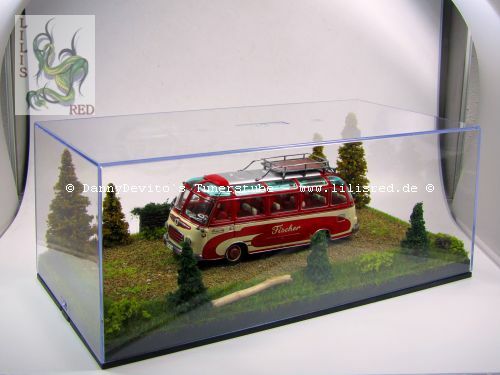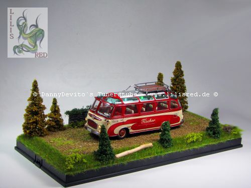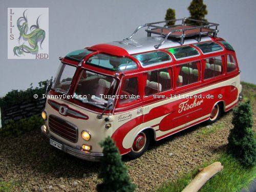 Das Modell aus der Sammlung von Lilisred zeigt eindrucksvolle Modifikationen, einschließlich einer individuellen Lackierung und zusätzlicher Elemente an der Karosserie. Die Lackierung kombiniert Rot- und Cremefarben, die in harmonischen Linien und Flächen verlaufen und das historische Design des originalen Kässbohrer Setra S6 ästhetisch einfangen. Besondere Aufkleber und Beschriftungen wie das "Fischer"-Logo auf den Seiten des Busses verleihen dem Modell eine authentische Note und machen es zu einem besonderen Sammlerstück. Des Weiteren sind auf dem Dach Gepäckträger montiert, die den Reisecharakter des Busses unterstreichen. Das Diorama, auf dem das Modell präsentiert wird, vermittelt dank der detaillierten Landschaftsgestaltung mit Bäumen und Wegen eine stimmungsvolle Szenerie, die die Schönheit und den historischen Wert des Modells zusätzlich betont.
