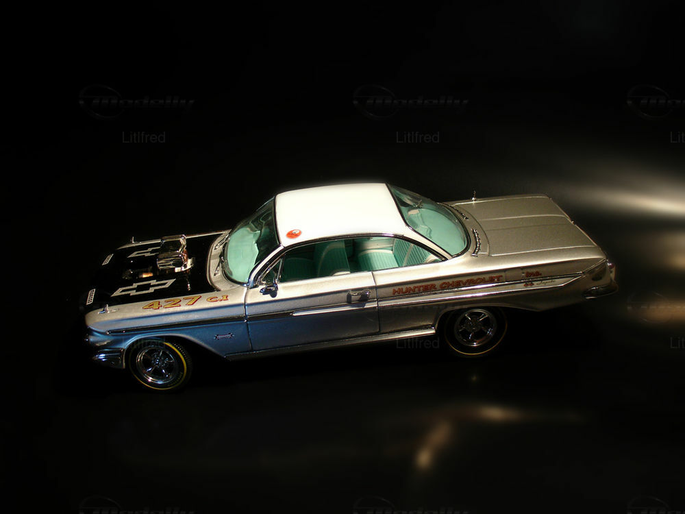 Das hier vorgestellte 1:18-Skalenmodell wurde von Sun Star gefertigt und stellt eine exquisite Nachbildung des Chevrolet Impala Sport dar. Es ist wichtig zu betonen, dass es sich bei dem Modell um eine 1:18-Skalennachbildung handelt, die von dem Modellbauer "Litlfred" modifiziert wurde und somit nicht das ursprünglich von Sun Star produzierte Produkt vollständig wiedergibt. Dieses Modell besticht durch eine Reihe bemerkenswerter Details, darunter eine detailgetreue Lackierung in Metallic-Silber mit spezifischen Schriftzügen wie "Hunter Chevrolet" an den Seiten. Die verchromten Teile wie Kühlergrill und Stoßstangen sowie die Reifen und Felgen sind bemerkenswert genau nachgebildet.