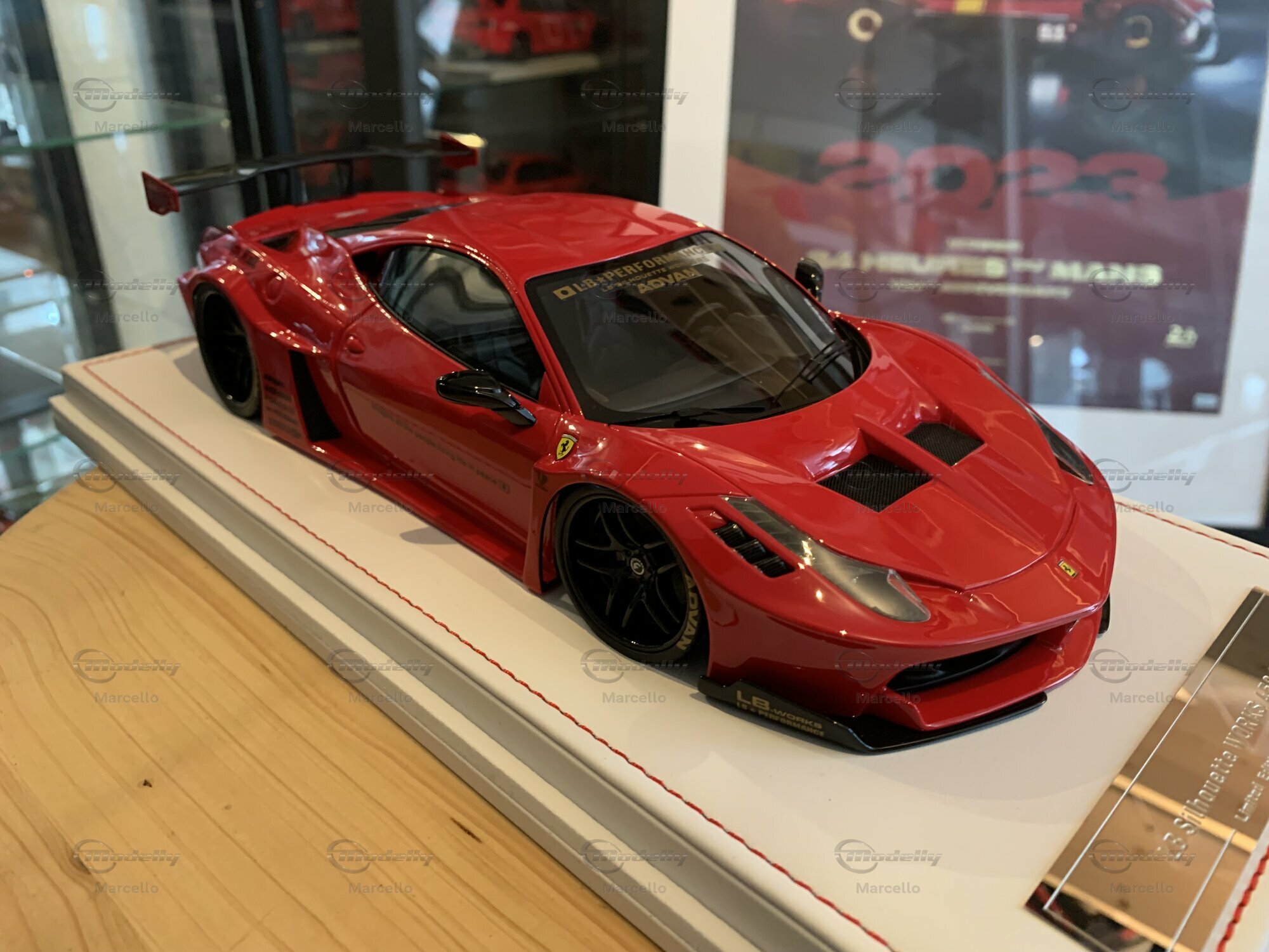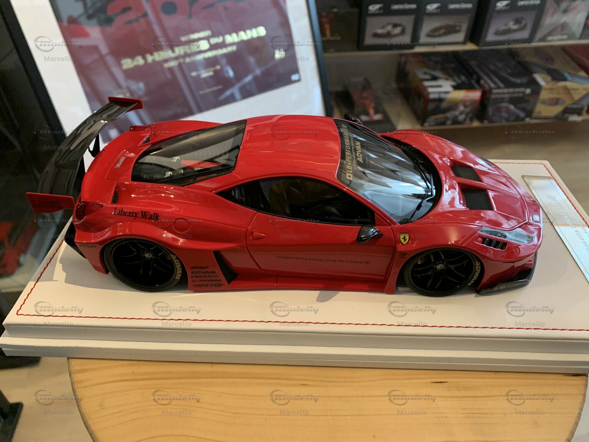 Das hier vorgestellte Modellauto ist eine detaillierte Replik des Ferrari 458 GT in der besonderen Ausführung von Liberty Walk. Hergestellt von IVY Models, ist dieses Modell im 1:18 Maßstab gehalten. Es besteht aus hochwertigem Resin, das besonders feine Details ermöglicht und eine hohe Widerstandsfähigkeit aufweist. Dieses Modellauto ist eine limitierte Edition und nur einer von 50 weltweit gefertigten Einheiten. Die hochwertige Verarbeitung ist leicht zu erkennen: Feine Details wie die Lüftungsöffnungen auf der Motorhaube und die präzise Darstellung der Liberty Walk-typischen, verbreiterten Kotflügel geben einen realistischen Einblick in die Besonderheiten des Originals.